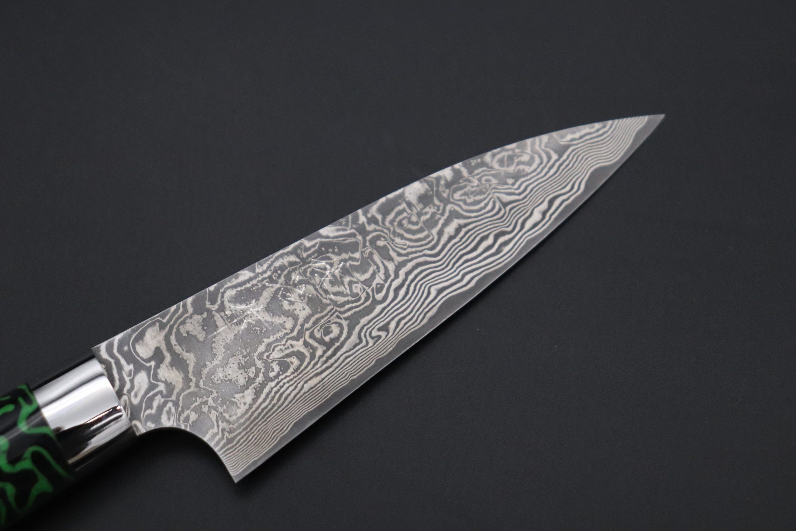 A dark R-2 Damascus blade, which features a crisp and vigorous Damascus pattern, the energetic style of the Damascus blade. It is handcrafted using a complex series of forging processes and undergoes a specially formulated acid etching process.
