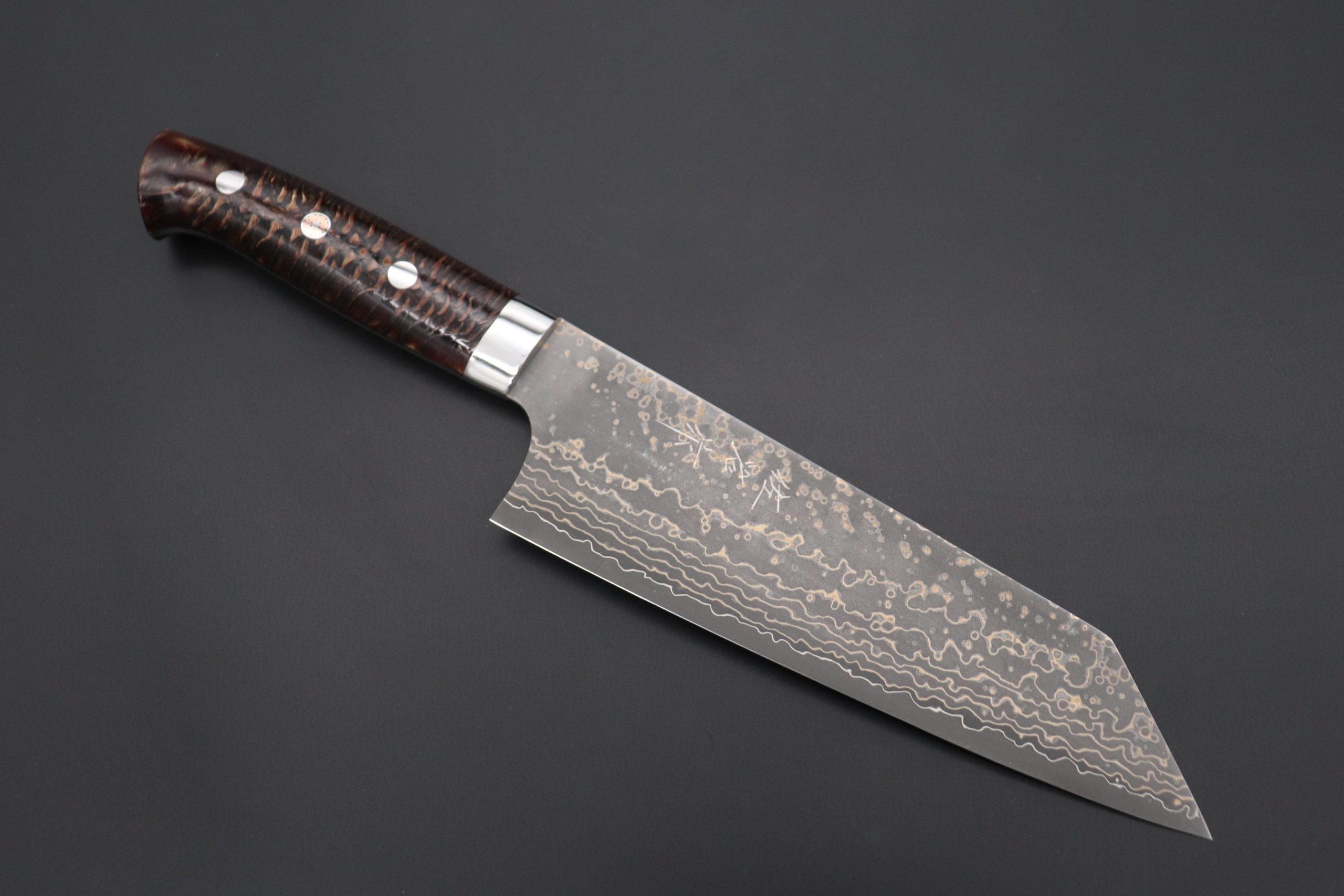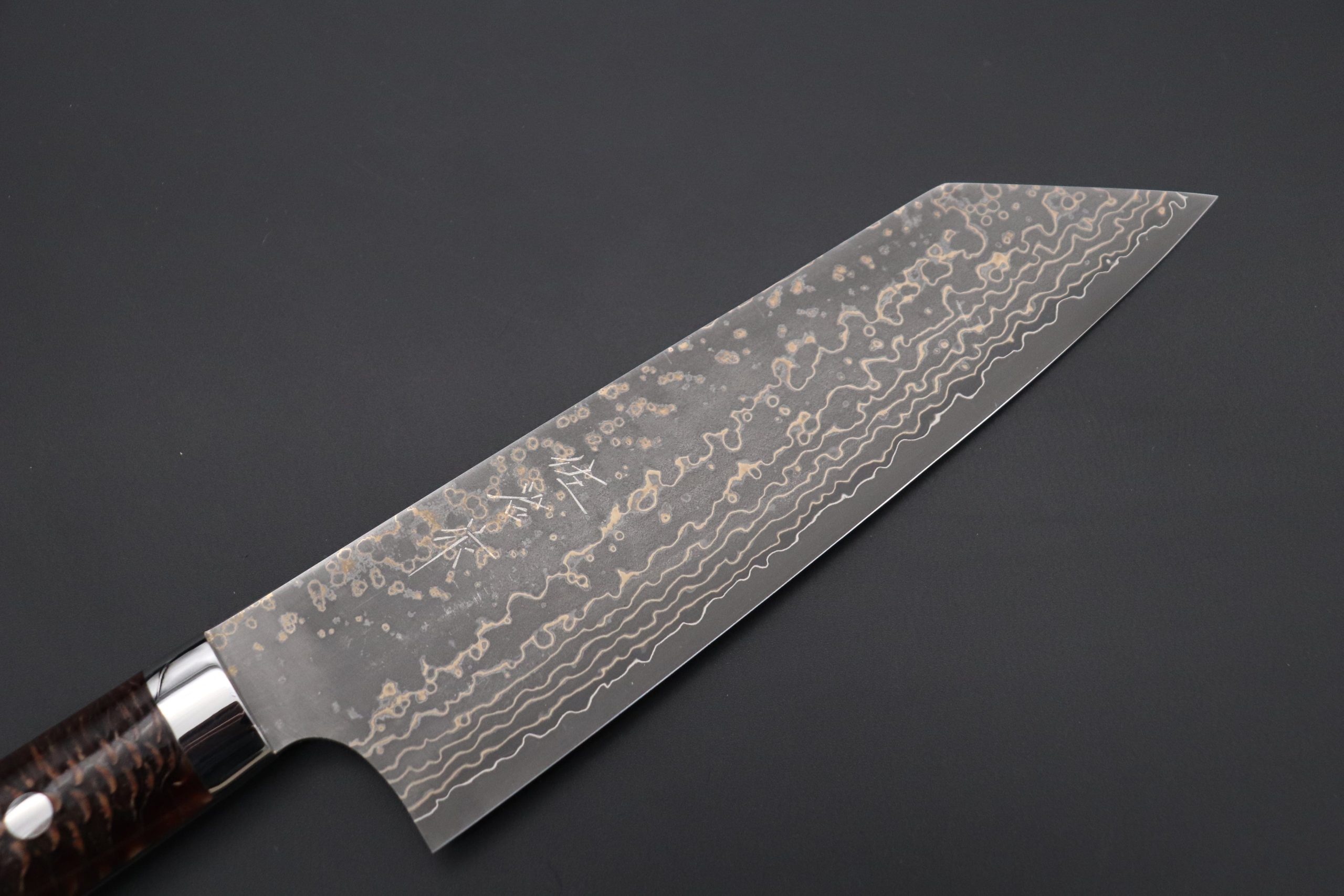 Takeshi Saji is a very well respected Master Smith, who specializes in making traditional hammer forged Japanese knives. We are often surprised by the variety of ideas he has and the very distinctive materials and rare steel that he uses for his custom knives.