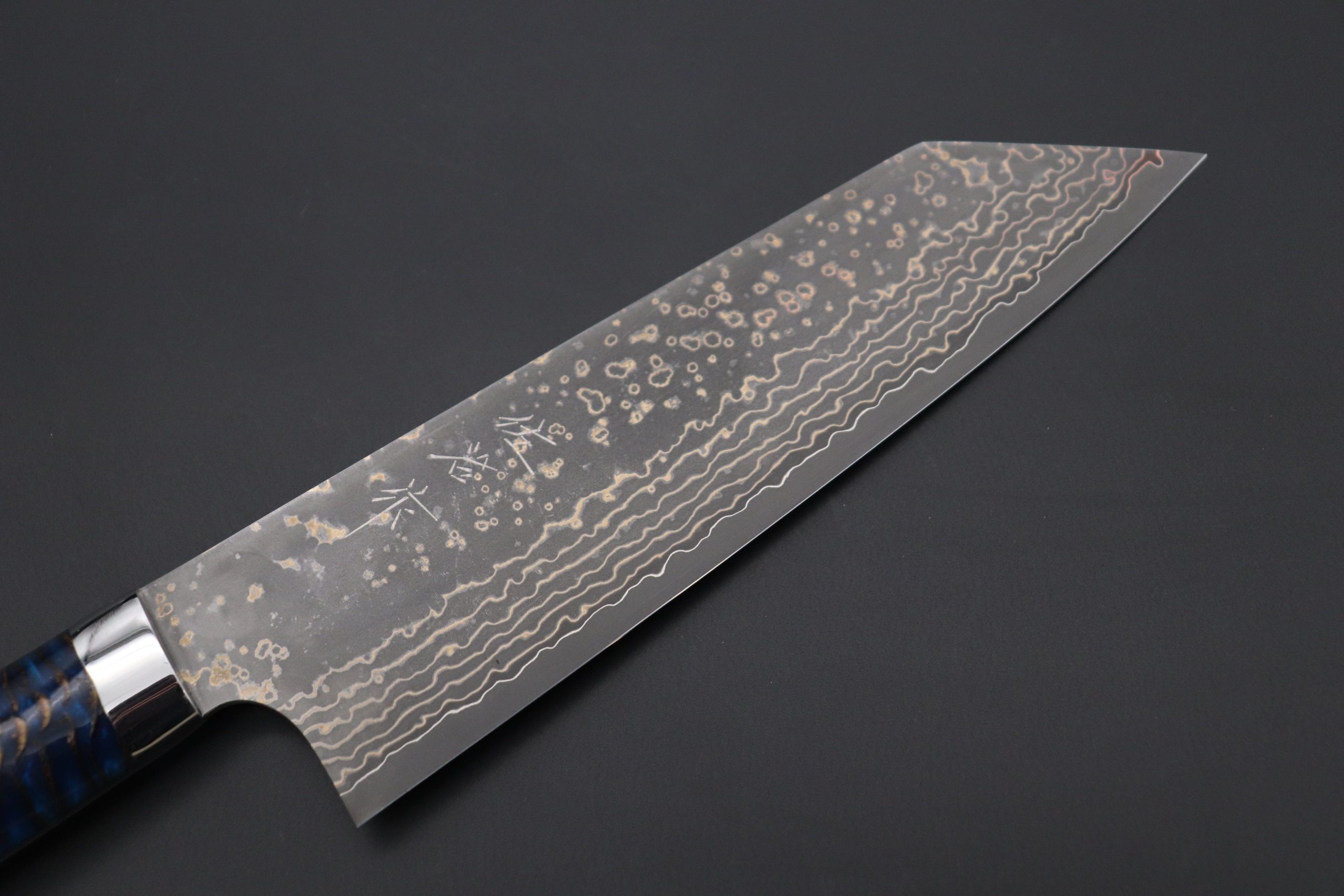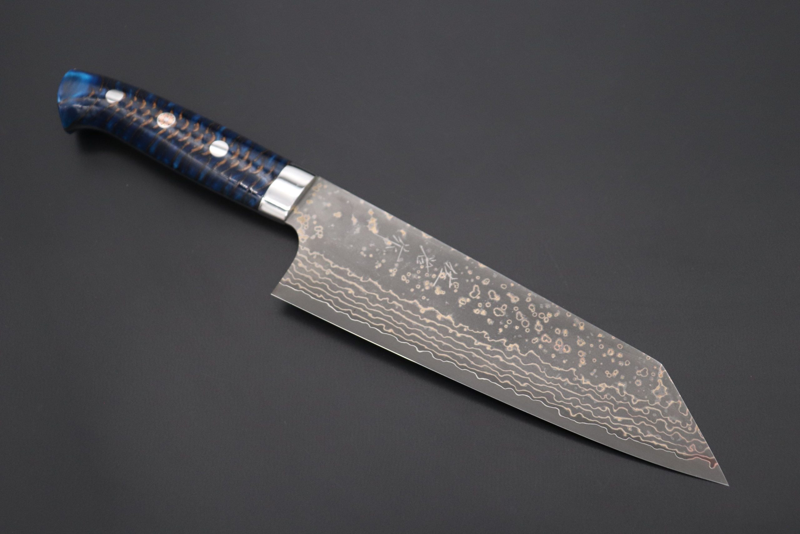 Master Saji has just completed a fresh new batch of traditional hammer forged custom kitchen knives that, once again, feature his unique multi-colored Damascus. The blades have a core of VG-10W Cobalt-Tungsten Stainless steel (HR.c 61 to 62), which has been clad with multiple layers of rust-resistant stainless steel, brass and copper.