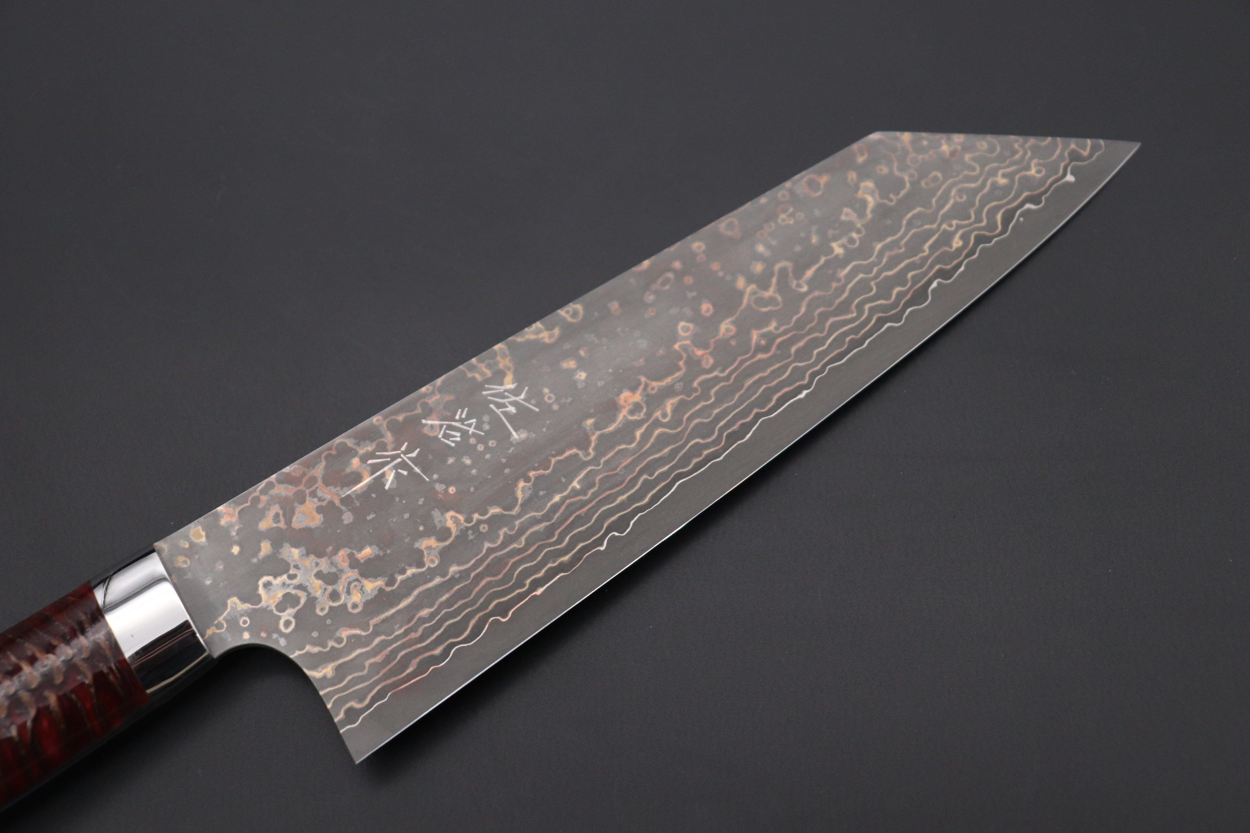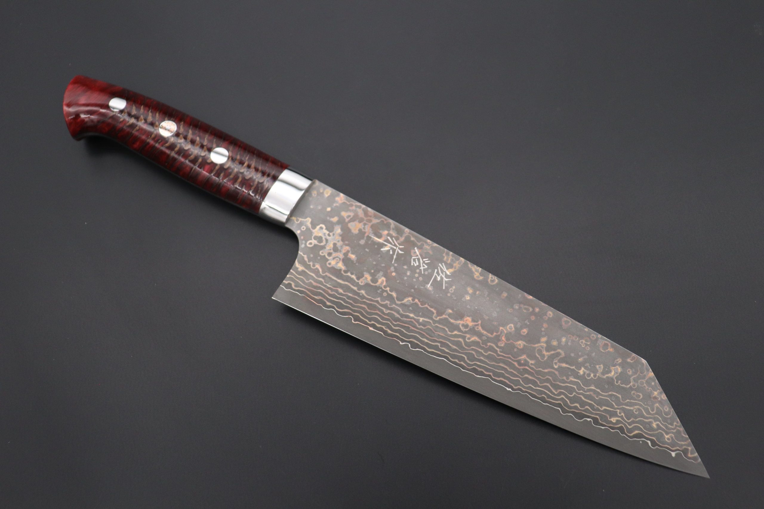 Master Saji has just completed a fresh new batch of traditional hammer forged custom kitchen knives that, once again, feature his unique multi-colored Damascus. The blades have a core of VG-10W Cobalt-Tungsten Stainless steel (HR.c 61 to 62), which has been clad with multiple layers of rust-resistant stainless steel, brass and copper.