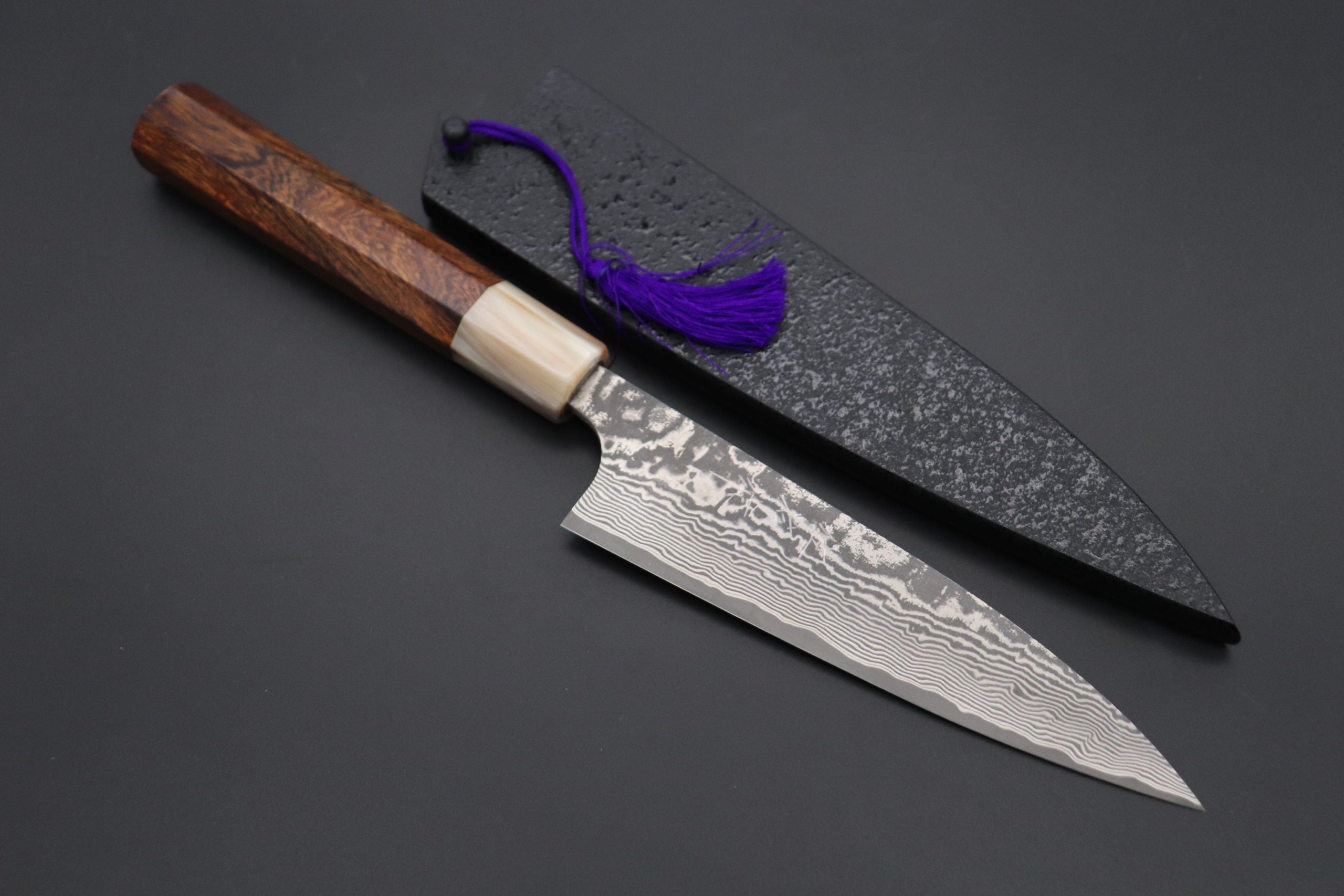 This Custom Limited Edition Takeshi Saji VG-10 Damascus Wa Petty Knife features a natural, stylish octagonal Desert Ironwood handle with a marble-colored water buffalo horn ferrule. For safekeeping, the knife includes a matching black lacquered wooden saya (sheath) with a black pakkawood saya pin.