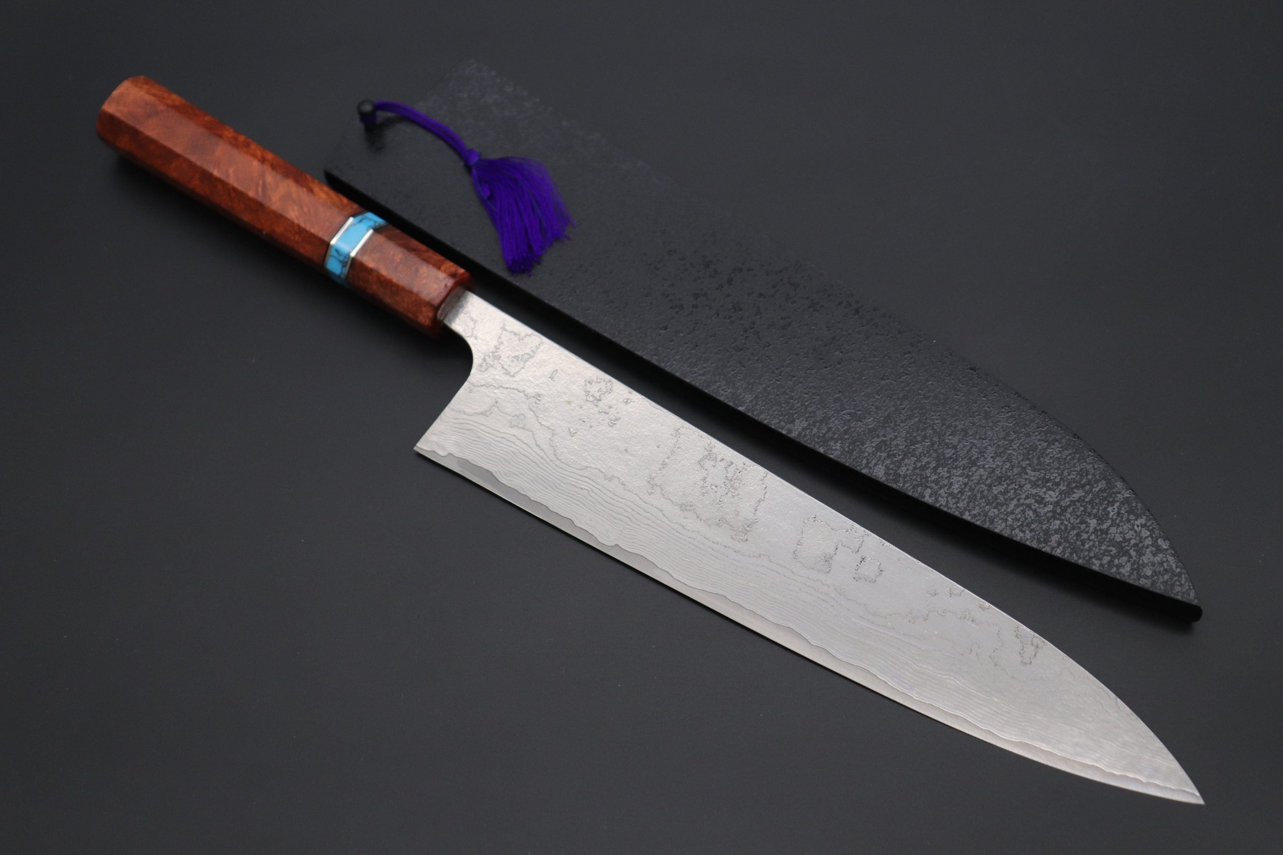 This Custom Limited Edition Takeshi Saji VG-10 Custom Damascus Wa Gyuto Knife with Contemporary, Stylish Wa Handle. The Innovative Octagonal Bubinga Burl Wood Handle with Composite Turquoise Gemstone Ring and Nickel Silver Spacers. For safekeeping, this knife comes with a matching Black Lacquered wood Saya (Sheath) with a black pakkawood Saya pin.