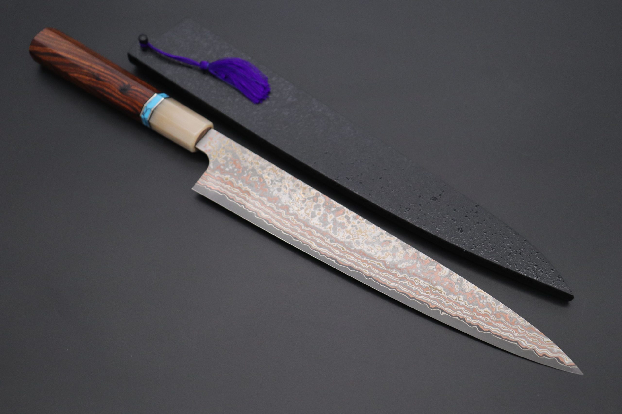 This Custom Limited Edition Takeshi Saji VG-10W Golden Rainbow Damascus Wa-Sujihiki Knife with Contemporary, Stylish Wa Handle and a matching Black Lacquered wood Saya (Sheath) with a black pakkawood Saya pin. The Innovative Octagonal Desert Ironwood Handle with White Color Water Buffalo Horn Ferrule and Composite Turquoise Gemstone Ring and Nickel Silver Spacers.