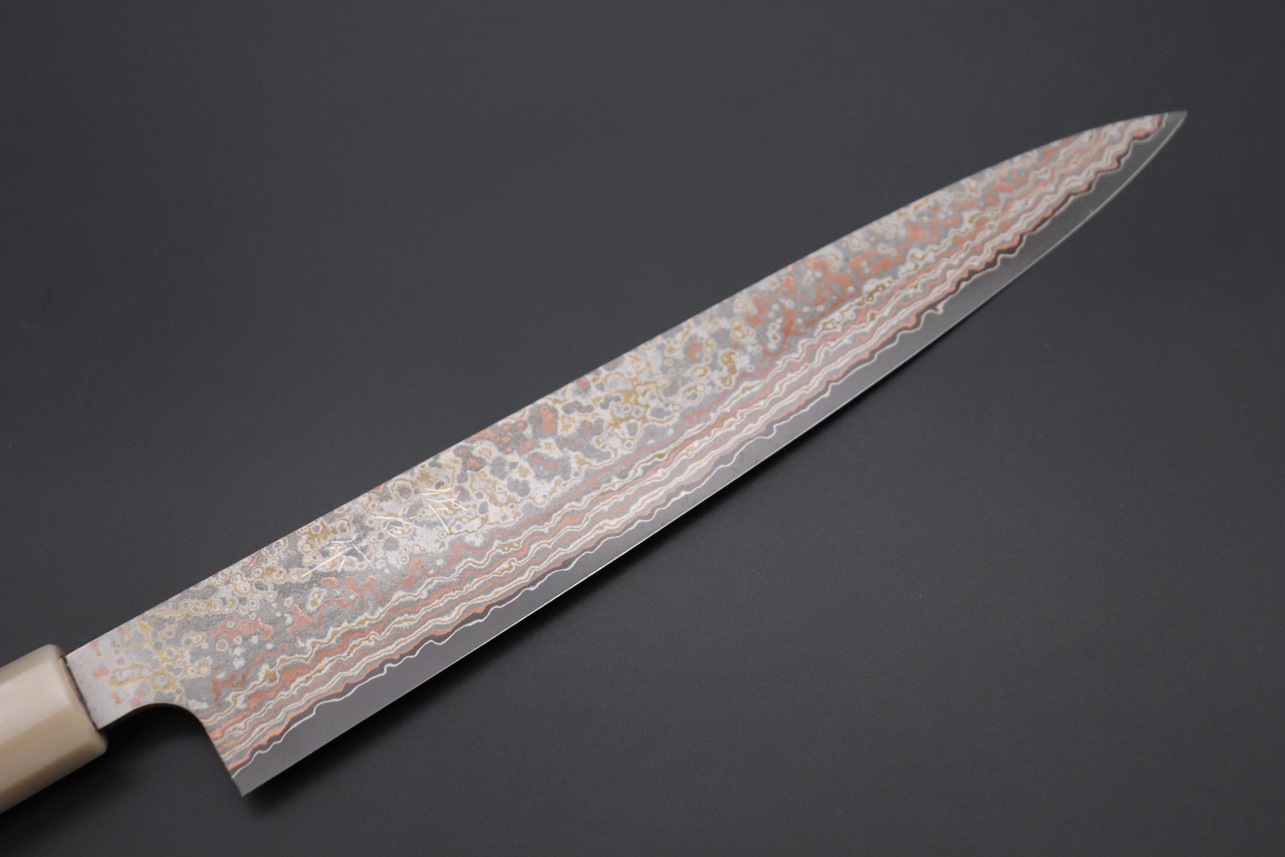 Knife Model: Takeshi Saji SUMMIT ― Limited Edition Custom Series VG-10W Multi-Colored Golden-Rainbow Damascus STCL-304 Wa Sujihiki 240mm