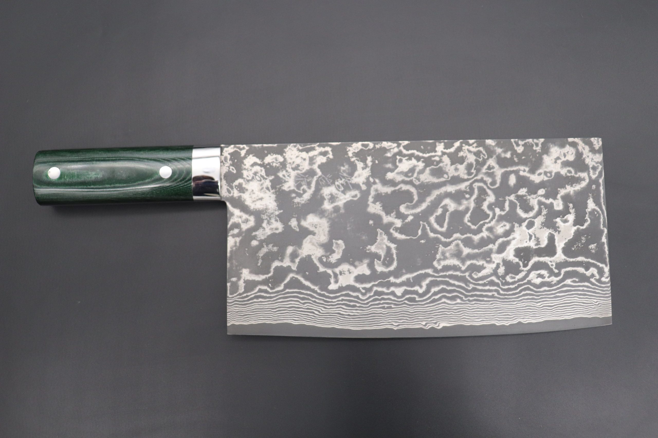 This is the limited custom Damascus Chinese Cleaver that is something different and unique with the craftsman’s spirit. Master Saji chose to use a green and black layered Linen Micarta® for the handle scales, due to its durability, water-resistance and strong resistance to shrinking.