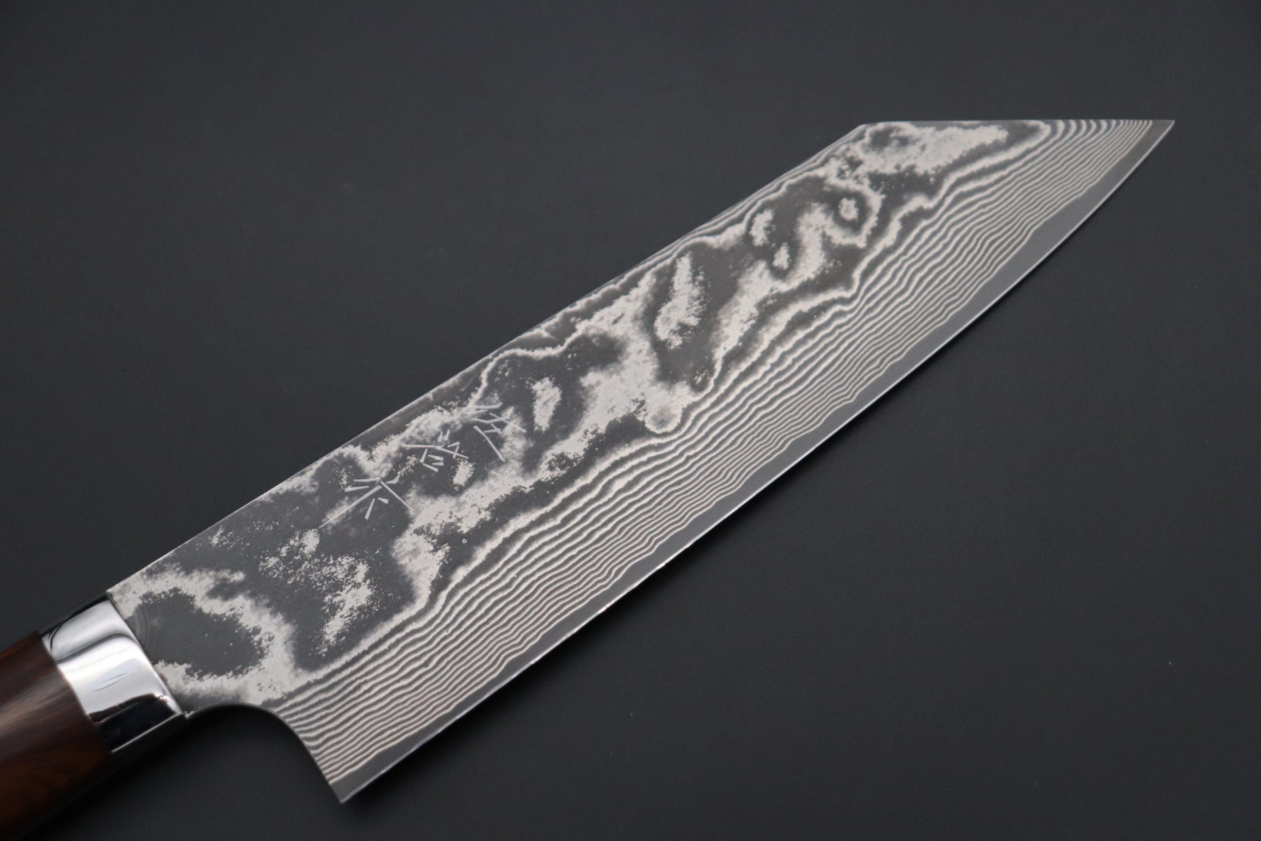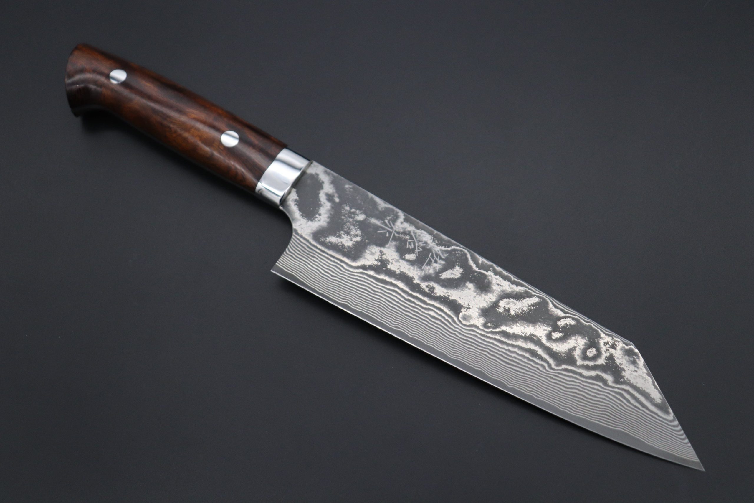 The layers of white-colored Nickel steel in this Damascus blade contrasts strongly with the stainless steel layers to produce a powerful wavy Damascus pattern that truly sparkles. To further accentuate the wild appearance of the Damascus, Master Saji decided to use the natural figure and grain of the Desert Ironwood Handles a and polished stainless steel bolster and rivets, which match the energetic style of the Damascus blade.
