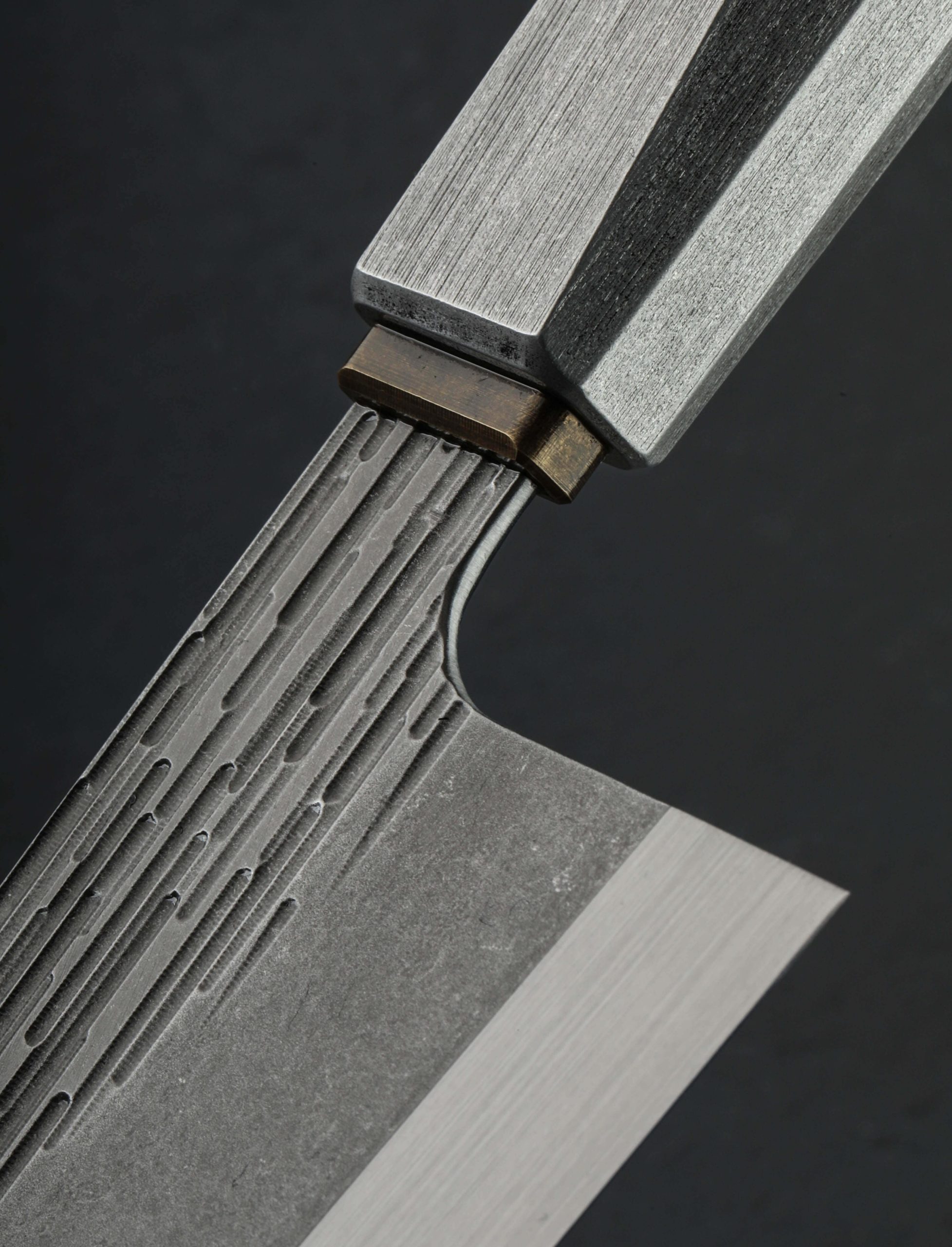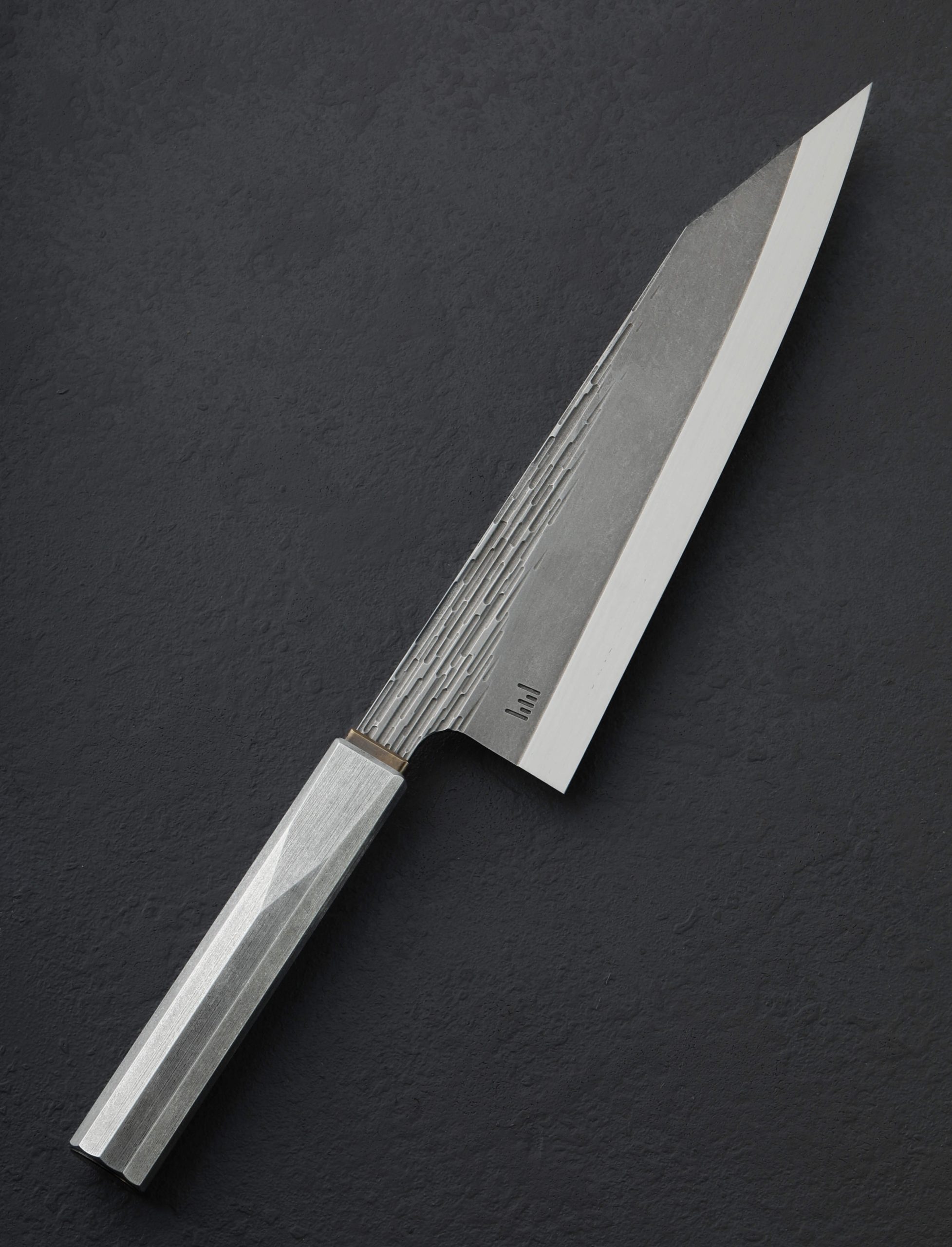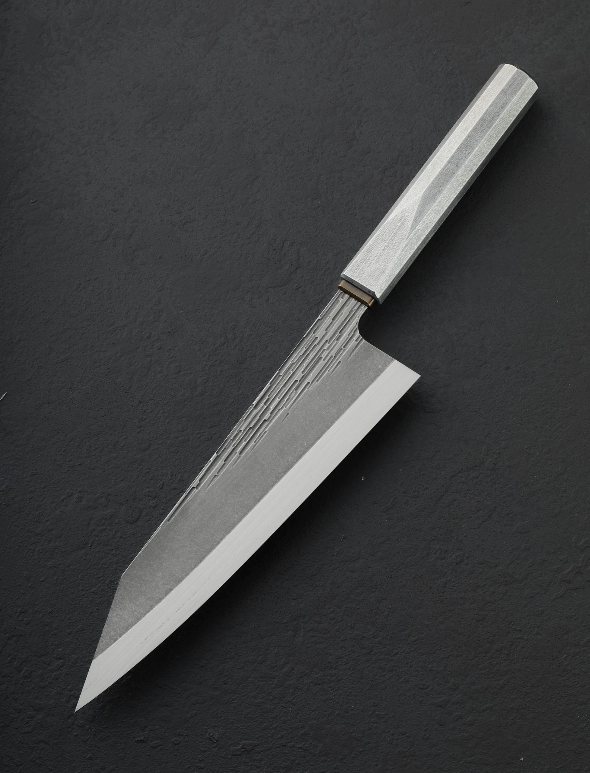 In a sleek, top-to-bottom metallic style is the one-of-a-kind “Technobark” K-Tip Gyuto by Luke Scheepers of Australia. Between the beautifully detailed and patinated collar and end-cap of brass, Luke has shaped a single piece of hollow, brushed 6061 aluminum into his unique, comfortable wa-style handle, featuring a decagonal, tapered form for control in any grip. With a stunning, 228mm / 9″ blade of 52100 carbon steel textured with his “Technobark” pattern, Luke crafts a function-first tool for every-day meal prep built to be passed down through the generations. The thin, lightweight, and razor-sharp blade with compound ‘S-grind’ geometry can easily become the only knife you’ll reach for day in and day out. Quick, nimble, and natural at the cutting board, to feel the knife in the hand is to experience form and function at another level. A combination of precision, computer-aided machining, and generative design-driven texturing forms a high-performance blade with a two-tone finish of designed flats and a satin-finished edge, perfect for efficient cuts and excellent food release.