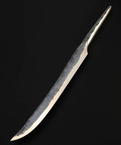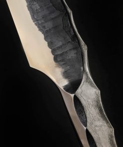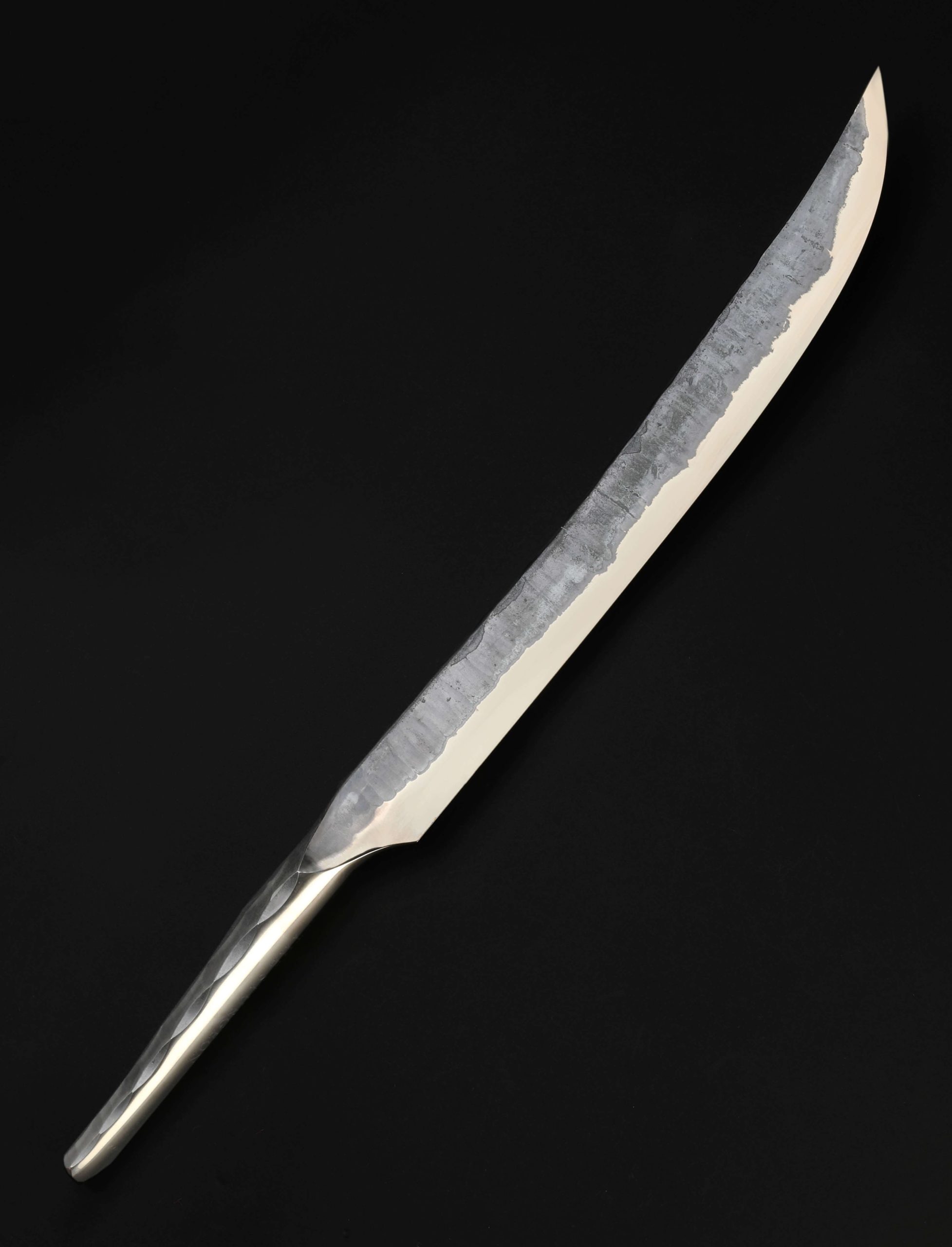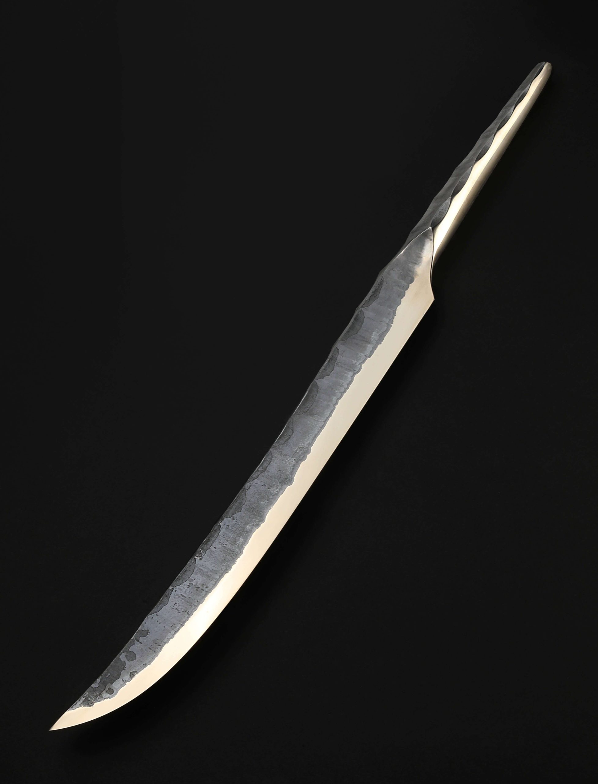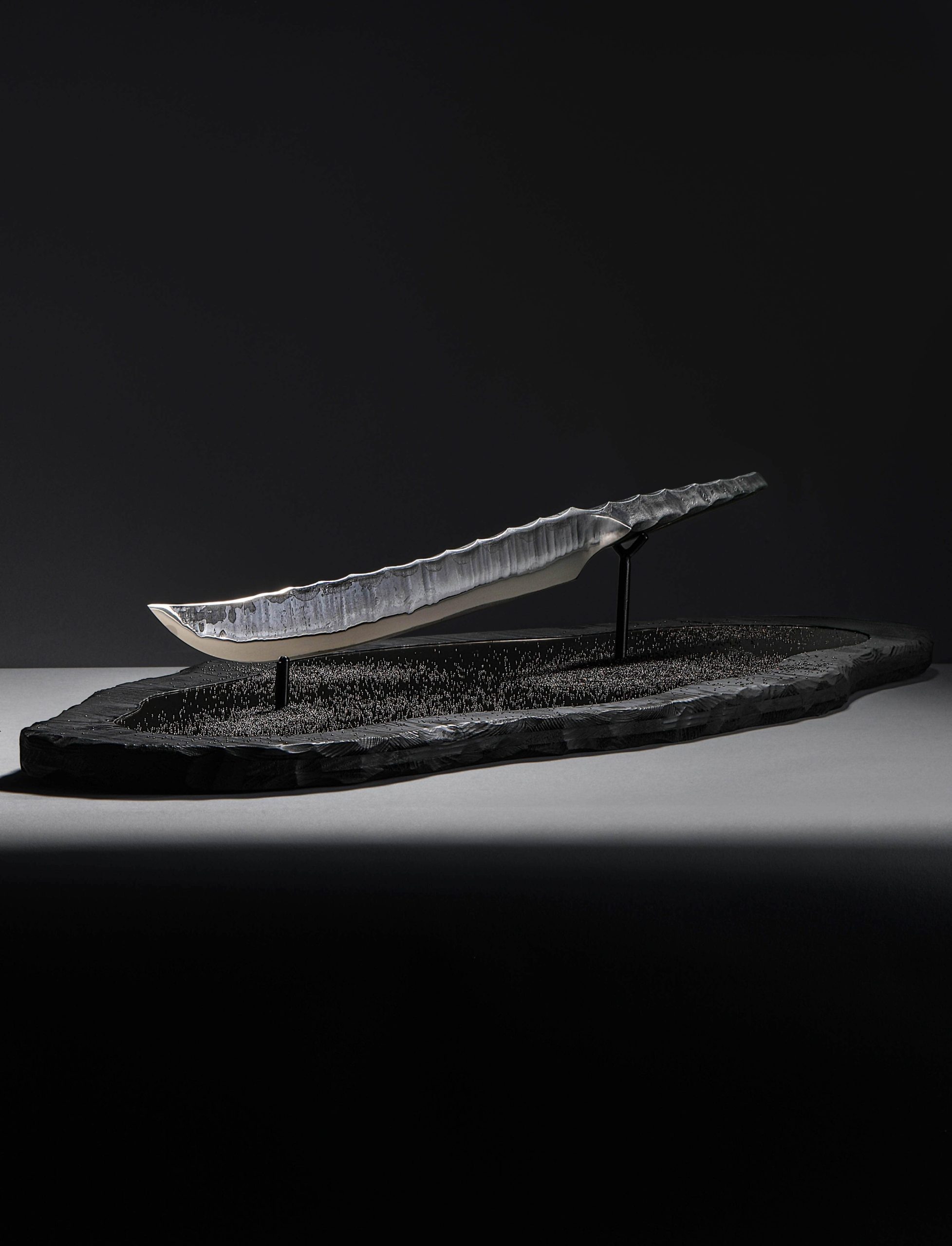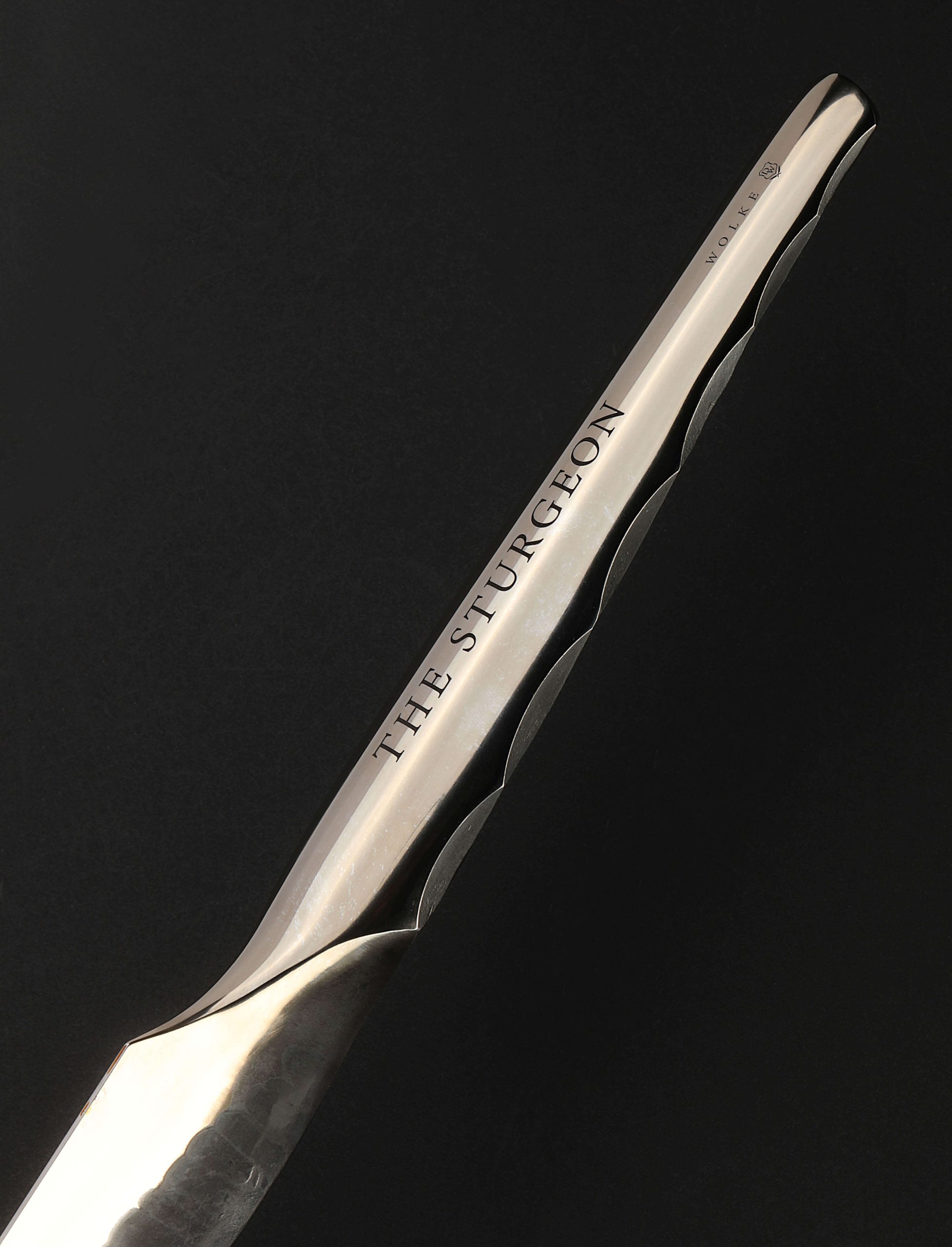 Austrian artist David Wolke’s contribution to The Art of Cutlery, a champagne sabre named “The Sturgeon,” on show during summer 2024 in Tribeca, NYC, positions this opulent, ceremonial tool, and the ‘mother’ of his ROGEN (‘Caviar’) Collection of jewelry made from recycled gold, as both culinary art, and a commentary on sustainability in the luxury sphere. Replacing scarce and overfished resources with hand-hewn, heirloom objects made to last generations can fulfill the needs of all the globe’s stakeholders. Forged by hand from solid carbon steel, the entire work is crafted with one-piece construction, the handle and blade’s spine representing the sturgeon’s iconic scutes. A mirror-polished edge and tip sweep upwards forming its snout. The Sturgeon is presented on a tabletop display stand with mirrored surface that reflects the beauty of the artwork. David has finished The Sturgeon with an unsharpened edge designed for sabrage.