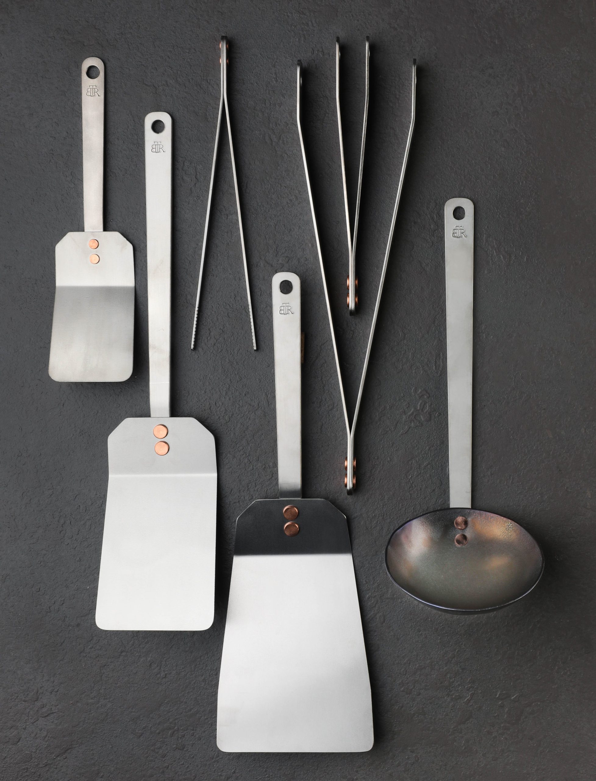 The ultimate cooking utensils set handcrafted from the ultimate culinary material. Featuring eight pieces by Ben Tendick of Oregon, this kit includes several long-time customer favorites, all made of solid titanium with copper rivets. Three complementary models of TiSpats Titanium Spatula are included to cover endless cooking needs: the compact Mini, the flexible, versatile Flat-Head, and the tough, large Griddle Spatula. Next are Titanium Kitchen Tongs, both small and large, as well as Titanium Plating Tweezers for the finest details. Finally, for scooping, stirring, and serving, is the hand-forged Large Titanium Ladle. Lightweight, incredibly durable, low in heat conductivity, non-reactive, hypoallergenic, 100% food safe, non-magnetic, and easy to clean, there’s nothing like cooking with titanium. Softer than steel, titanium is also ideal for use in carbon steel and cast-iron cookware. This kitchen set provides endless utility in handmade designs that are built to last generations of cooks.