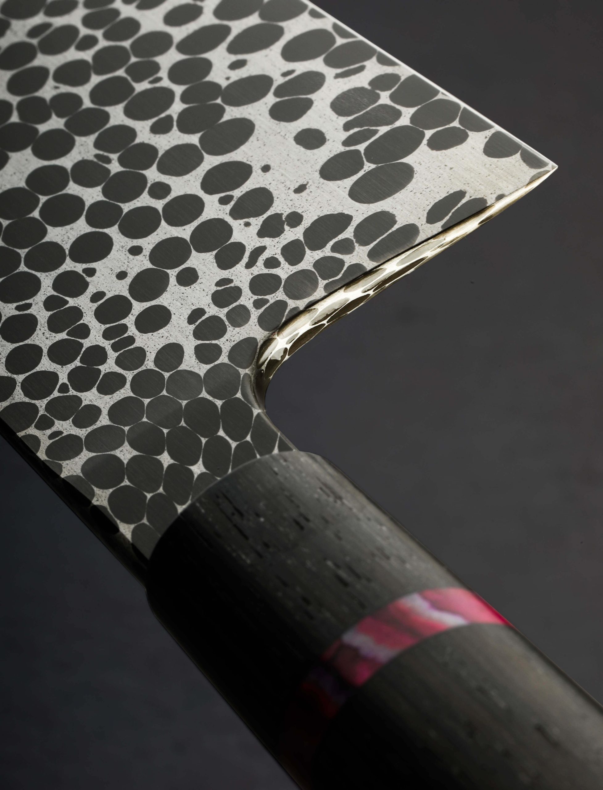 A unique and very special delivery has arrived in this mesmerizing blade from Joseph Schrum, designer and craftsman behind Halcyon Forge of Missouri. For the first damascus of its kind from his shop, and the first canister damascus in seven years, Joe combined thousands of 1/8″ 52100 ball bearings with 4800KC carbon steel powder to form a jaw-dropping pattern with incredible contrast in which droplets of steel seem to float, mingle, and bend atop a surface of satin. Mid-height bevels with superb convexity lead to a very thin and long, 238mm / 9.4″ edge in a profile offering a straight stretch beginning at the 55mm tall heel for big cuts, and ample belly as the edge sweeps upward to the tip for a wide variety of daily kitchen tasks. Balancing just shy of an inch in front of the choil, this blade is weighted and steady in the hand, providing excellent cutting performance for long, precise slices, up-down chopping, and even detail work with its paper-thin tip and finely honed, near-zero edge. This one-of-a-kind object’s build is completed with a smooth, oval, wa-style handle of Ukranian bog oak that features a ring of stabilized mammoth tooth with beautiful details. Comfortable to handle and easy to look at, this knife gives the term ‘fine, functional art’ a new meaning.