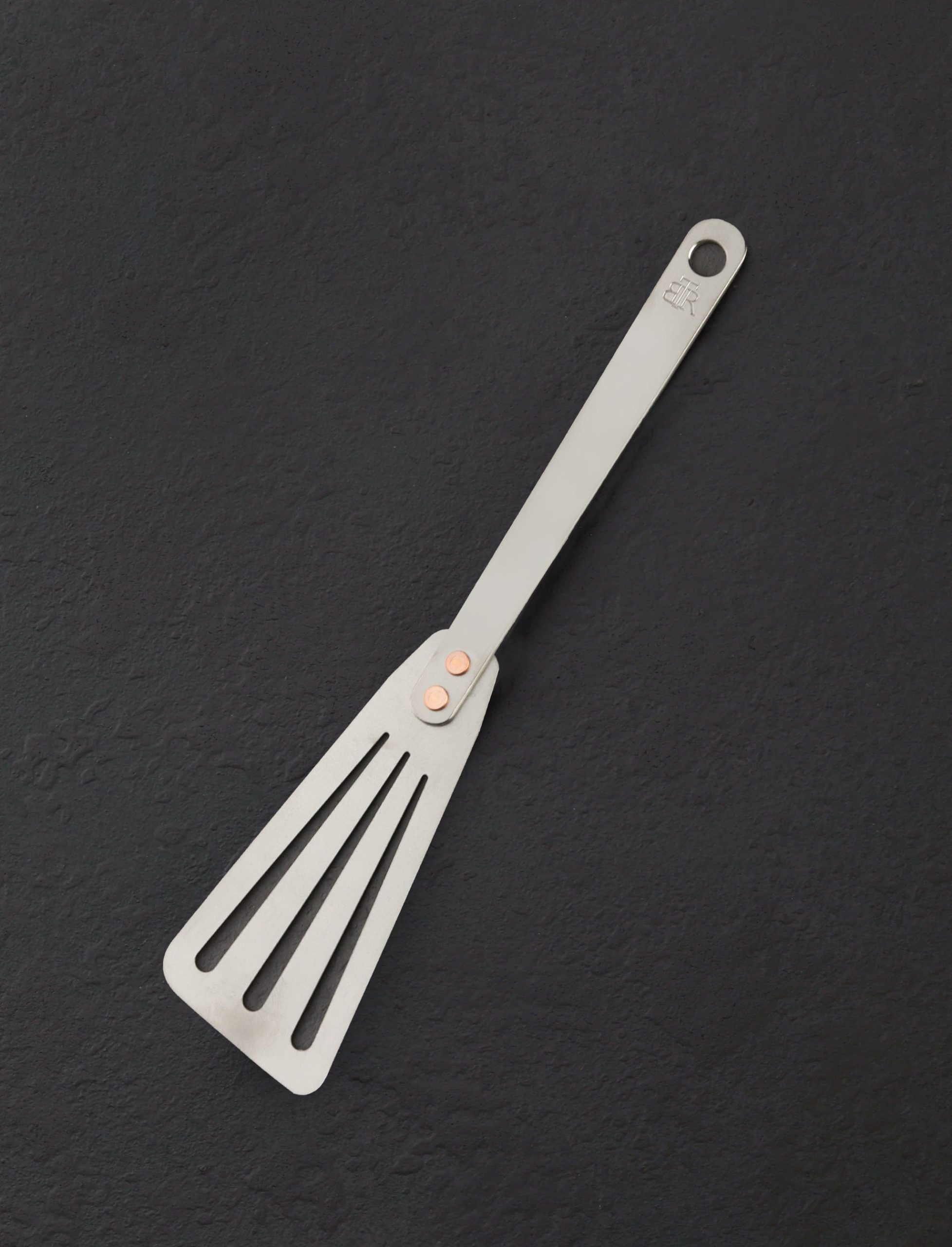 A tried and true favorite tool of ours, and yours, has been downsized. Meet the new Mini Titanium Fish Spatula. Crafted from titanium, the non-magnetic, low-in-heat-conductivity, lightweight, and non-reactive ultimate culinary material, this, like all TiSpats models, is perfect for daily use indoors and out. Suited to every kitchen task, from use in cast iron and carbon steel pans, to cooking over the open flame whether in the backyard kitchen or backcountry camp site, the Mini Titanium Fish Spatula gets the job done and is easy and fast to clean and care for. Handmade by Ben Tendick in Oregon, this flexible and thin, yet sturdy spatula is made for a lifetime of use.
