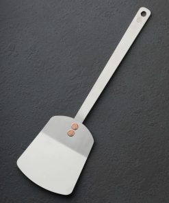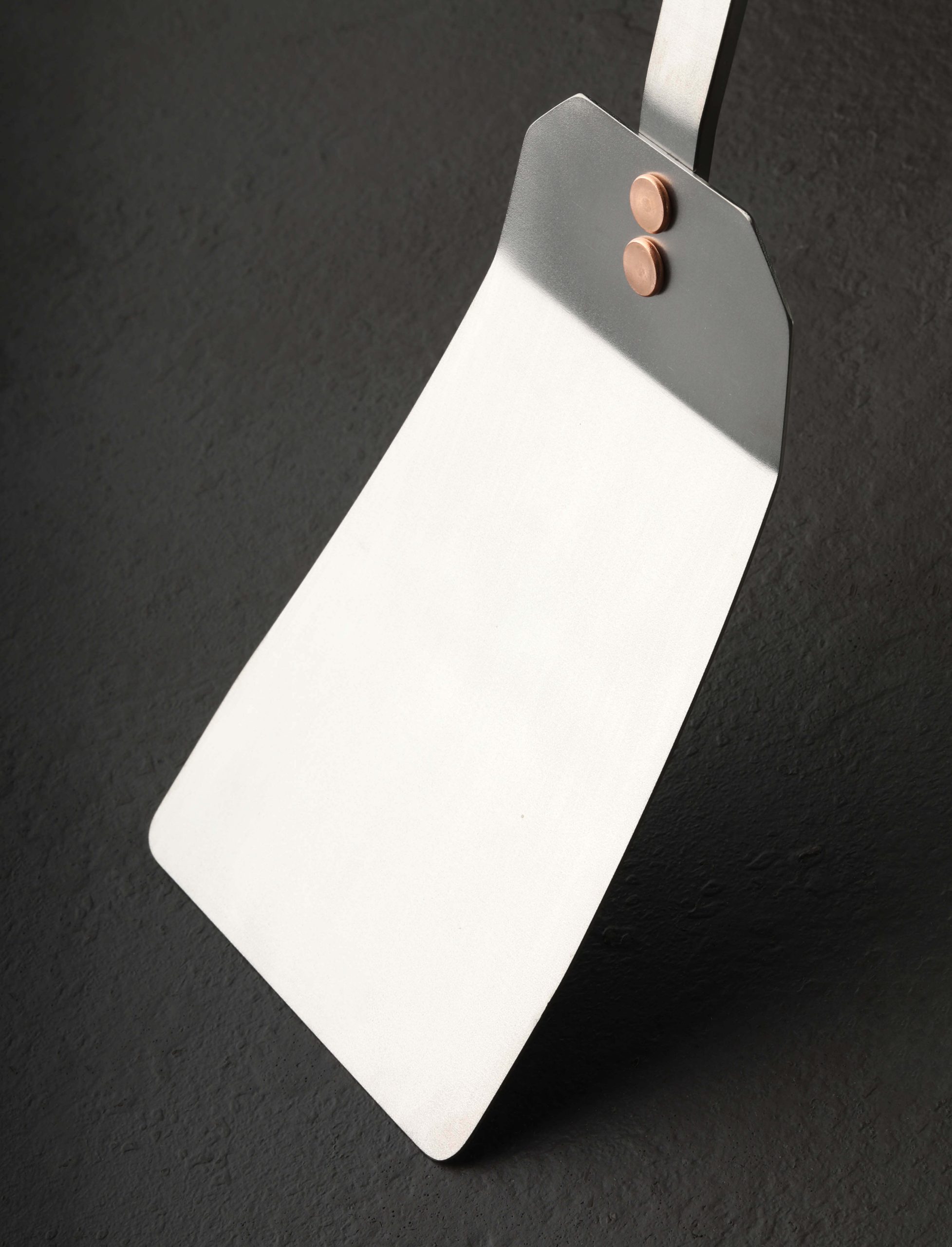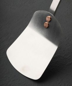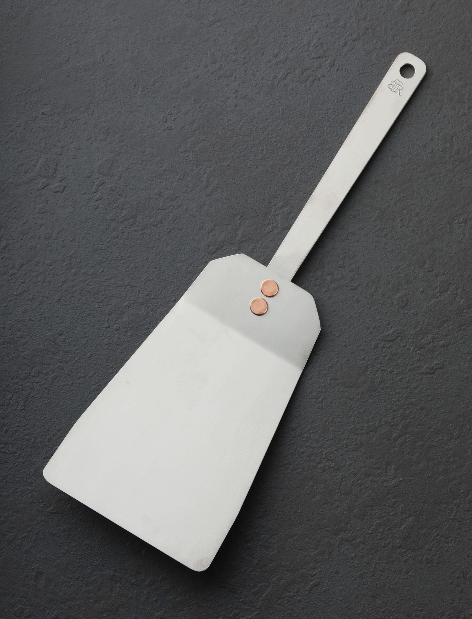 Designer Ben Tendick’s new Titanium Griddle Spatula packs big utility into a (relatively) compact package. The long, wide, and sturdy titanium head is thin yet sturdy, shaped from slightly thicker material than other TiSpats kitchen spatulas, and is paired with a short handle to provide maximum control and space savings while working over a hot surface. Tough, light, and crafted by hand from solid titanium with oversized copper rivets to outlast all the rest comes a tool to flip, turn, and move foods on the grill and griddle with ease and efficiency. Incredibly strong, low in heat conductivity, non-reactive, non-magnetic, virtually impervious to rust and corrosion, and 100% food safe in all applications, titanium is truly the ultimate culinary material, and few utensils benefit from these qualities more than the griddle spatula. Handcrafted in Oregon.