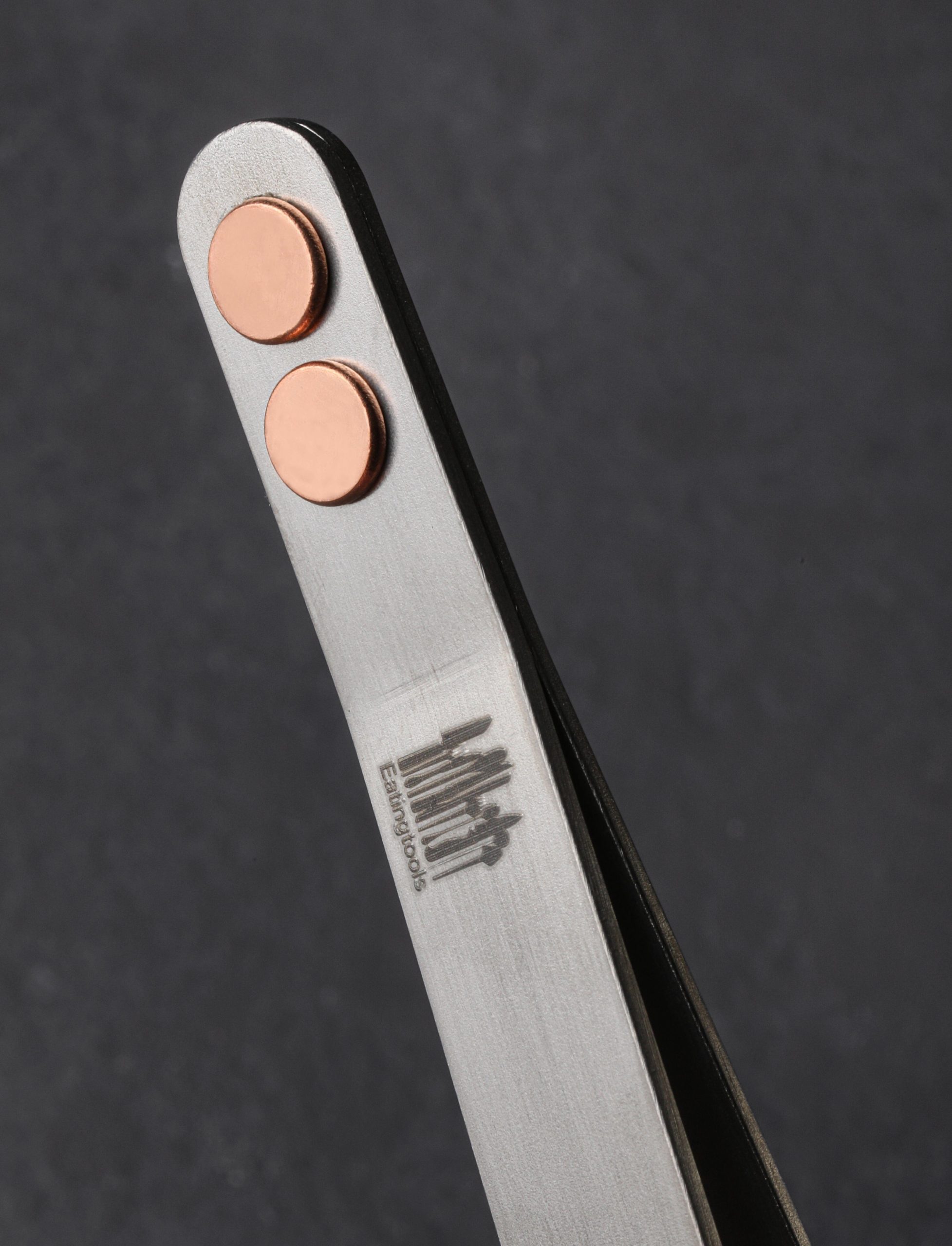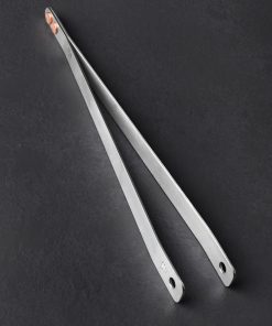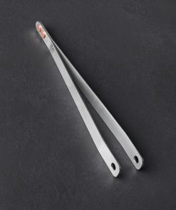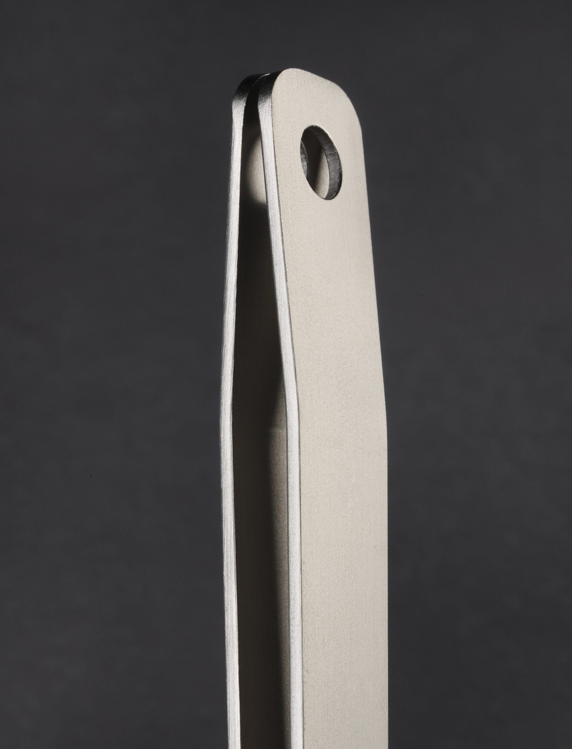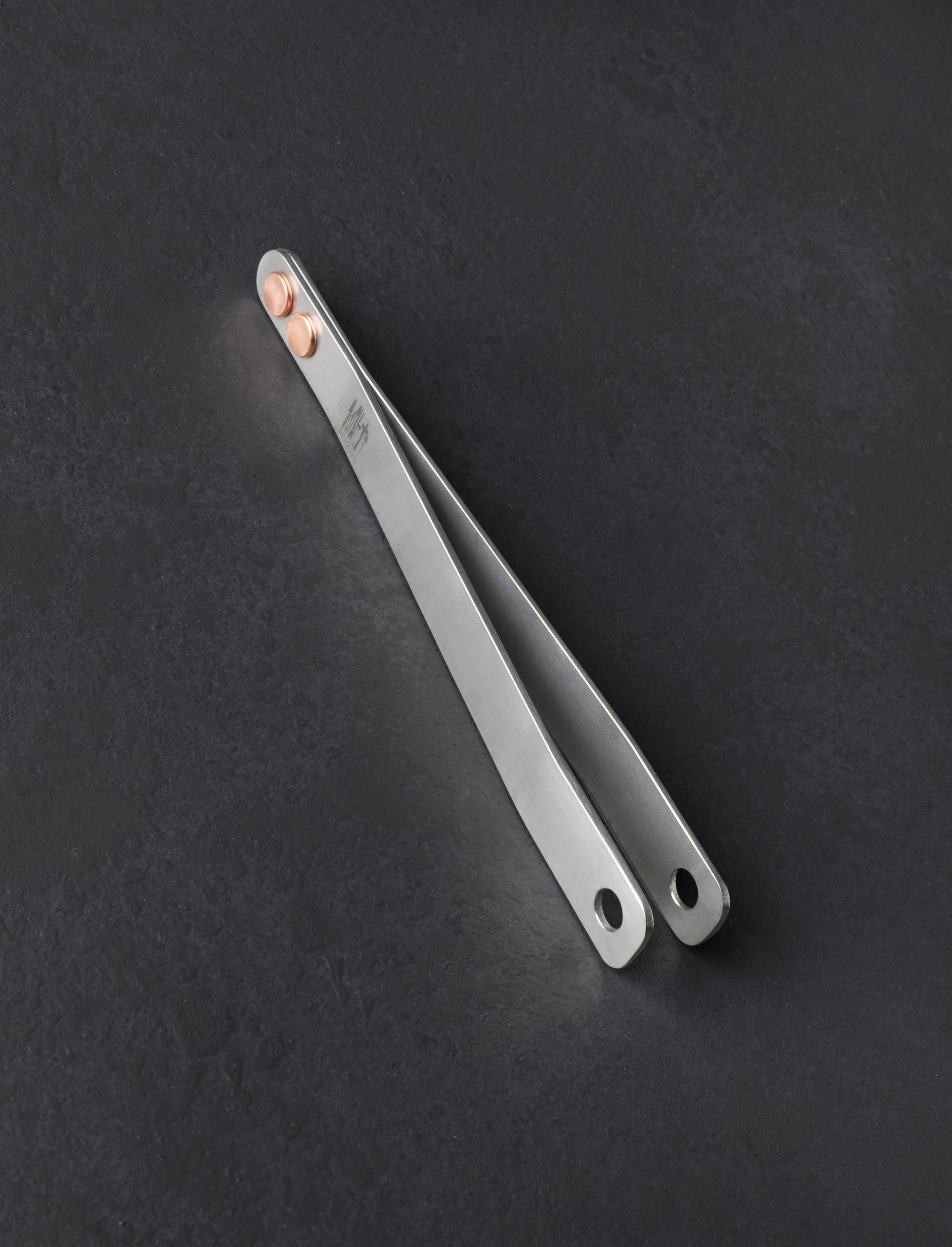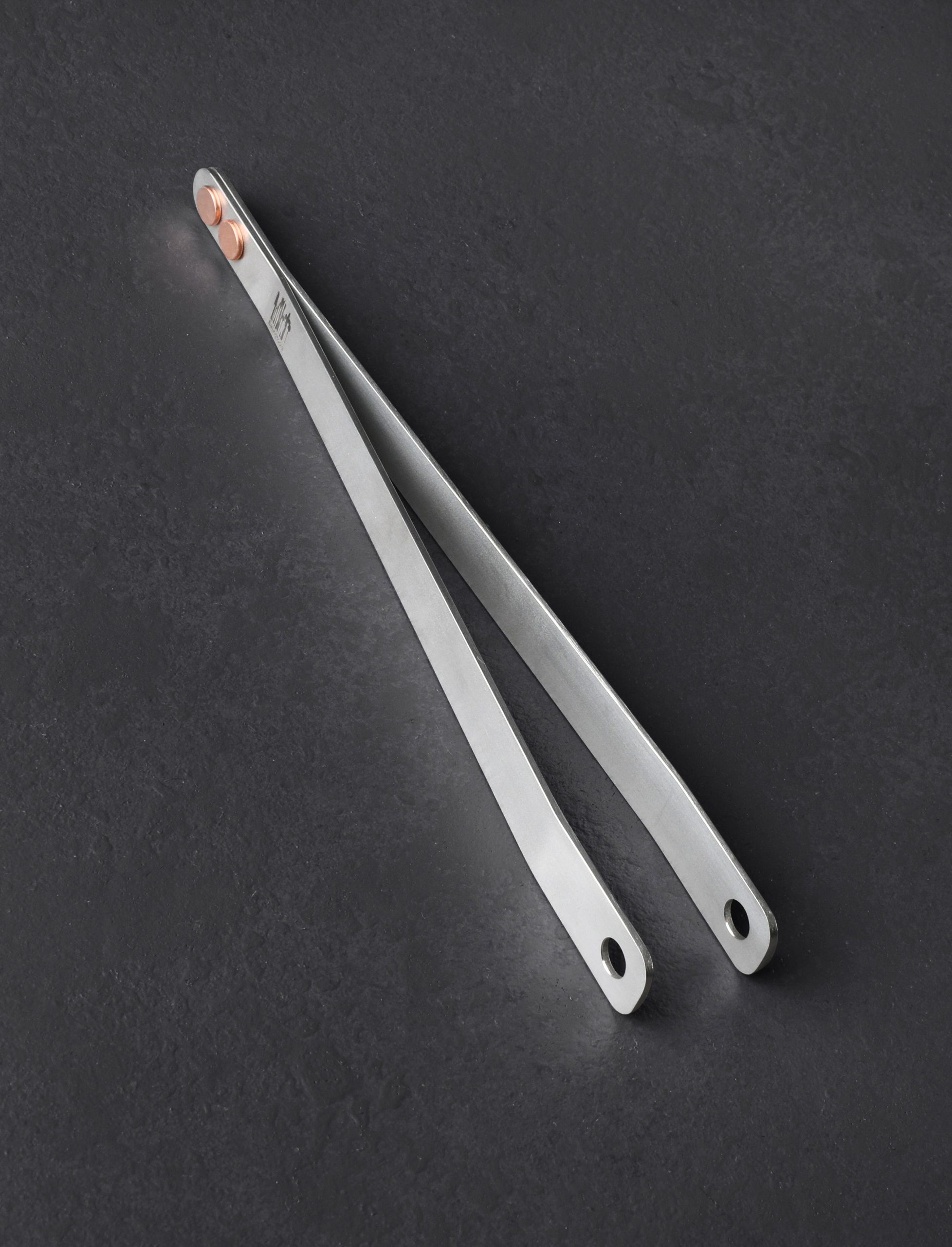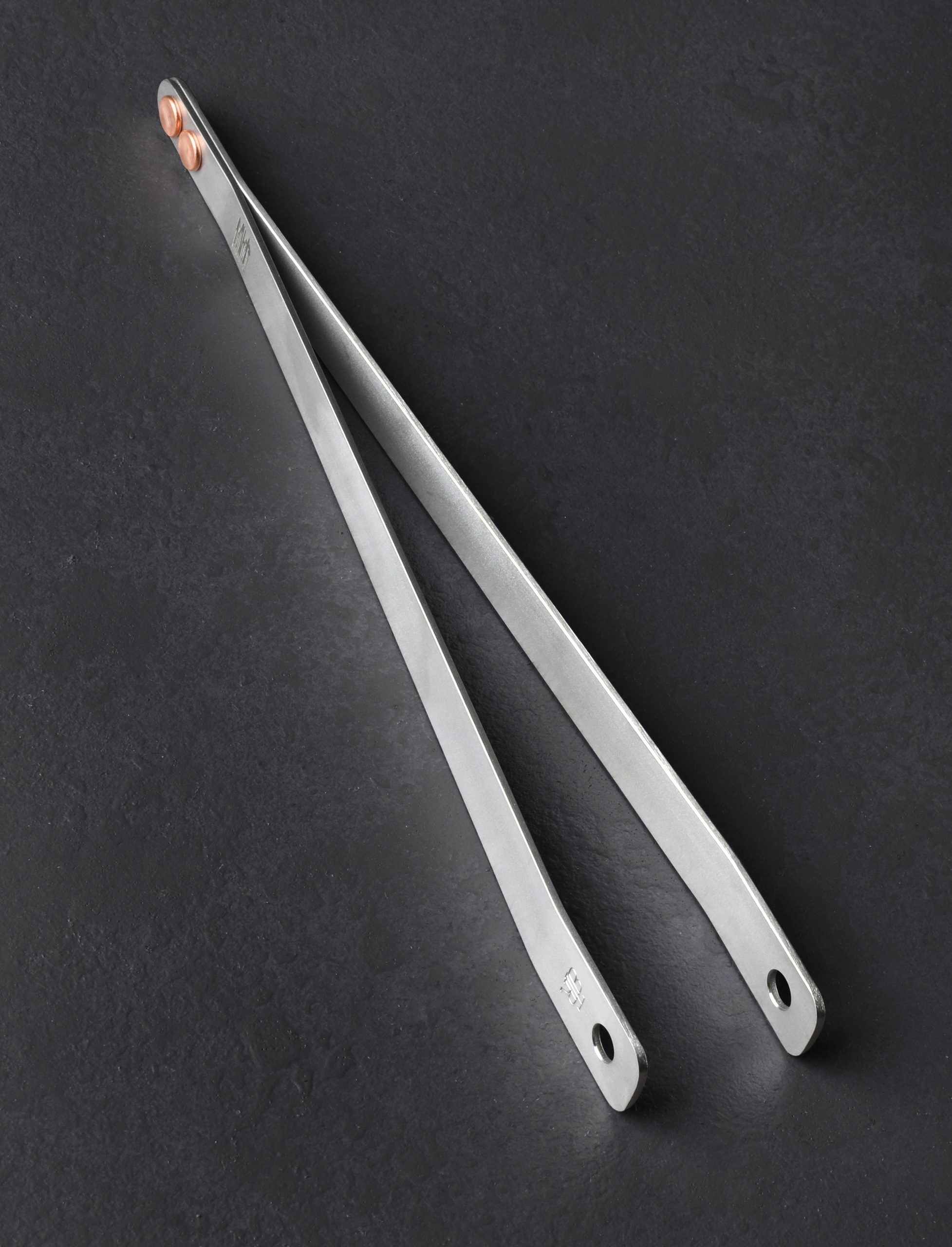 Calling all pasta, salad, meat, fish; okay, make that lovers of all foods; we are pleased to bring you Ben Tendick’s Titanium Kitchen Tongs. These lightweight, sleek tongs are perfect for serving guests, flipping and turning bacon and vegetables in the kitchen, and working over the backyard grill. Available in three models: Small at 178mm / 7″, Medium at 229mm / 9” long, and Large at 279mm / 11”. Titanium is low in heat conductivity, non-magnetic, and virtually impervious to rust and corrosion, making these tongs an ultimate cooking tool built to last. The titanium is secured with two oversize copper rivets; two holes at the ends offer grip assistance. What goes great with these kitchen tongs? A matching TiSpats Titanium Kitchen Spatula also made by Ben Tendick at his Oregon studio.