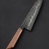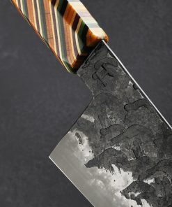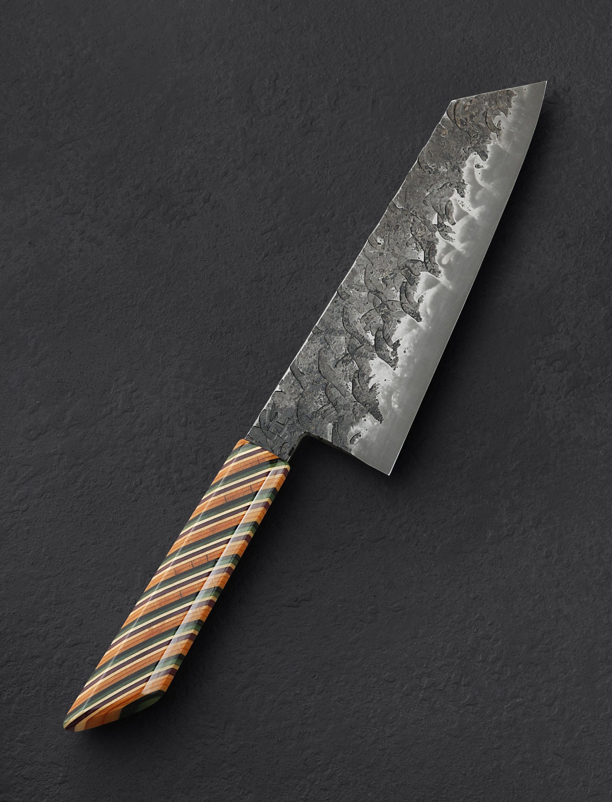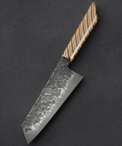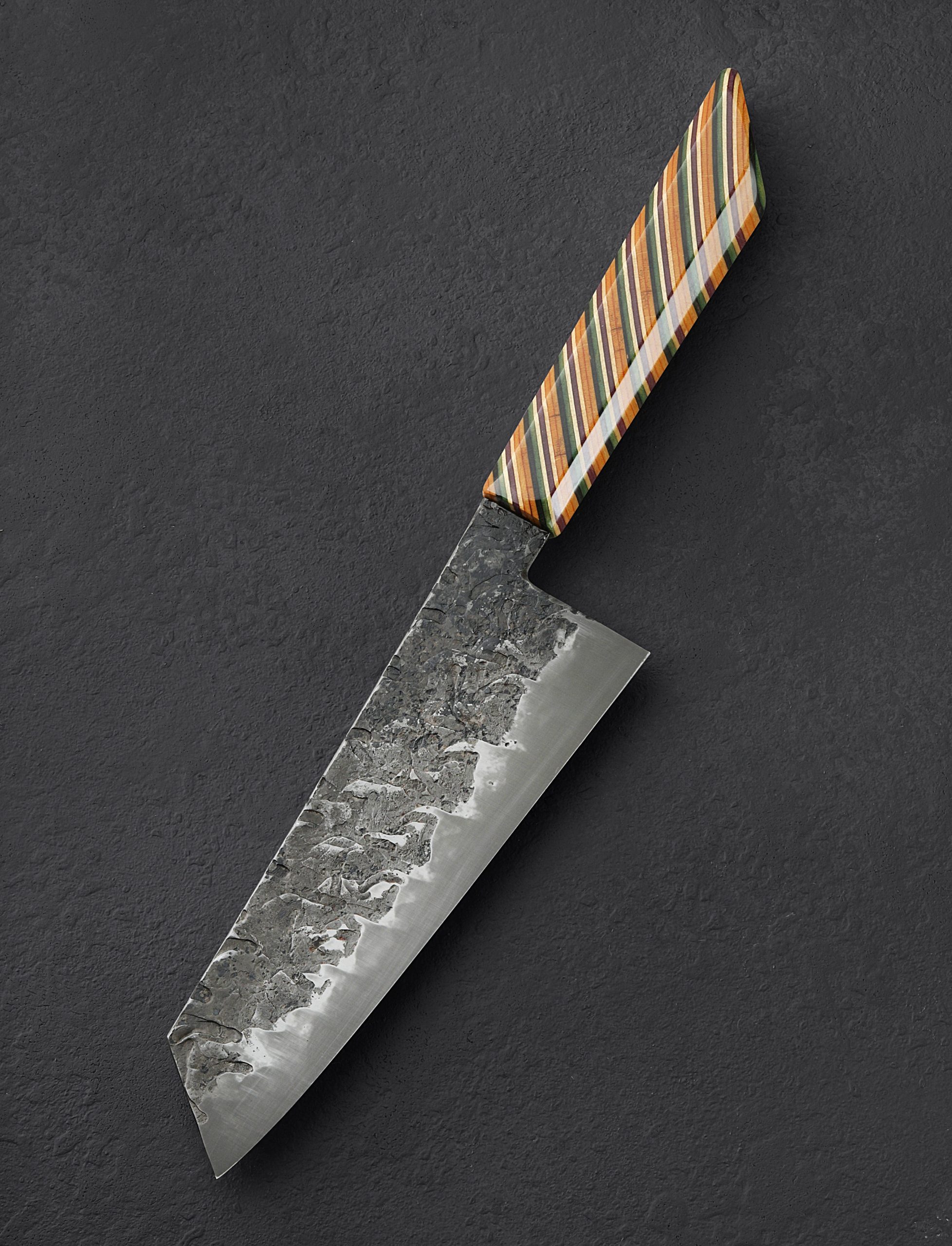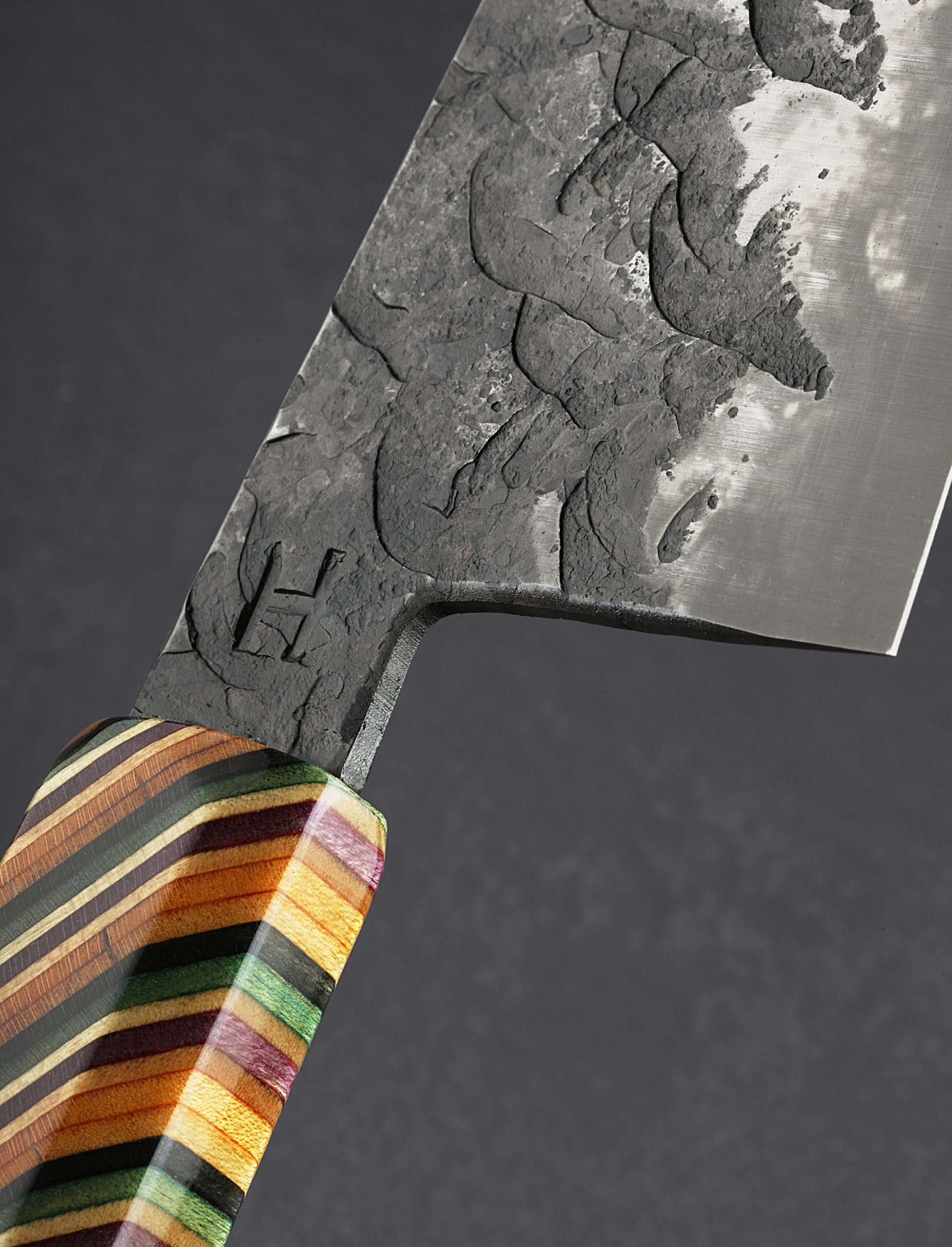 From brothers Kamil & Michal Hanuljak, talented bladesmiths, metal artists, and woodworkers in Prague, Czech Republic, the newest offering is this bunka chef’s knife with tall, hard, and sharp 177mm / 7″ blade designed as the do-all kitchen workhorse every cook needs. Forged by hand from 1.2063 high carbon steel, an outstanding option for kitchen cutlery due to its high carbon content combined with chromium for high hardness and wear resistance too, the blade is thin at the edge, slimming forward to an especially fine tip, with low, tough, durable convex bevels that provide for food release and the workhorse-style strength for even the most demanding cuts. Dark, patinated bevels are complemented by the Hanuljak tsuchime (hammered) finish along the flats, giving the tool an eye-catching look and further assisting in food release while chopping vegetables. Balancing just in front of the 60mm high heel, the knife is comfortable and natural in the hand, operated by a handle that gives the knife it’s ‘Skate’ name: a series of cut and stacked reclaimed skateboards. A one-of-a-kind piece for the home cook and working chef alike.