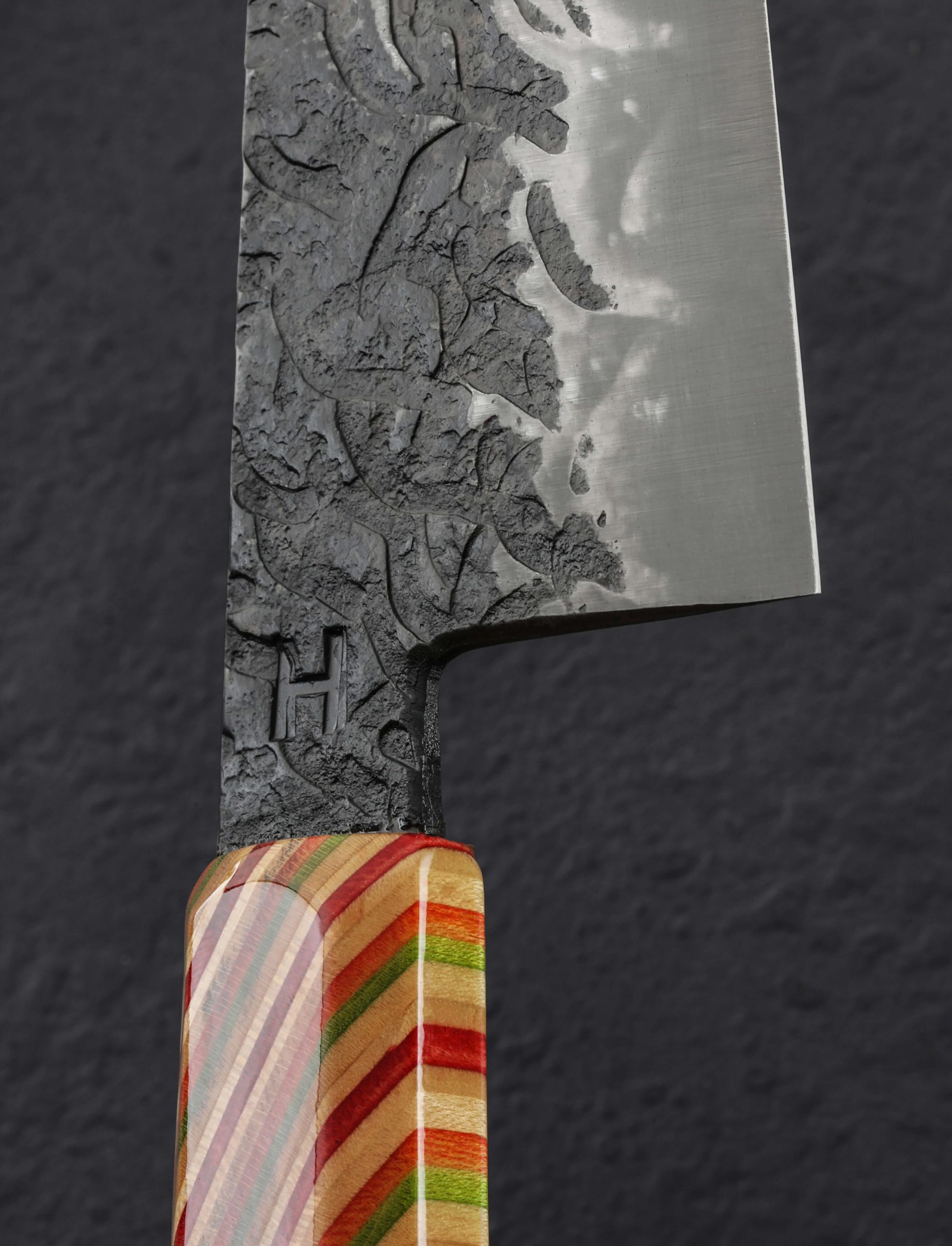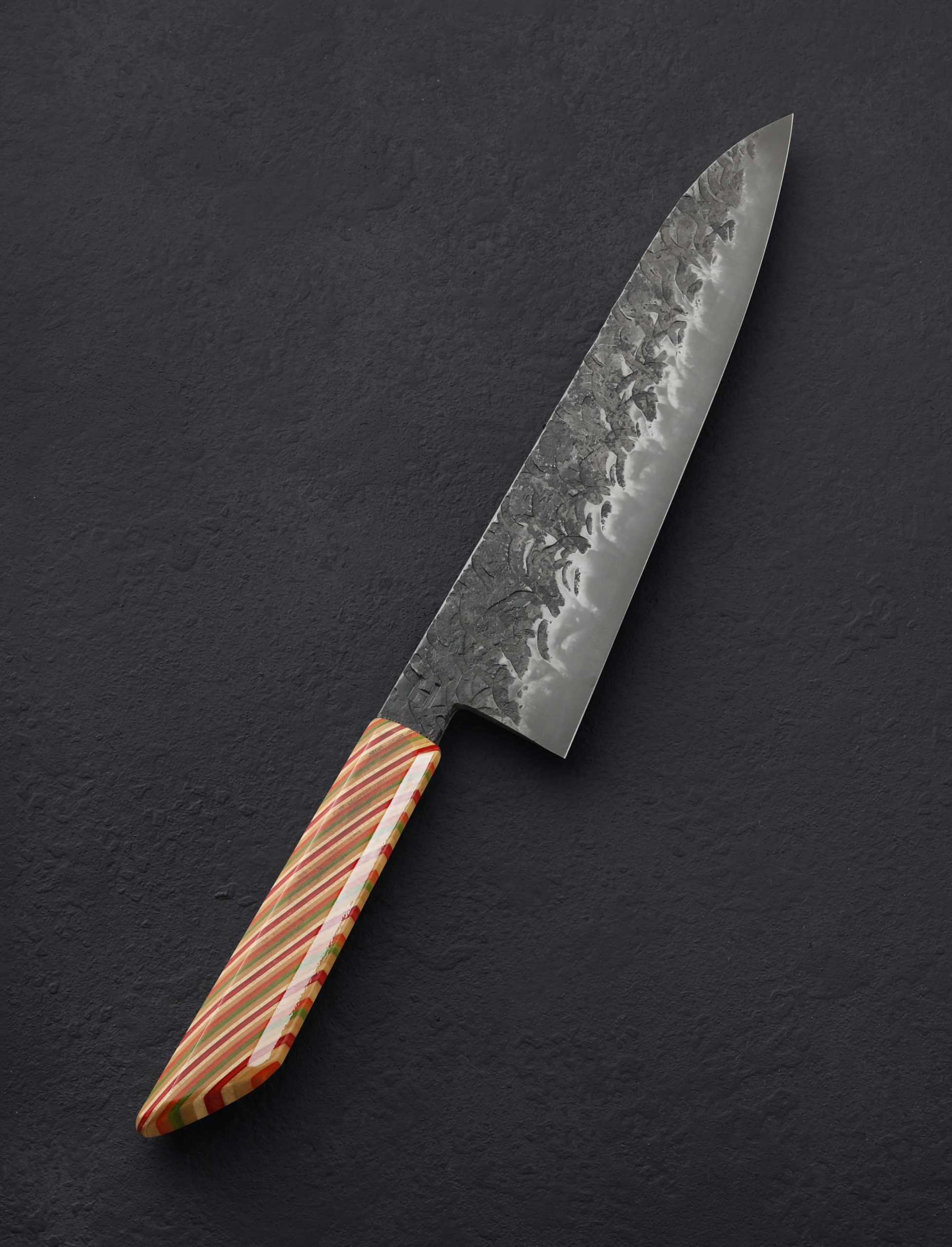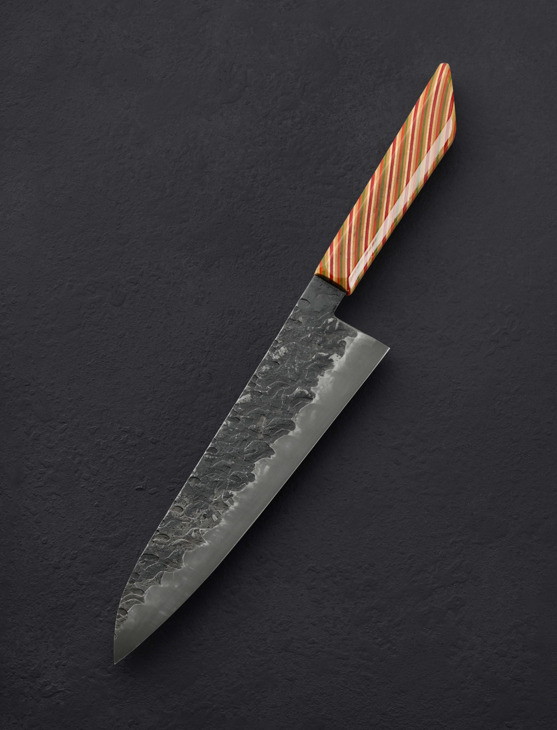 Presenting an outstanding, full-size, hand-forged carbon steel workhorse of a chef knife for home cooks and working chefs alike, designed and handcrafted by Czech brothers Kamil & Michal Hanuljak. The geometry, balance, and overall feel in the hand, from the long, weighted, high-carbon blade balancing an inch in front of the choil, to the comfortable and equally as colorful handle in versatile, octagonal wa form, make this a culinary cutting tool with which to do it all. Stiff and strong along the tapering spine, the geometry and profile are versatile, designed for every cut, progressing from tall and tough above the edge’s heel, through a thin, hard, razor-sharp edge, to an extremely slim, pointed tip for detail work. The forward leaning balance point helps ensure the knife moves effortlessly through ingredients, while beautifully honed convex bevel geometry and tsuchime texturing above aid performance and food release. With 226mm / 8.9″ of edge that stands 58mm high off the cutting board, there are few if any cuts this capable tool will not excel at. And last but certainly not least, pairing nicely with the thoughtful blade finish is a handle sculpted from reclaimed skateboards, an ode to the maker’s life-long love of the sport, as well as to the creative freedom that knifemaking offers them.