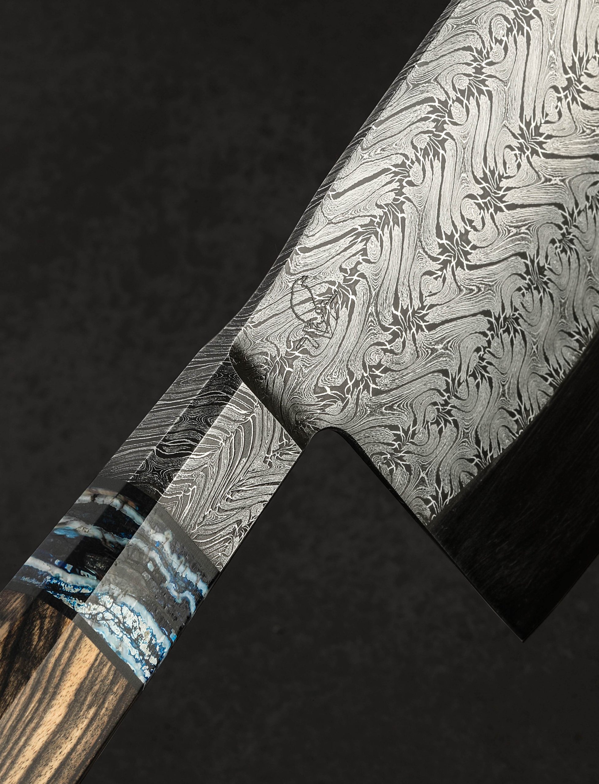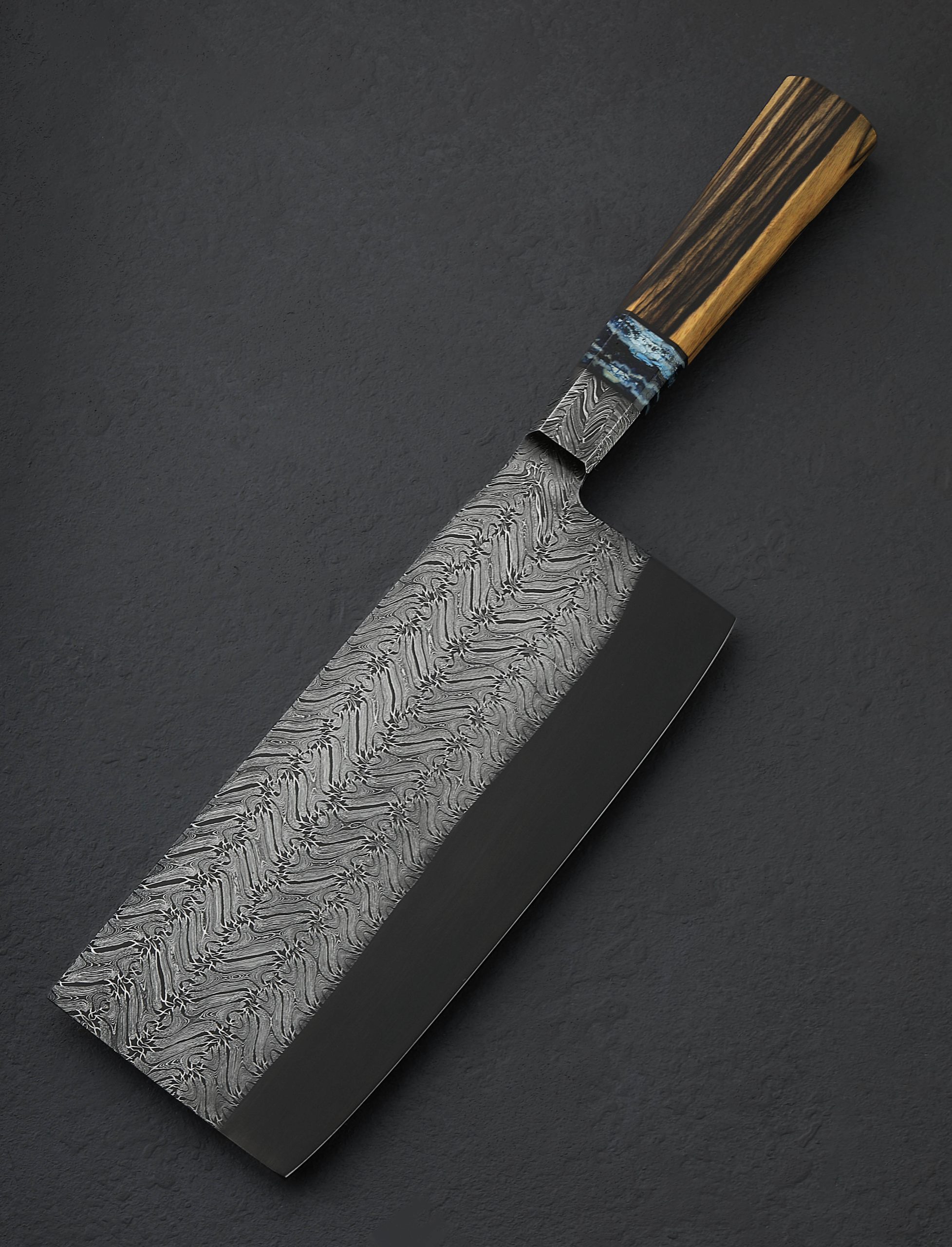 Magnificent is the adjective that comes to mind. Newly minted at the Lynn Valley Forge studio of bladesmith Casey Vilnesky is a one-of-a-kind Chinese-style vegetable cleaver, the latest work of art from this wildly talented North Vancouver artist. The 221mm long, 93mm tall blade forged with integral bolster handle construction begins with two elements: a dark edge bar of 1084 carbon steel, and a piece of Turkish Twist pattern mosaic damascus steel as exquisite and detailed as any we have seen. A thin, razor-sharp, and hard edge is designed to move effortlessly through ingredients aided by Casey’s subtly convex bevel geometry and the overall weight and forward-leaning balance of the tool. To control the purposefully designed knife weighing just over 16oz / 474g, or one full pound, is a comfortable, handsome handle which boasts pale moon ebony, a wide spacer of fossilized mammoth tooth, and a flush, polished brass retention bolt cap that secures the elements together for generations of chefs to enjoy. To hold this object is to be transported to a world where food is everything and cooking is all that there is.