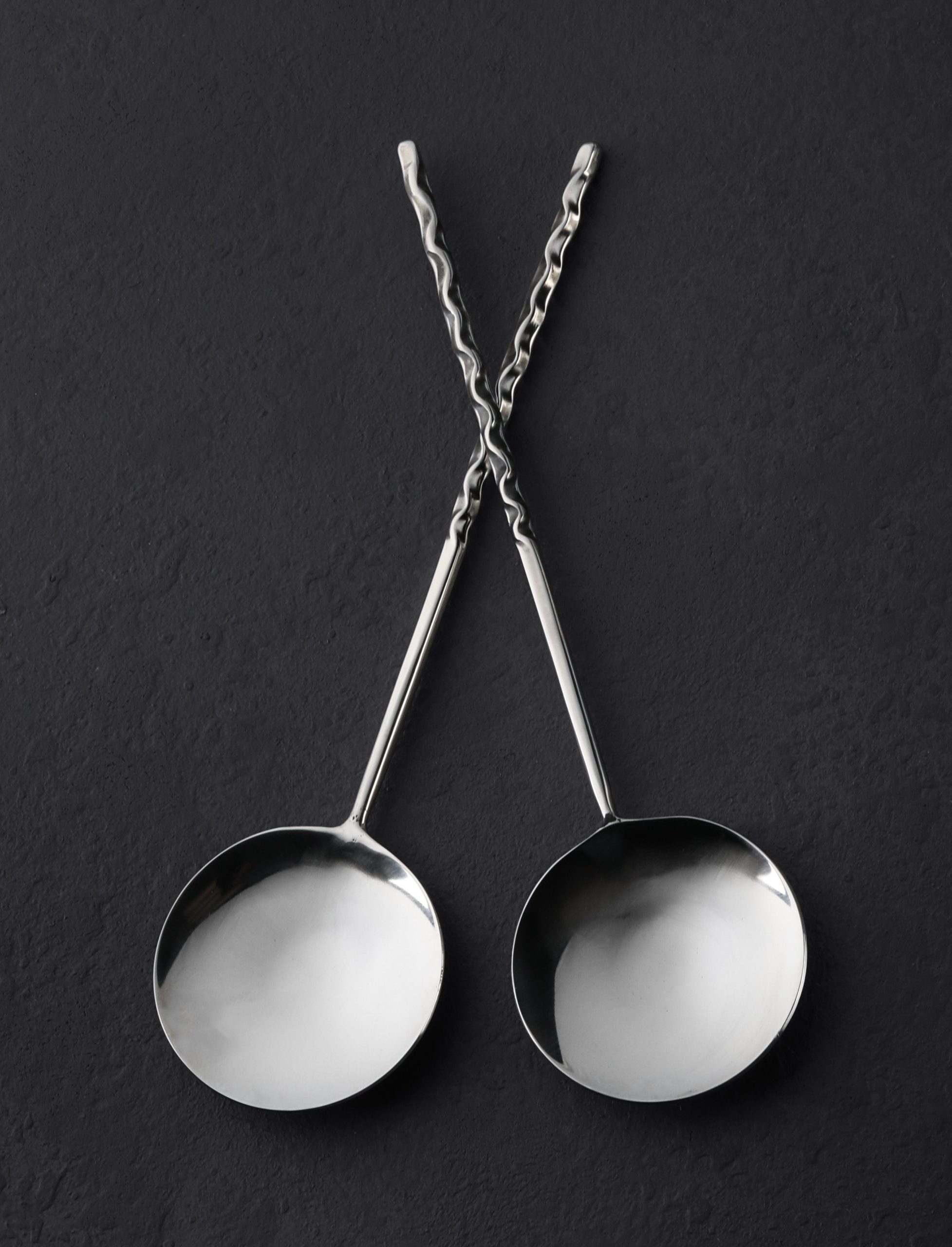 Serve salads of any variety in classic, contemporary style with this elegant serving set from sculptor and artist Stephen Fitz-Gerald. Forged by hand at his Santa Rosa, California studio, each server is turned and twisted one by one and bonded to a wide, shallow, circular bowl that shines like a full moon in the night sky. Each order includes one 2pc pair for your serving pleasure.