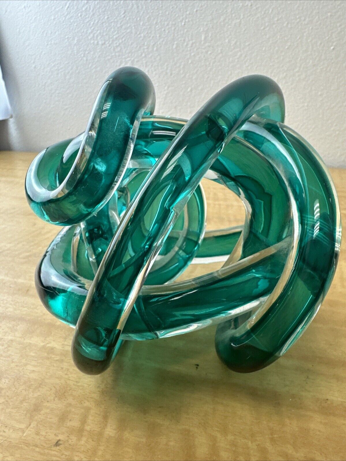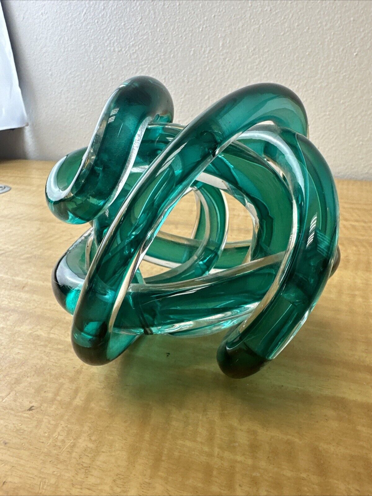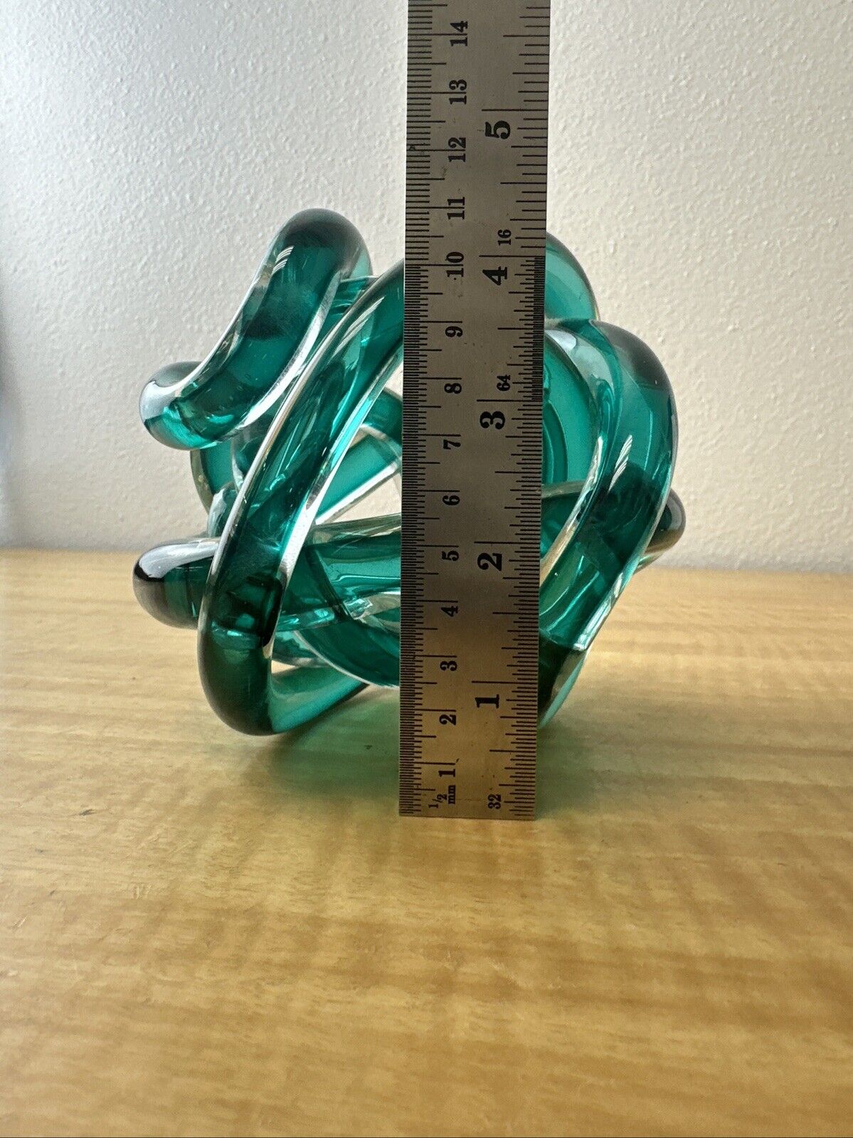 Turquoise Teal Blue Glass Art Twisted Knot 6″ Paperweight