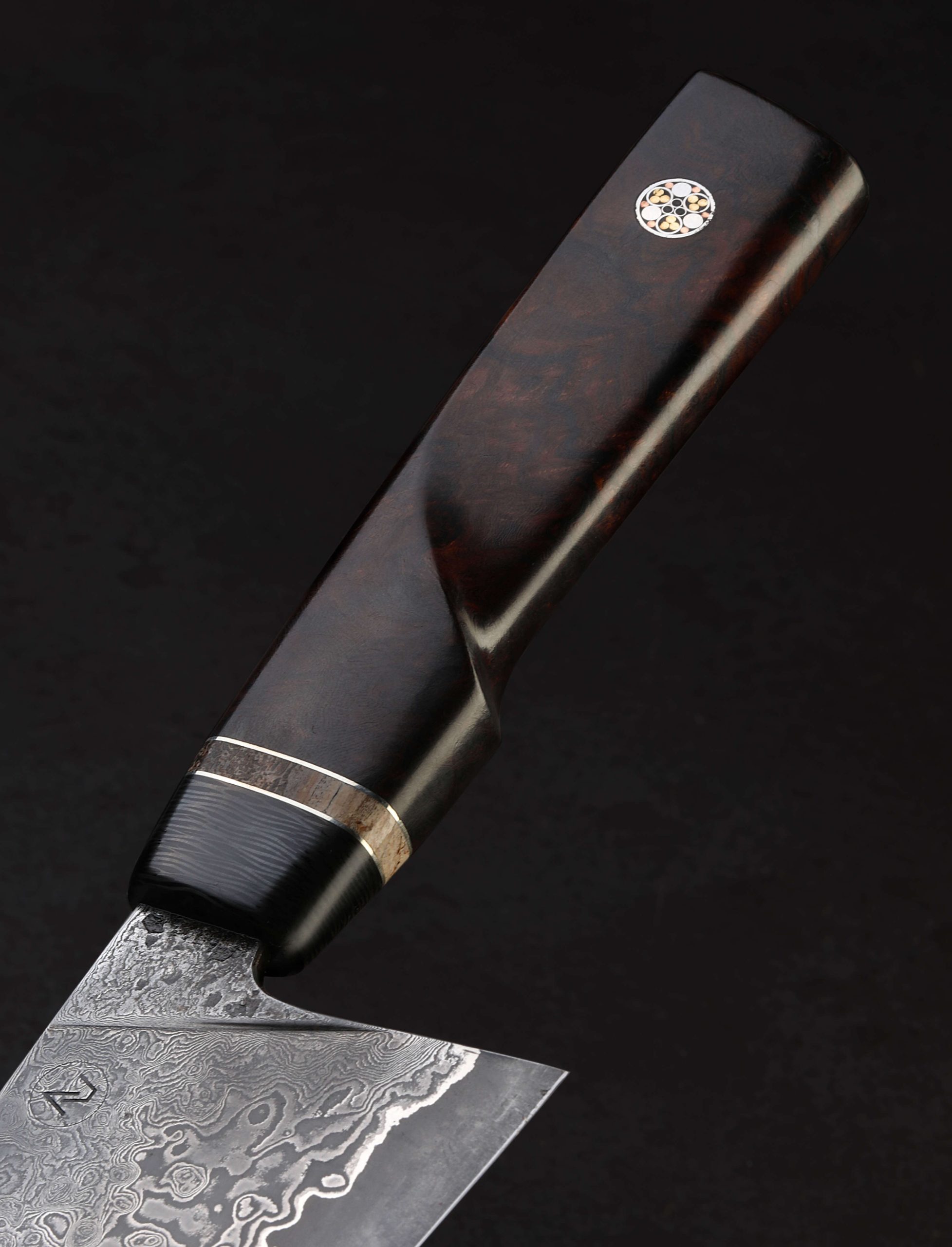 For our final Fingal Ferguson blade of 2024, a chef knife that checks all the boxes. Crafted at his studio in south-west Ireland for daily meal prep in home and professional kitchens alike, Fingal shapes a 230mm / 9.1″ blade from damascus-clad ApexUltra steel. This high-performance tungsten-carbon alloy was developed from the ground up specifically for use in knife blades by Eatingtools partner and metallurgist Tobias Hangler of Austria, and Tobias is also Fingal’s partner in this build, having created the damascus steel and resulting san-mai blade formula which Fingal used for this finished piece. Superb convex bevel geometry above a thin, hard, and sharp edge defines the versatile blade destined for cutting greatness, its long, flat stretch in the rear positioned perfectly for big chopping tasks, with the upswept front portion and slim, needle-like tip ideal for slices and detail work of all variety. Deeply etched and polished to a beautiful sheen, both the nickel-rich 15n20 in the damascus cladding, and the vein of pure nickel between it and the core which inhibits carbon diffusion from the edge, shine brightly, while the ApexUltra becomes a handsome, matte black. As the blade’s tang enters the handle, hammer marks showing the material’s hand-forged origins are visible. The tang disappears first into a collar of carbon fiber, rounded and comfortable beneath the fingers. Then, between polished rings of stainless steel, the knife’s namesake is revealed: dating to Earth’s Cretaceous period, over 93-million years ago, is a ring of a Spinosaurus’ fossilized spine bone. The colors and markings within it are unlike those of other materials we know. Completing the build in Fingal’s ergonomic and recognizable form that offers both comfort and control is a piece of sculpted Arizona Dessert Ironwood capped with a mosaic pin of steel, copper, and brass.
