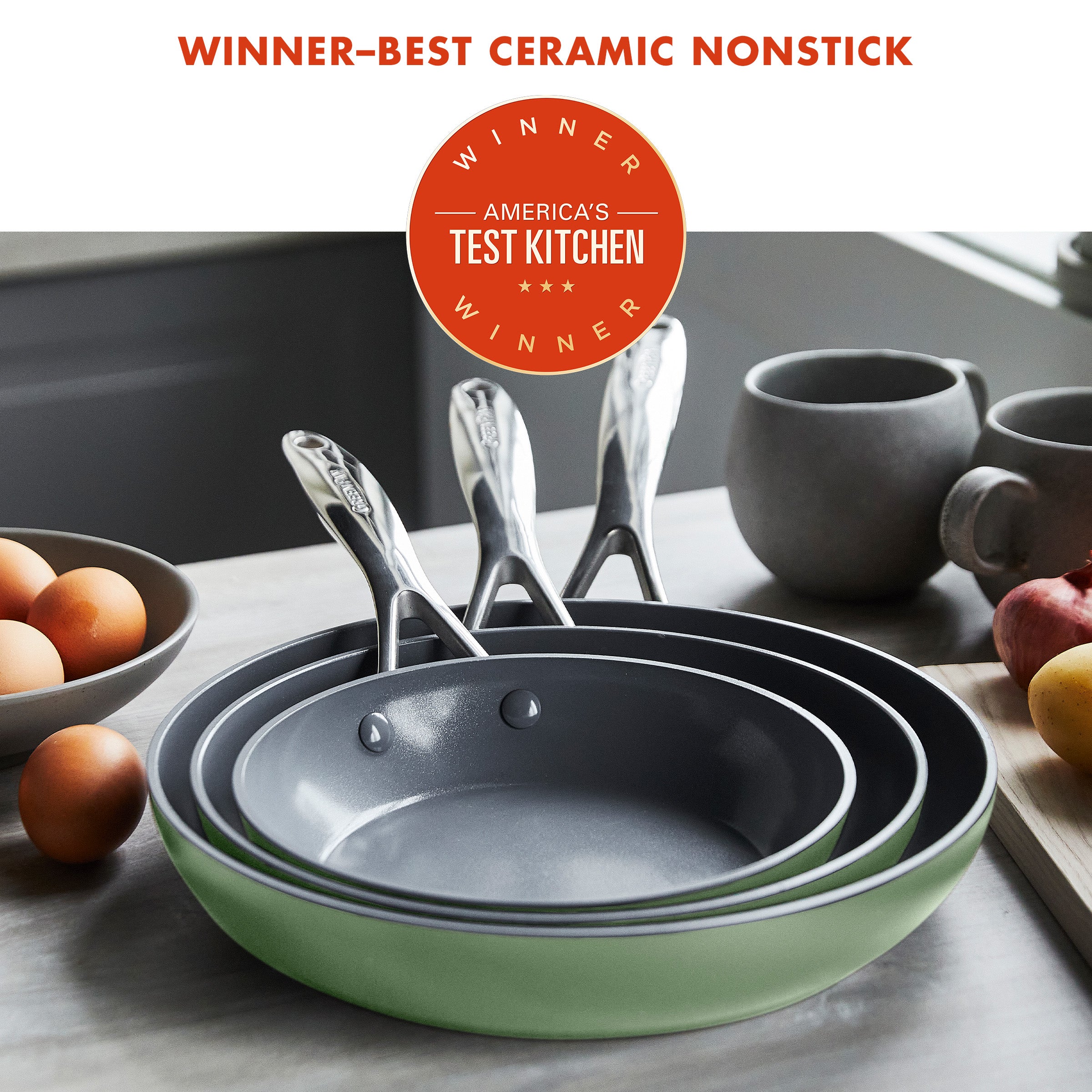 Valencia Pro Ceramic Nonstick 8″, 9.5″, and 11″ Frypan Set | Sage