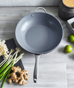 Gently sloped sides and an eye-catching stainless steel exterior make this 12″ wok remarkable for a wide range of techniques, from frying to braising. The handy lid is great for steaming and the helper handle makes sure you have total control.