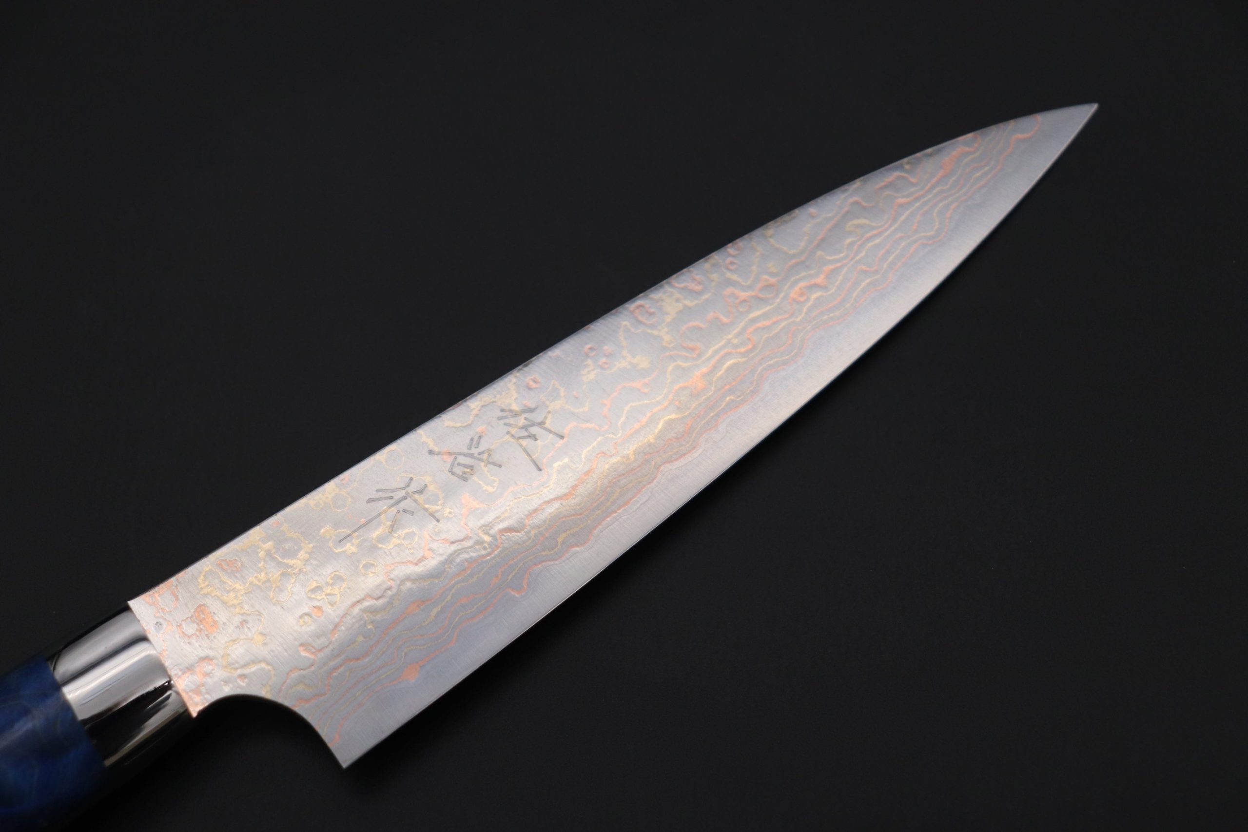Master Saji has just completed a fresh new batch of traditional hammer forged custom kitchen knives that, once again, feature his unique multi-colored and beautiful polished Damascus. The blades have a core of VG-10W Cobalt-Tungsten Stainless steel (HRC. 61 to 62), which has been clad with multiple layers of rust-resistant stainless steel, brass and copper.