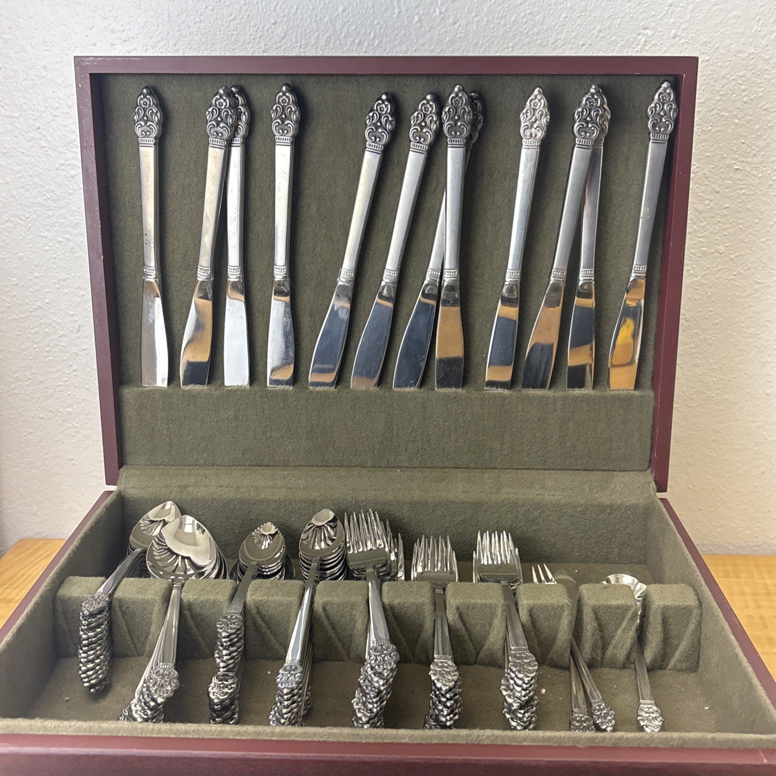 Condition Description: See images, ask questions. Some wear on some flatware pieces and scratches / cracks on the wood as seen in images.