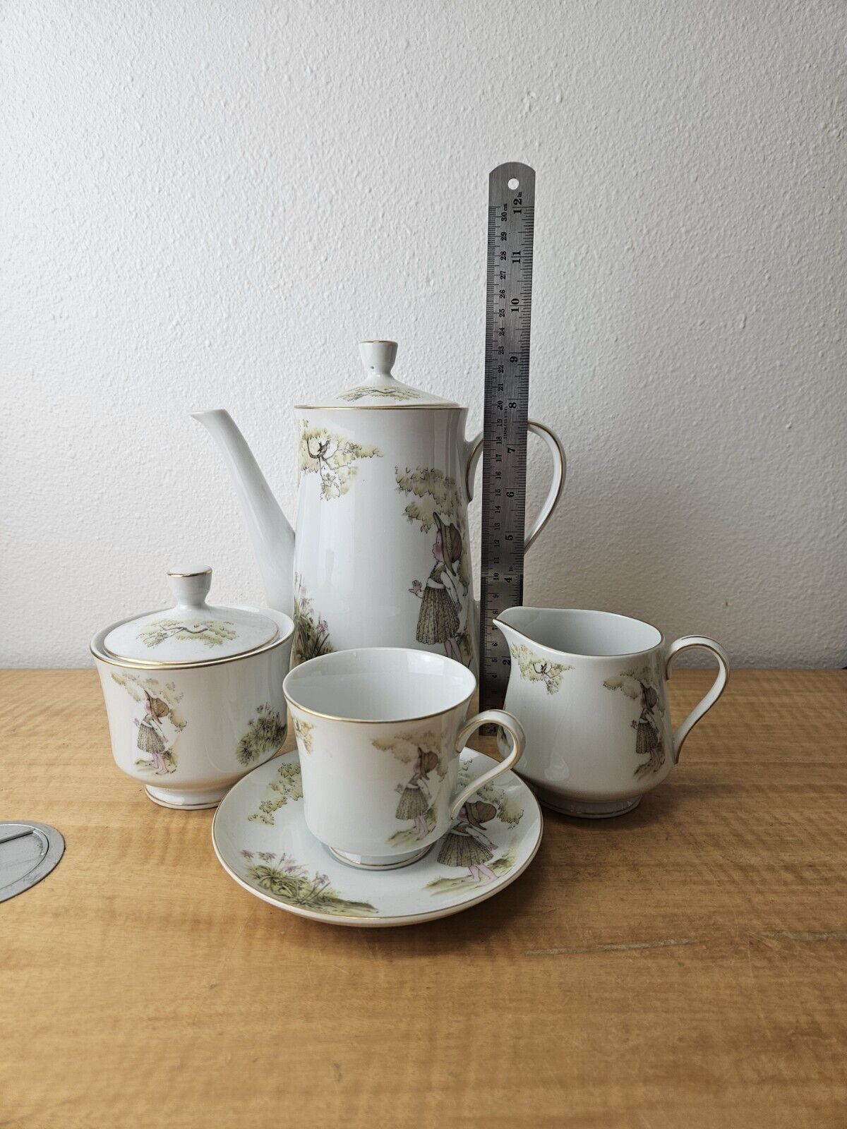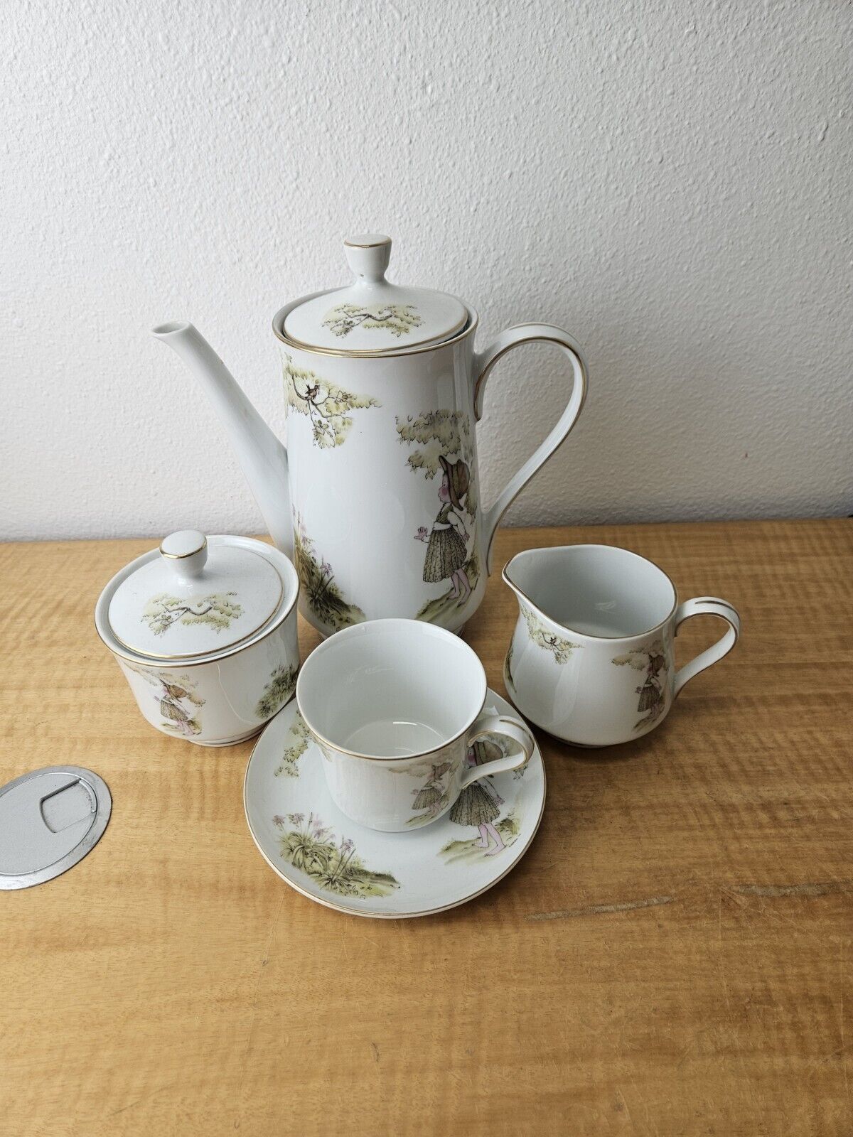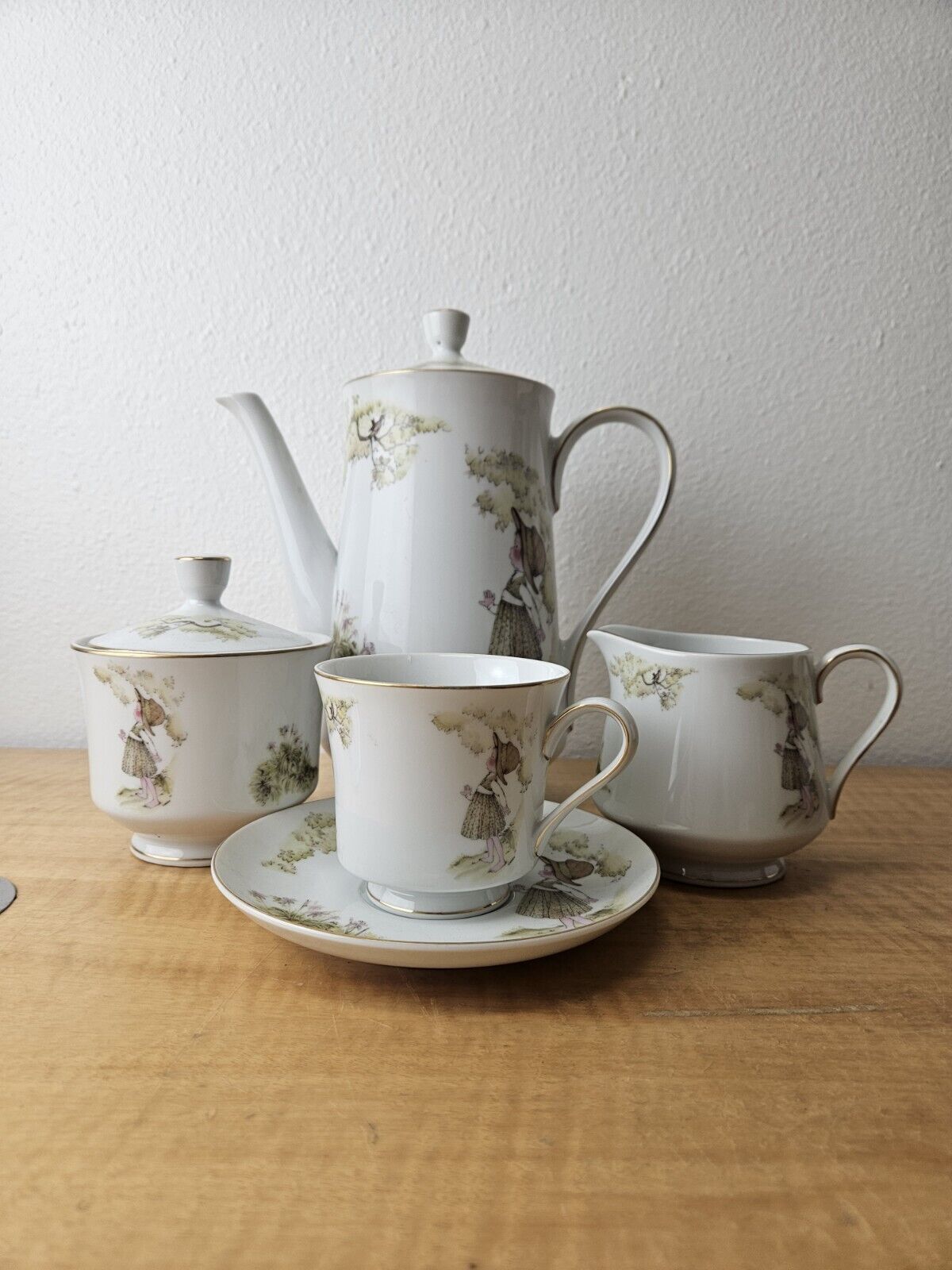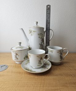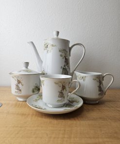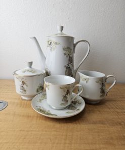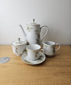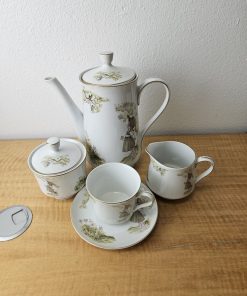 set includes pot with lid, creamer, sugar bowl with lid, 6 cups, 6 saucers.