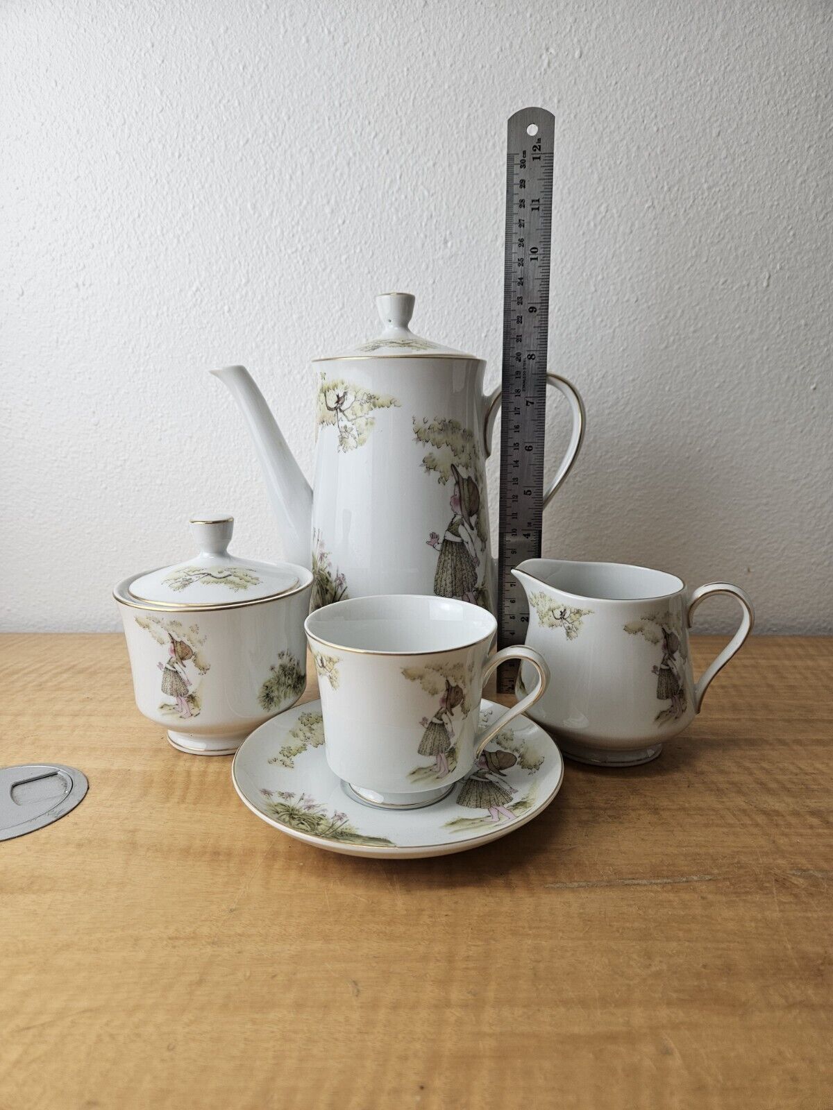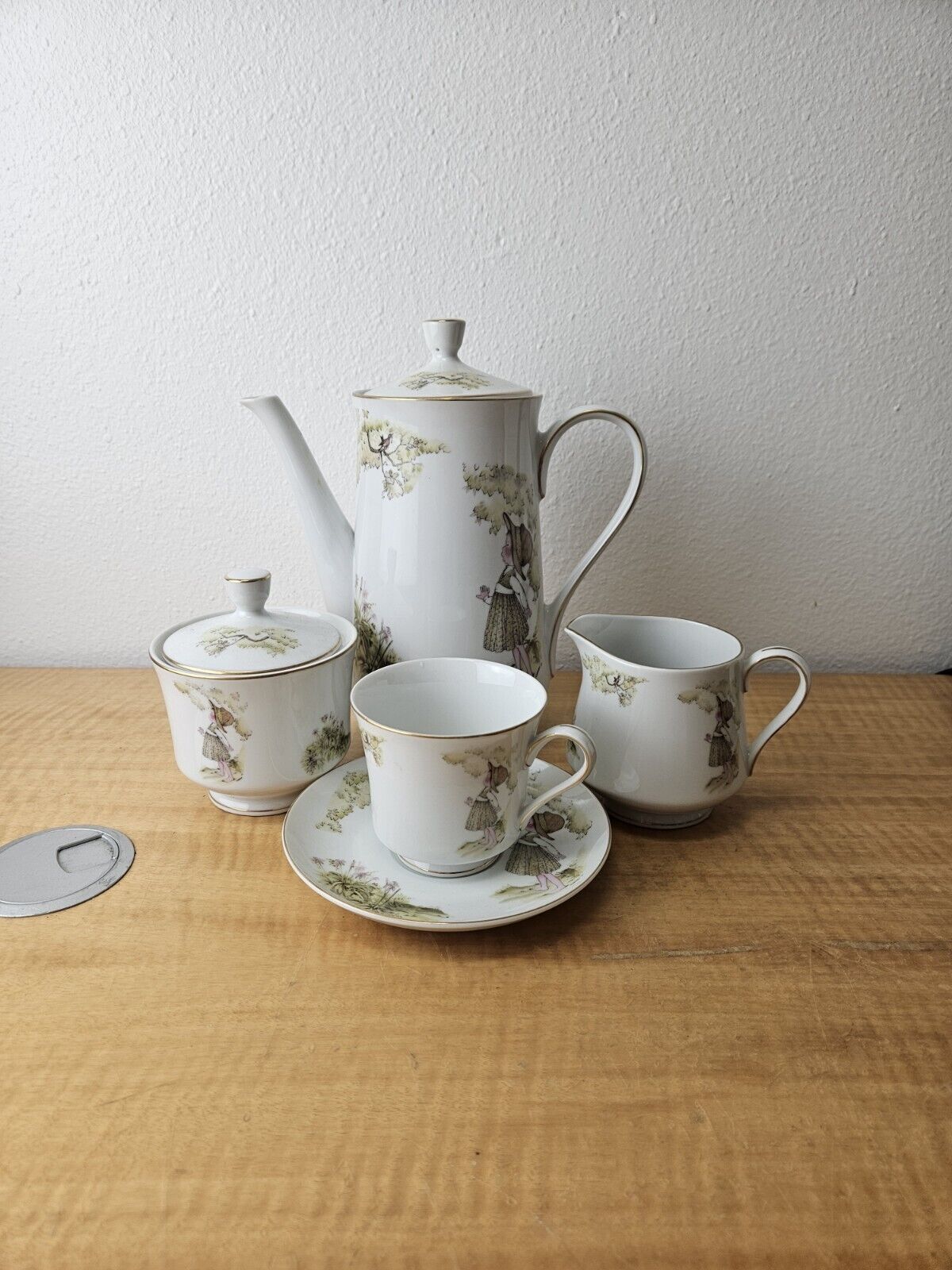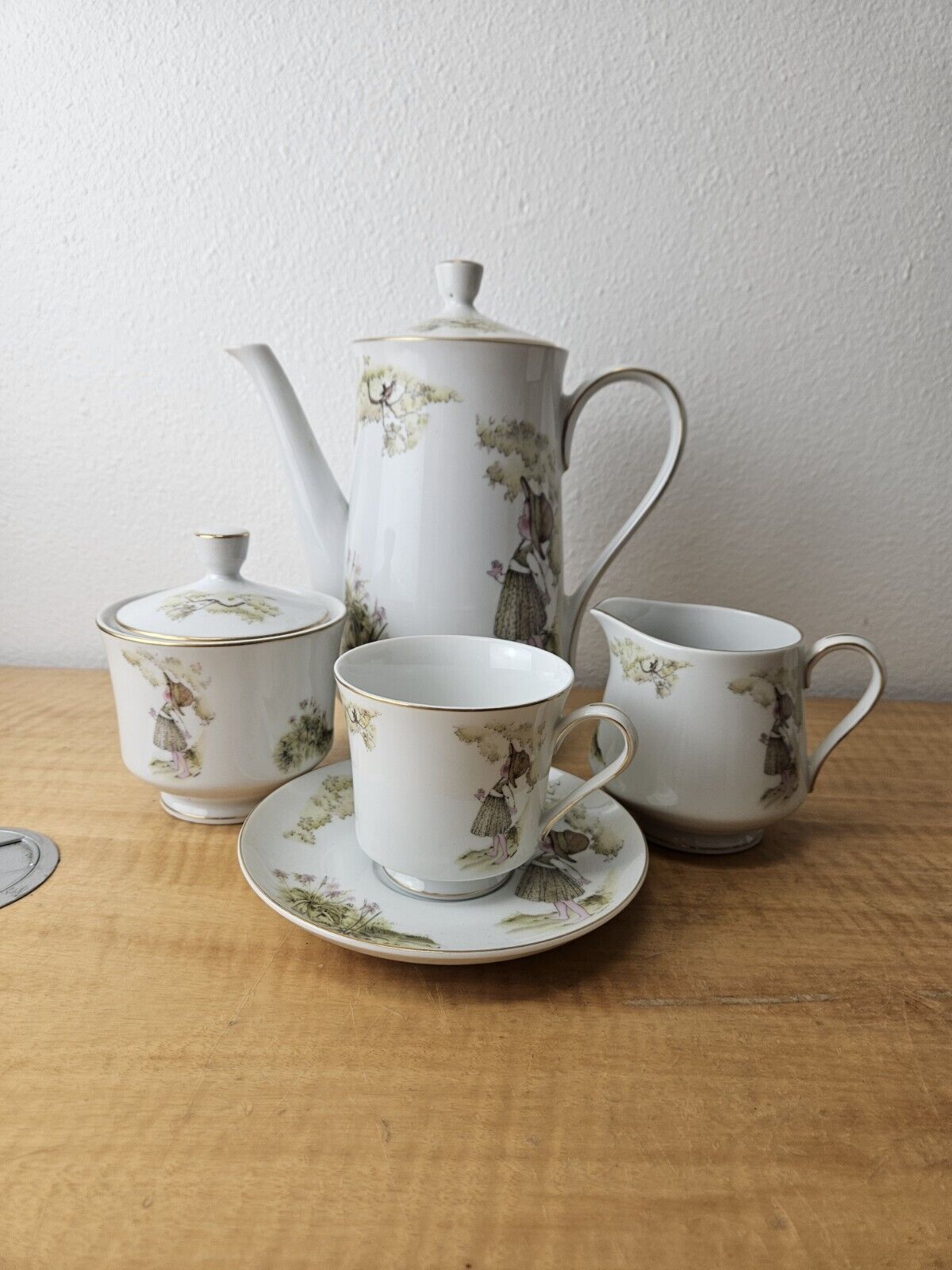 set includes pot with lid, creamer, sugar bowl with lid, 6 cups, 6 saucers.
