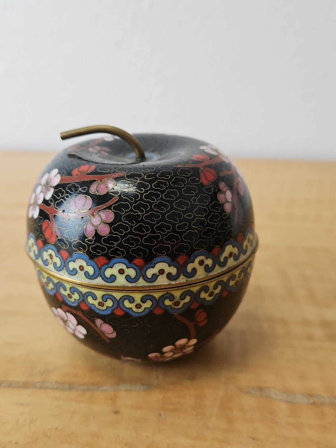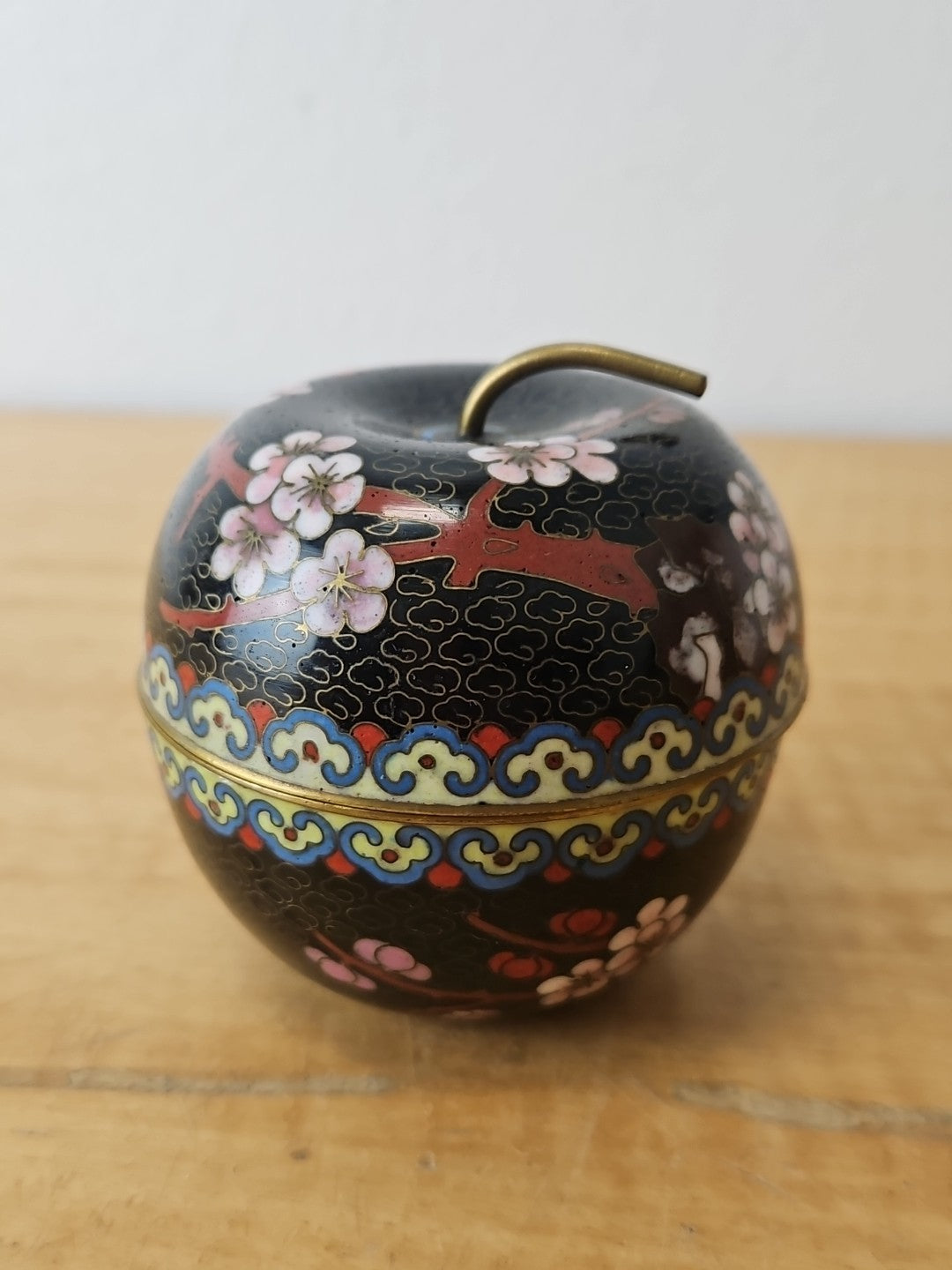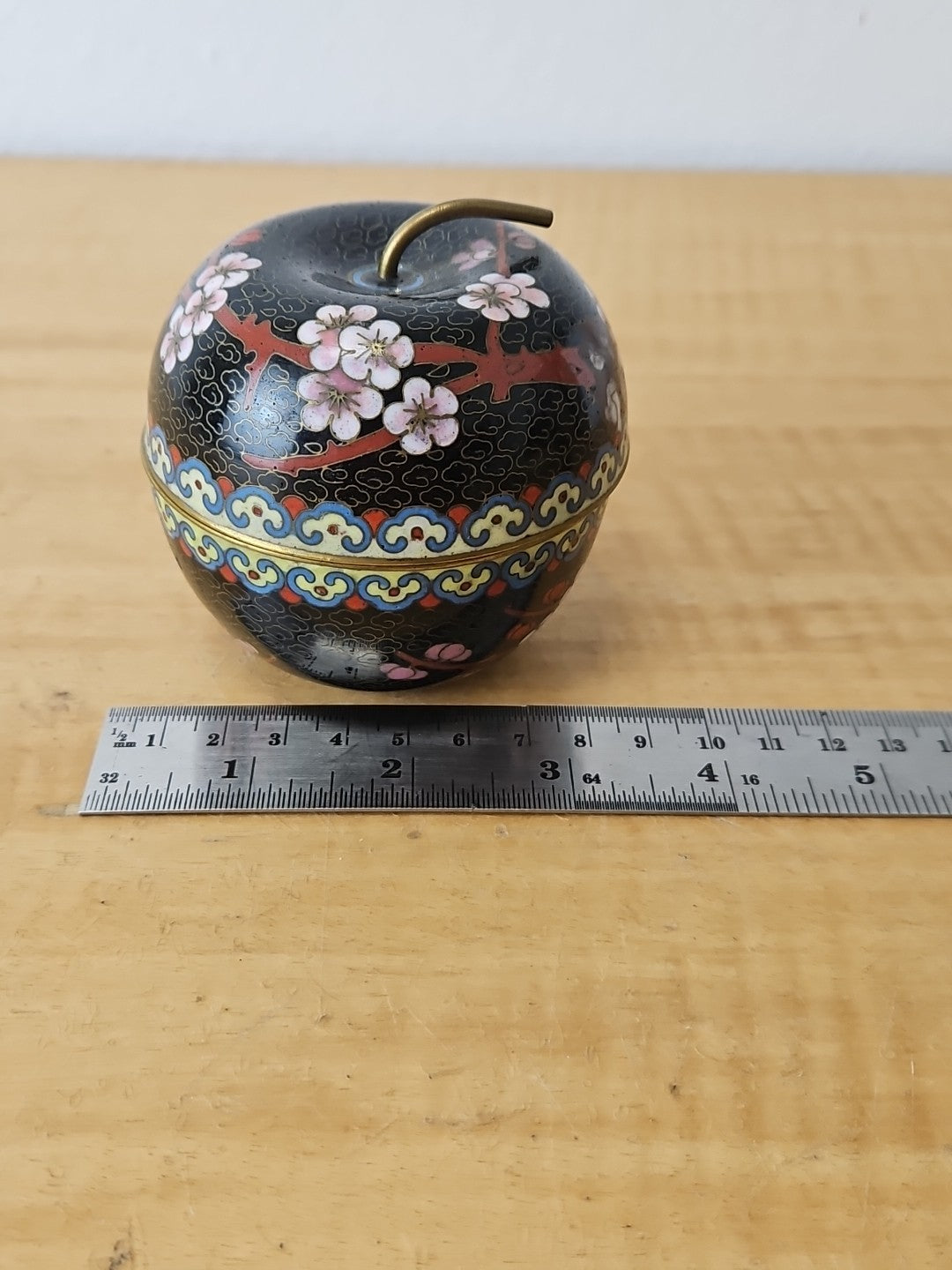 Vintage Apple Trinket box Chinese Cloisonne Flowers MCM blue interior