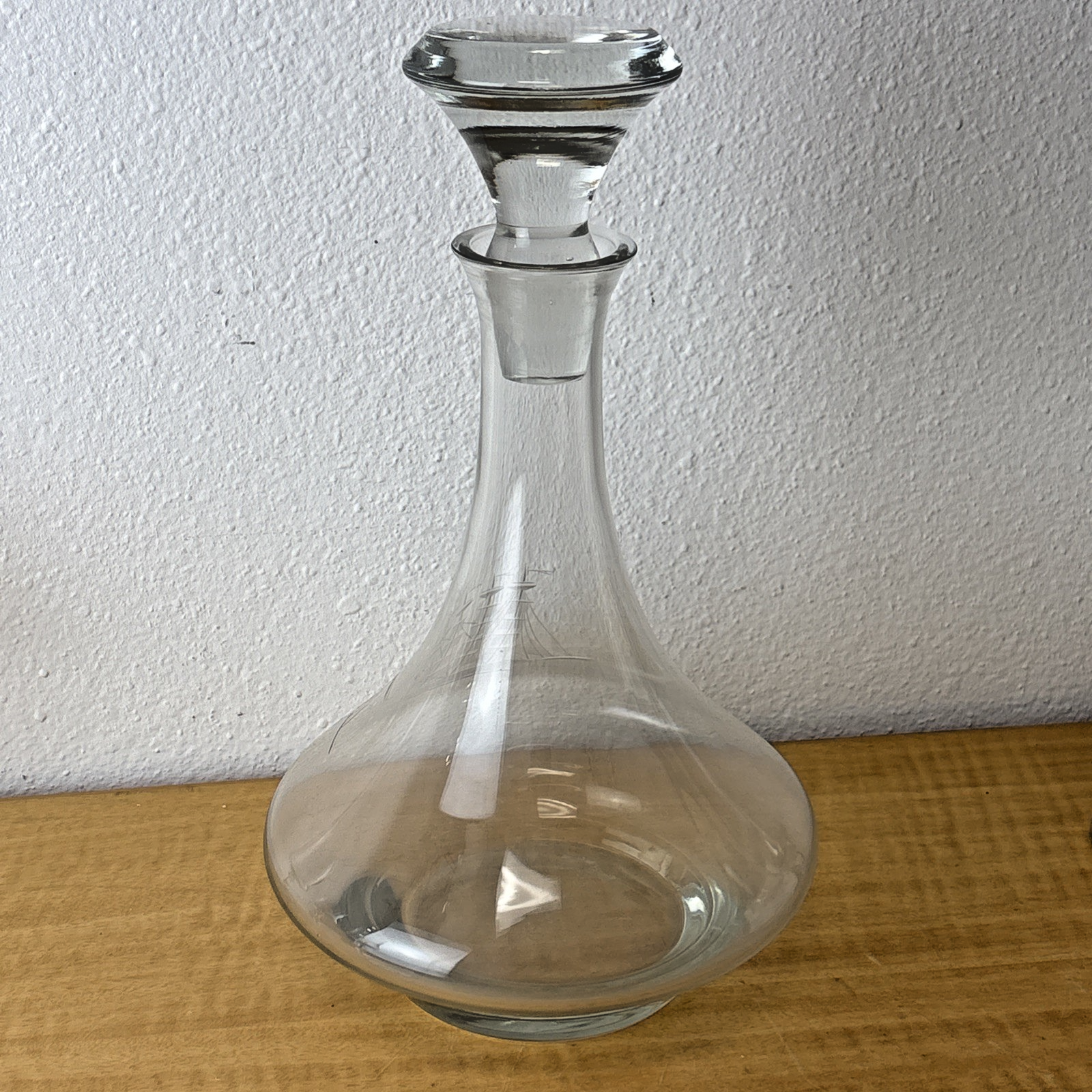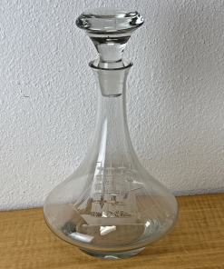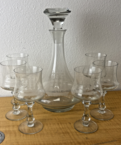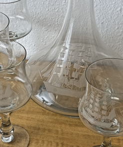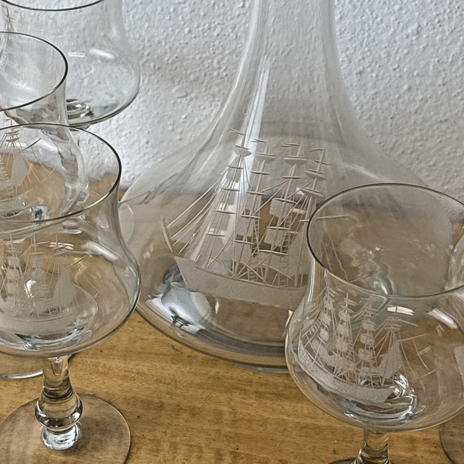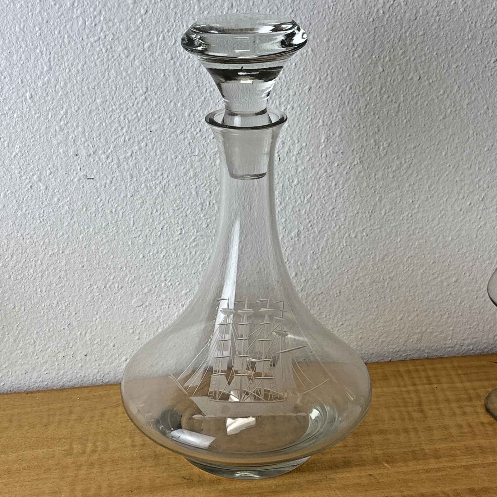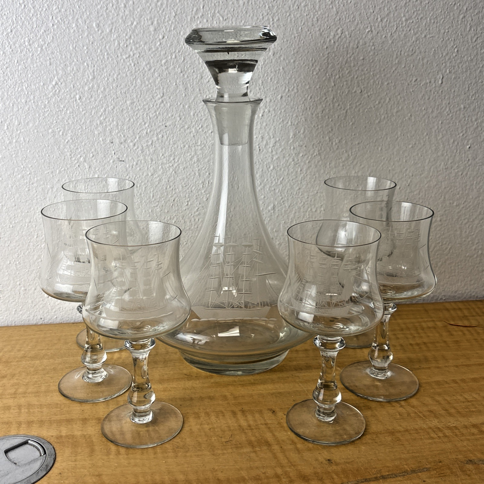 Vintage Art Deco Ship Etched Decanter Set Six Glasses Office Bar Study Gift