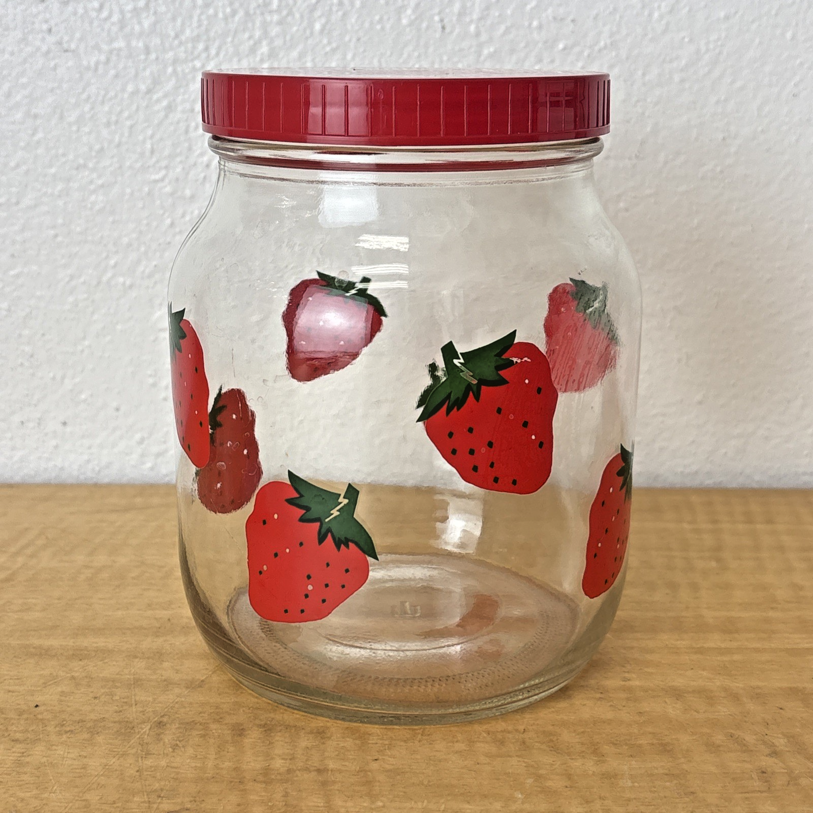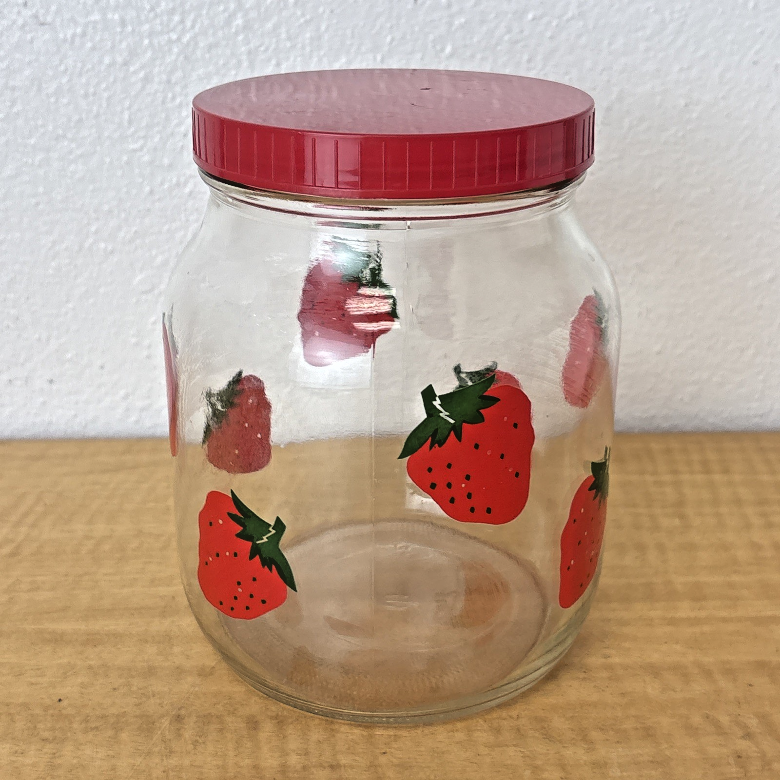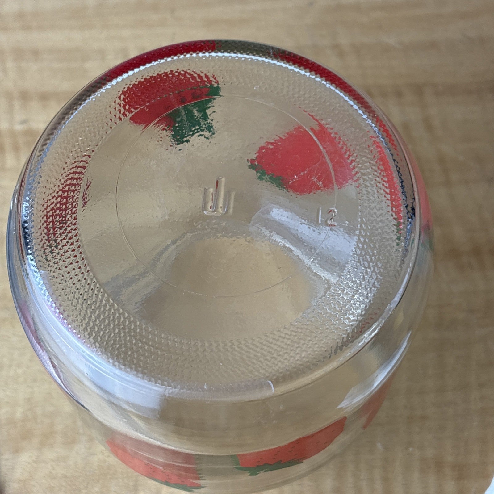 Vintage Glass Jar Container Canister w/ Strawberries Red Lid