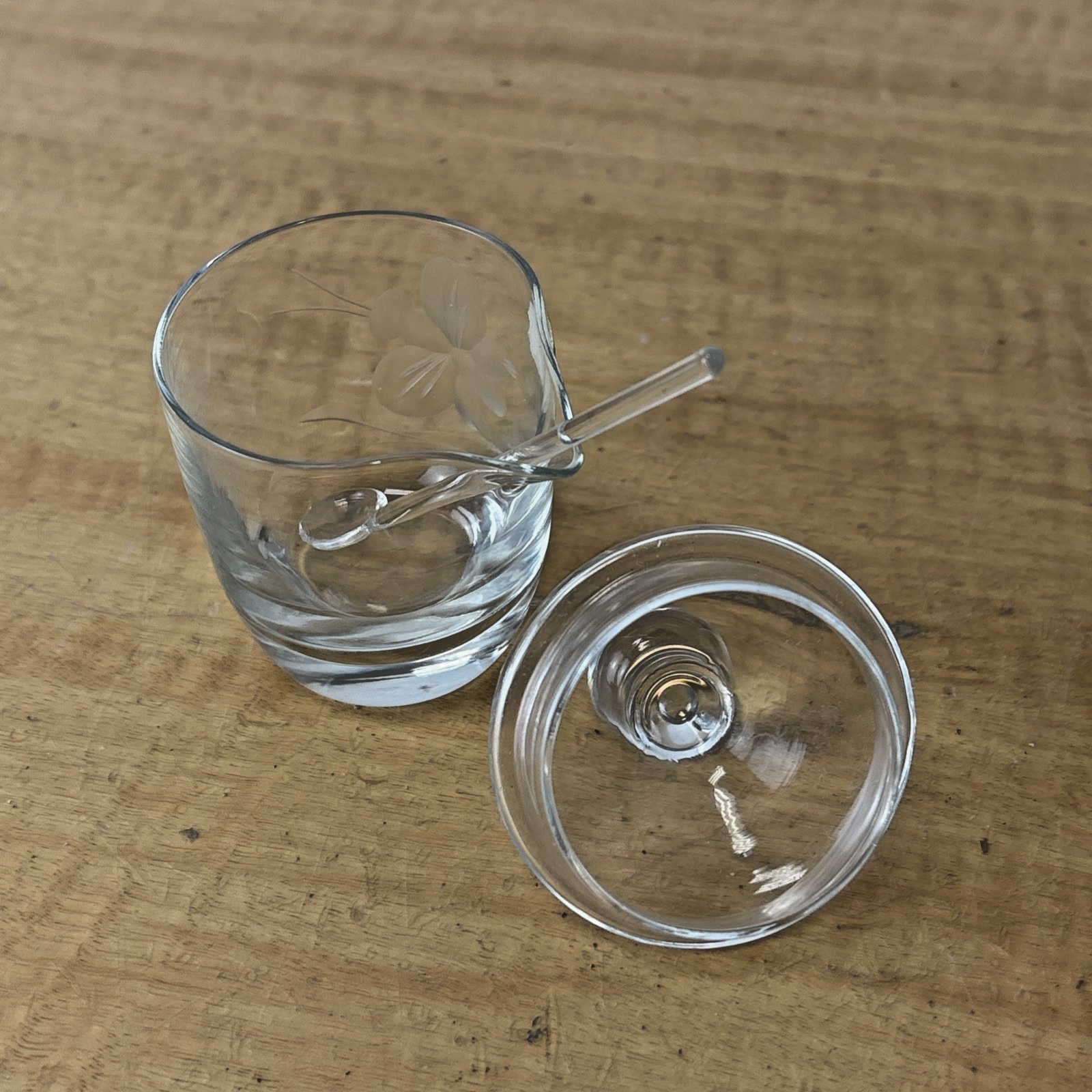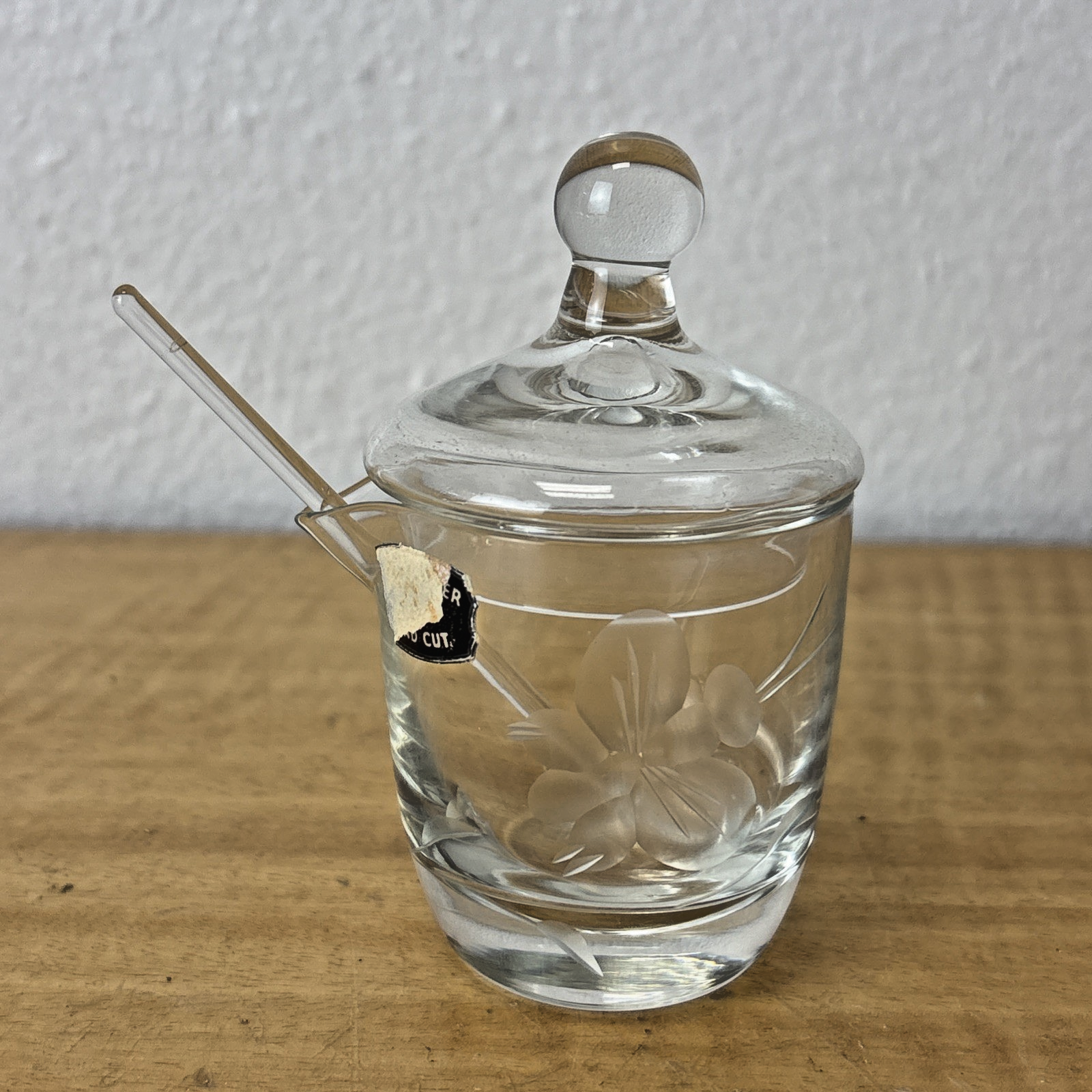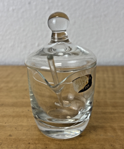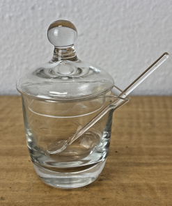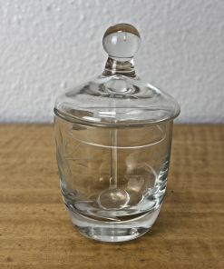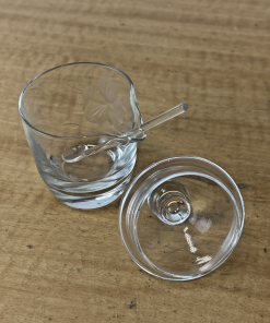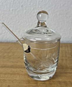 Vintage Hand Cut Glass Jam Jelly Condiment Jar w Spoon Etched Dragonfly