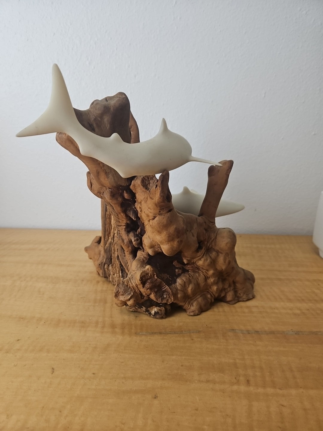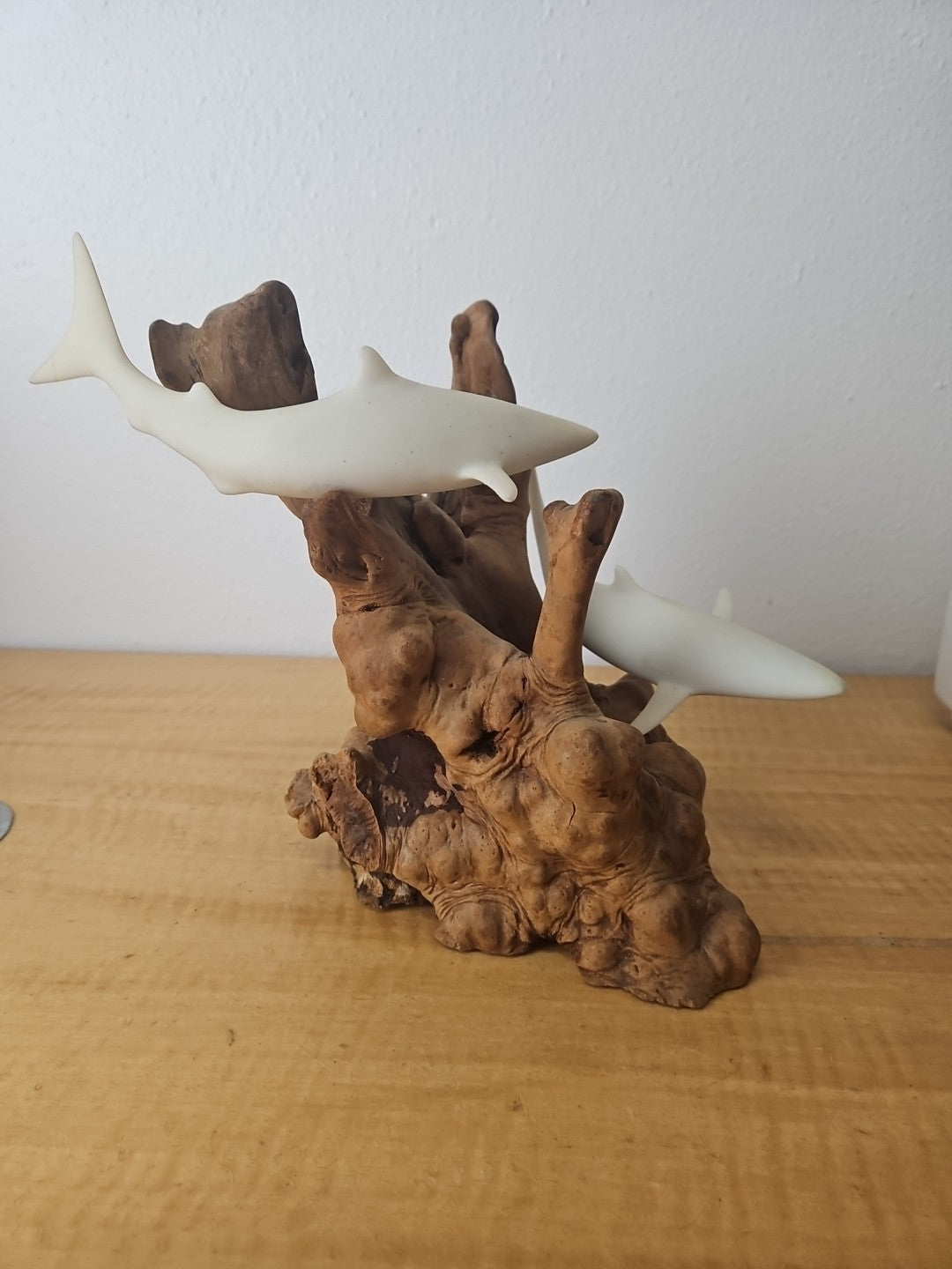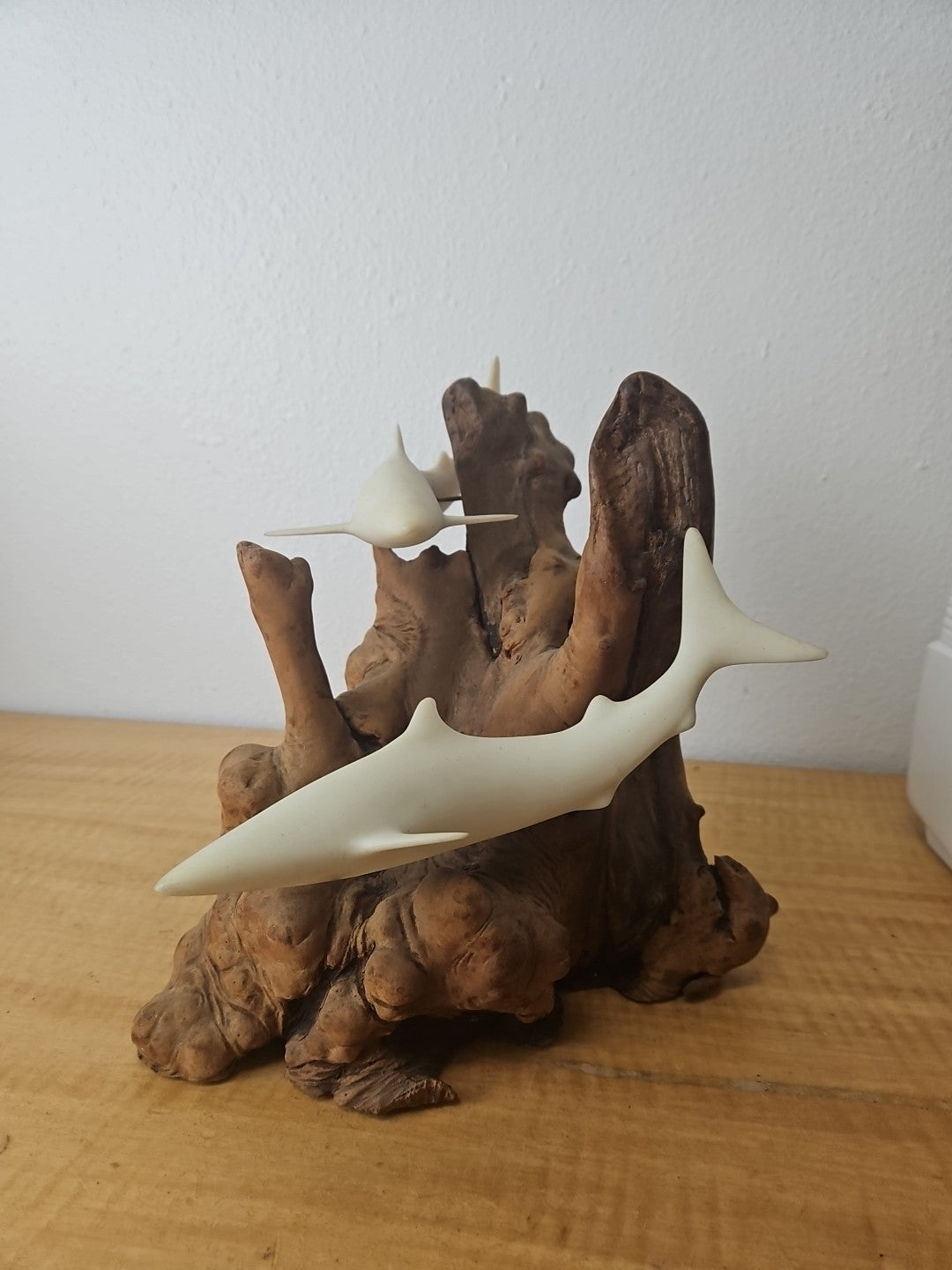 Vintage John Perry Two Shark Sculpture on Burled Wood Base 10x10x10 ’78