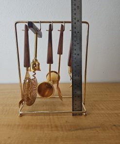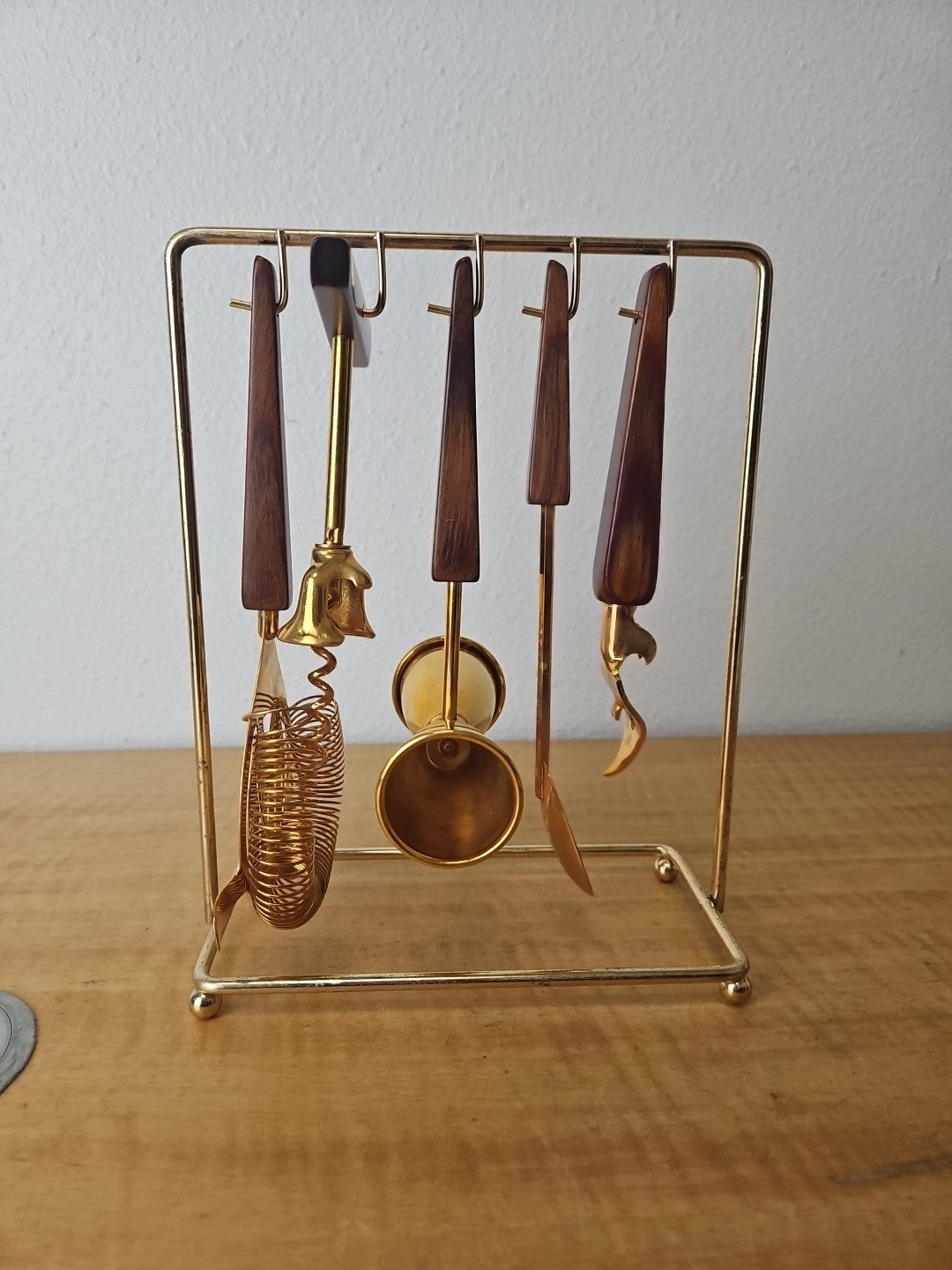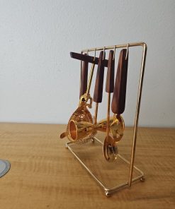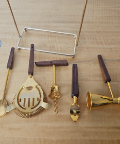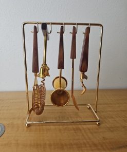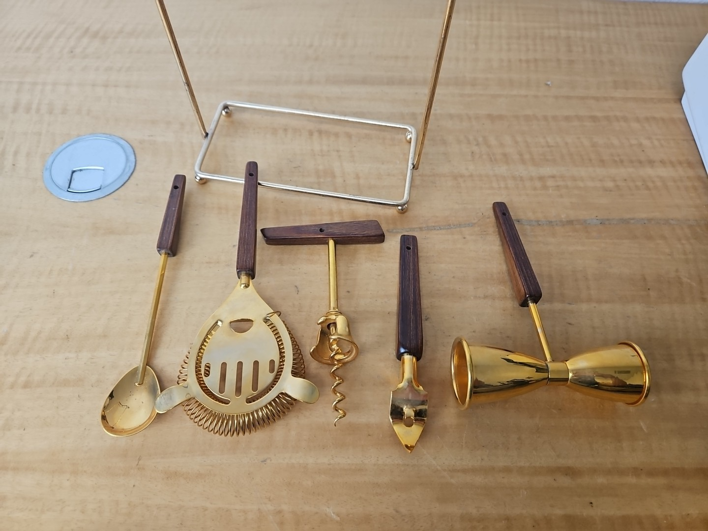 Vintage MCM 5 piece gold/wood bar tool set with stand/rack
