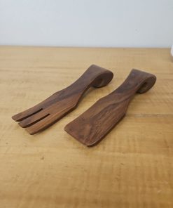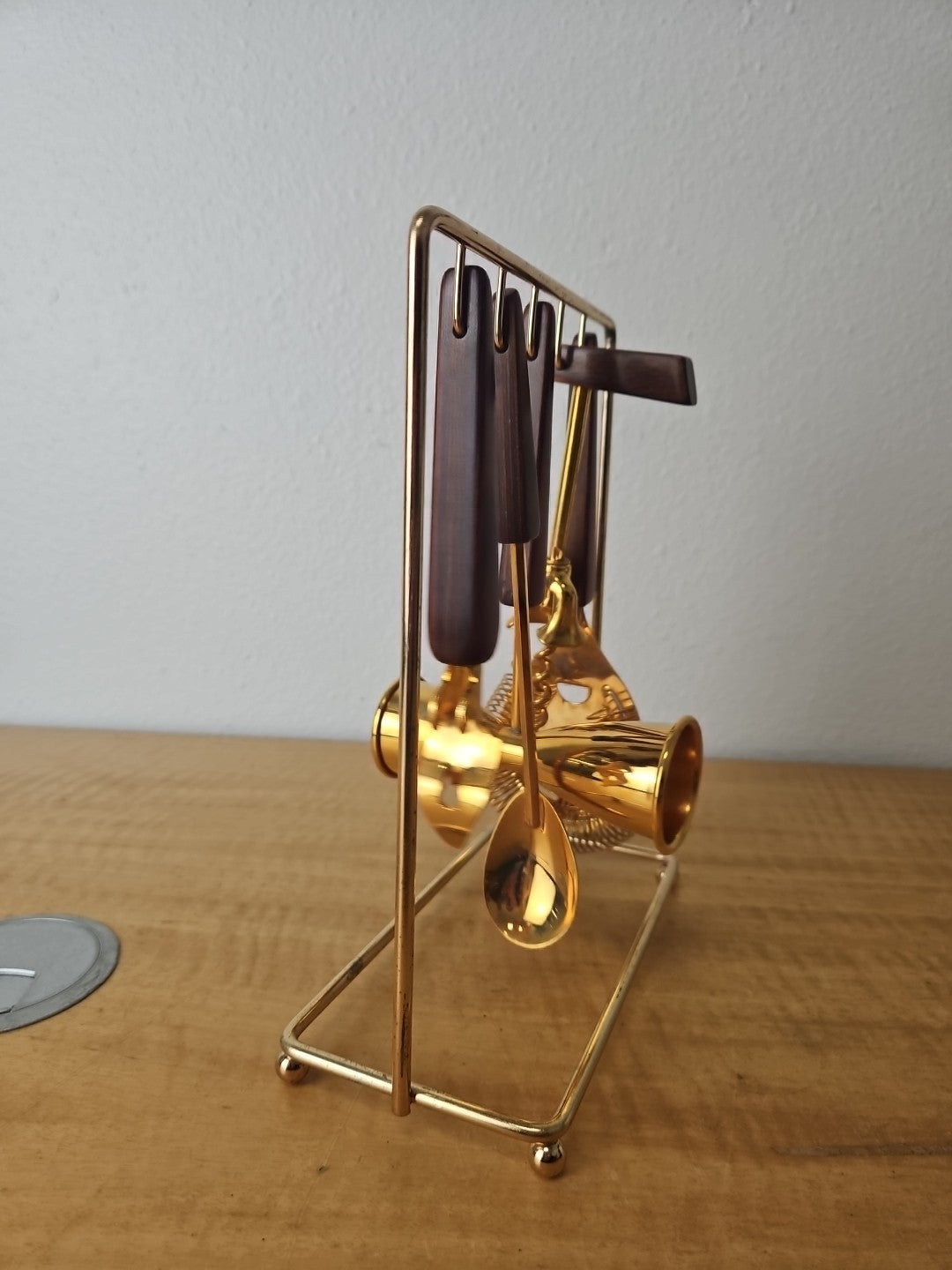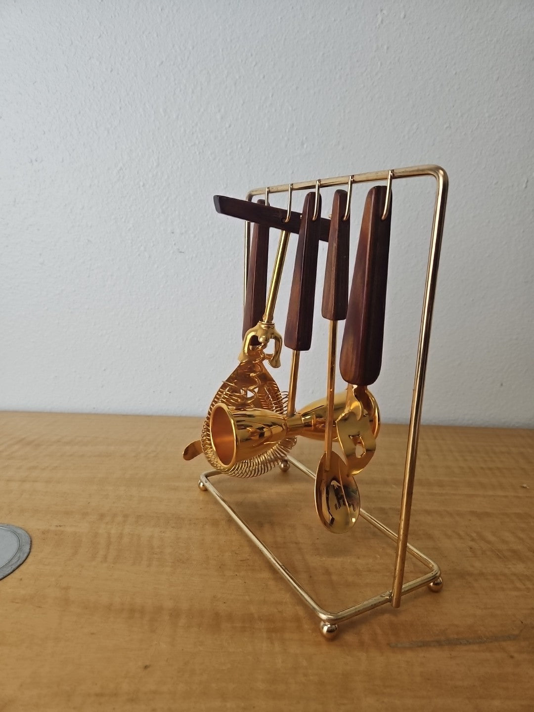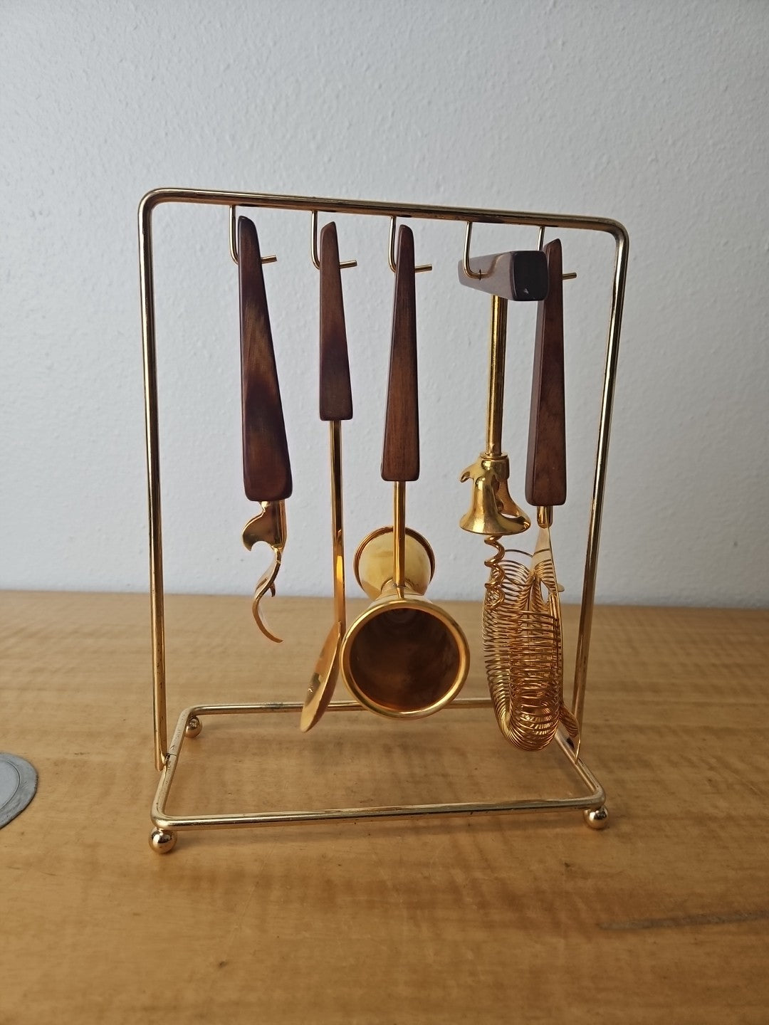 Vintage MCM 5 piece gold/wood bar tool set with stand/rack