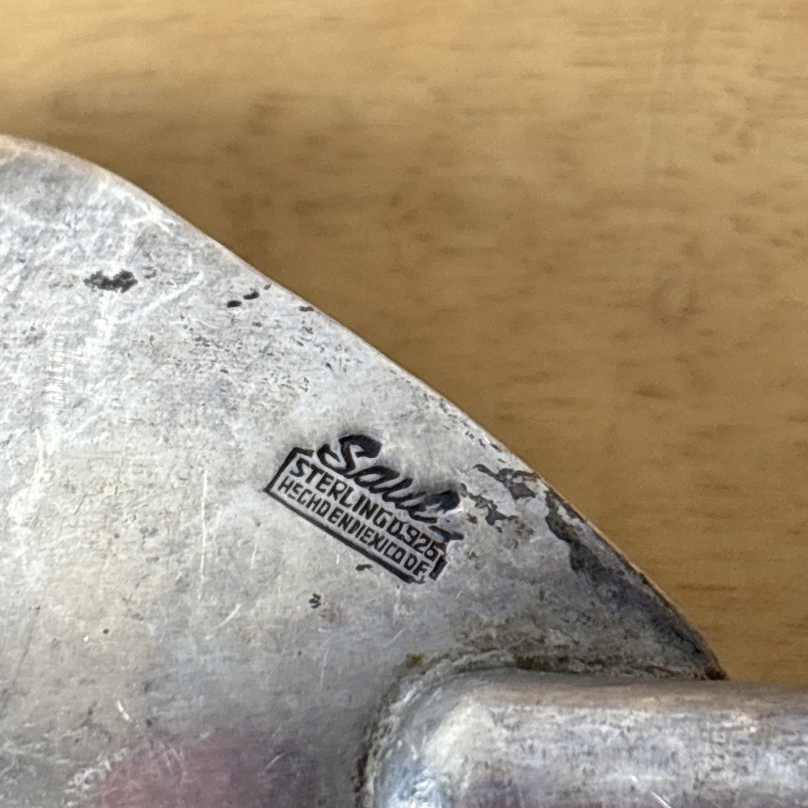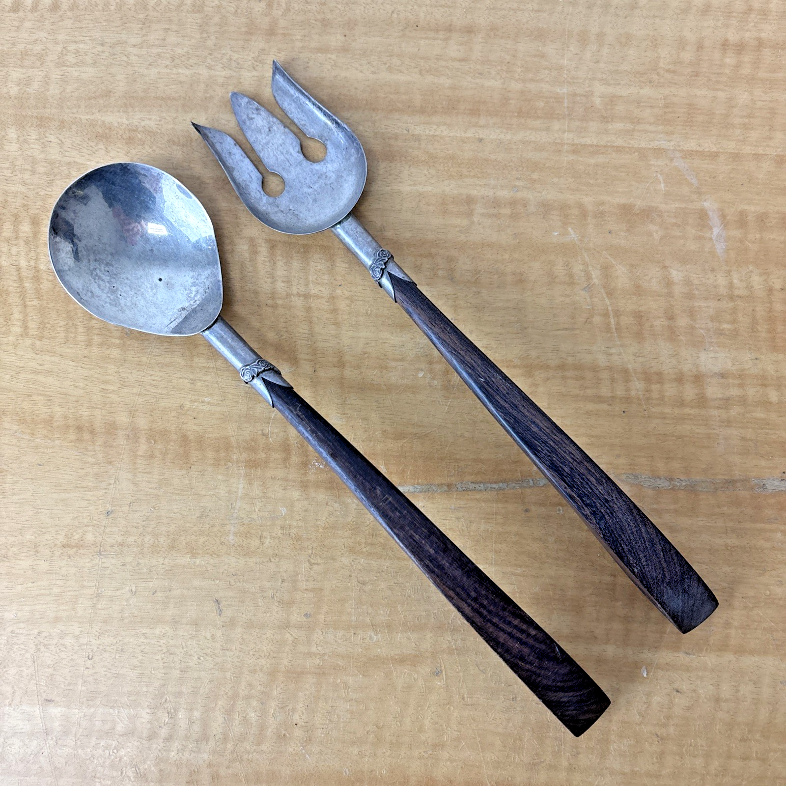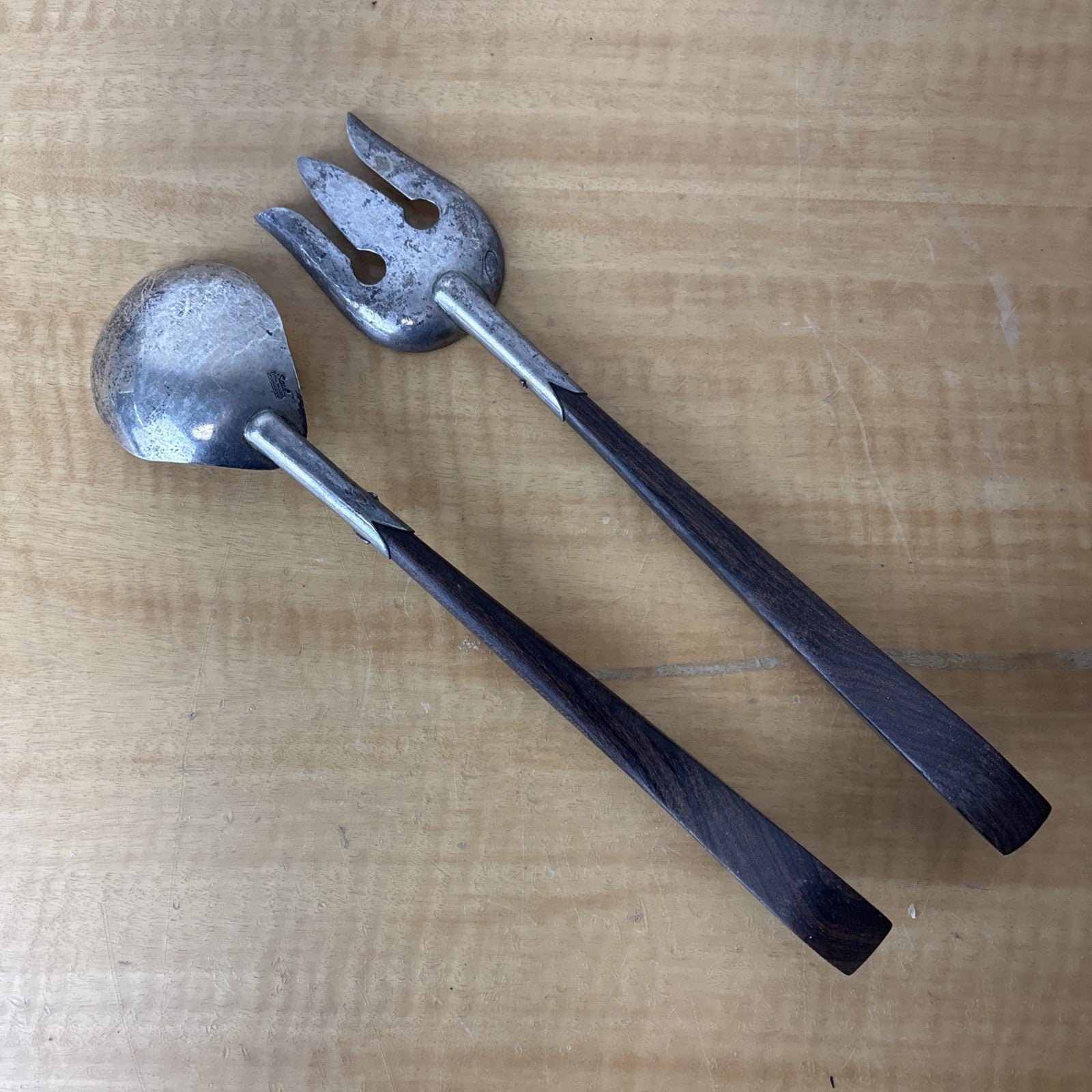 Vintage Mexico Sterling Silver Wood Teak Salad Set Fork & Spoon Mid Century Saul