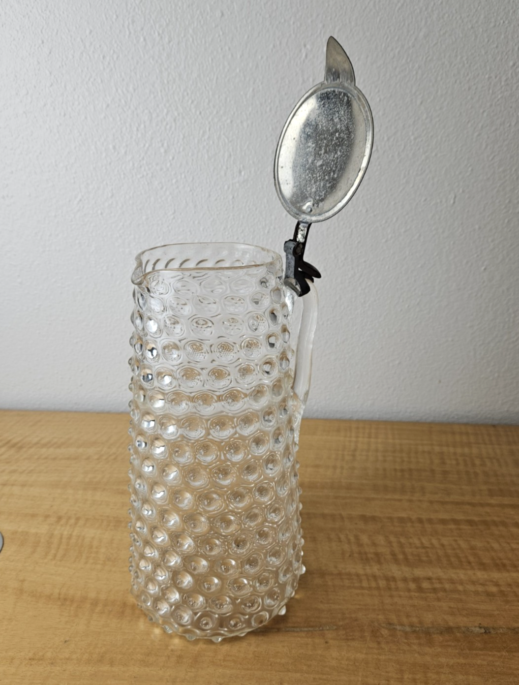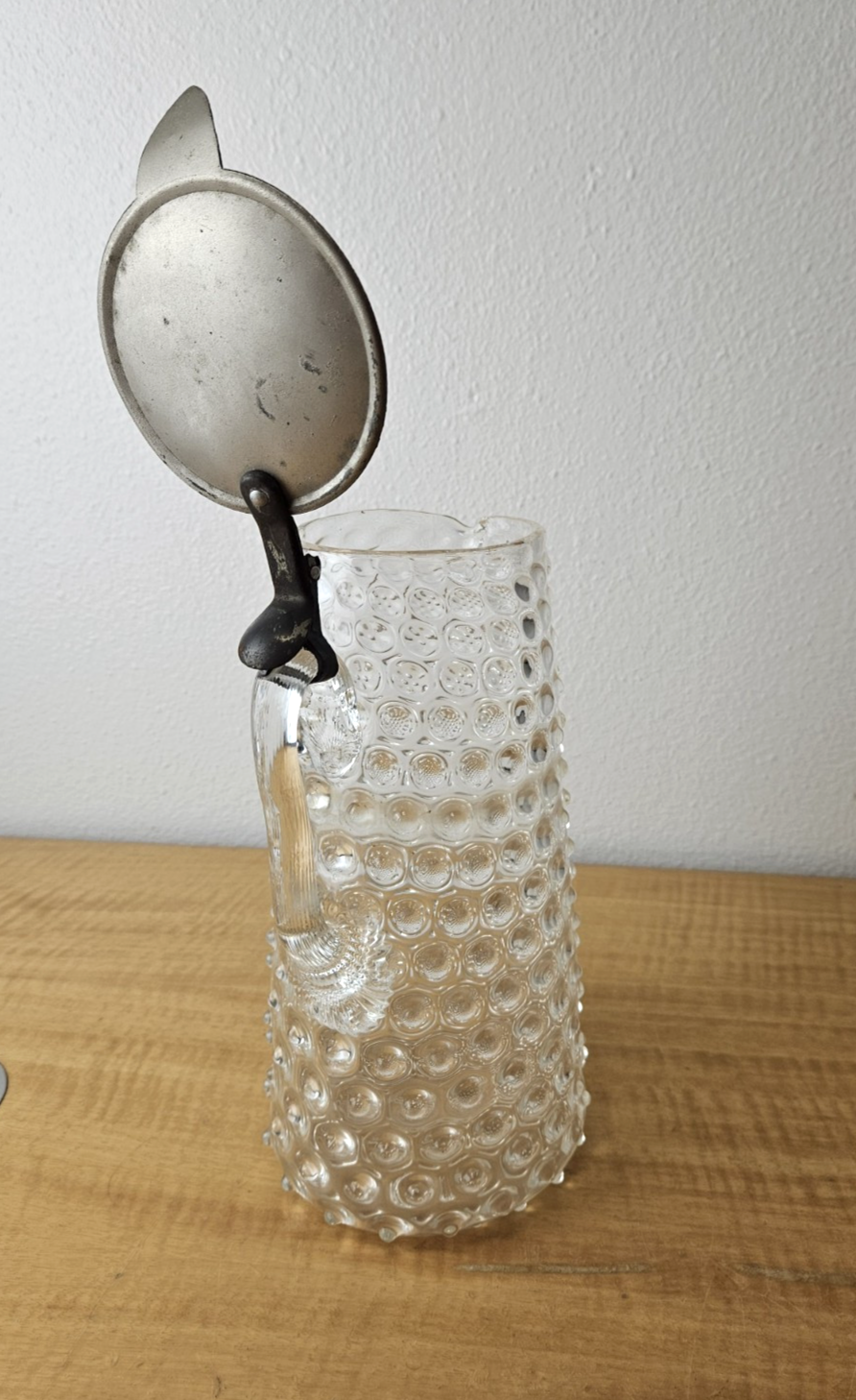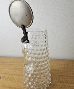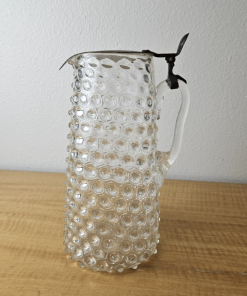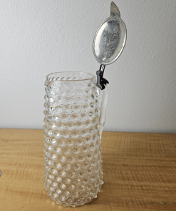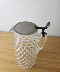 Vintage Pitcher with hinged metal lid Clear Glass Hobnail Pitcher 10″