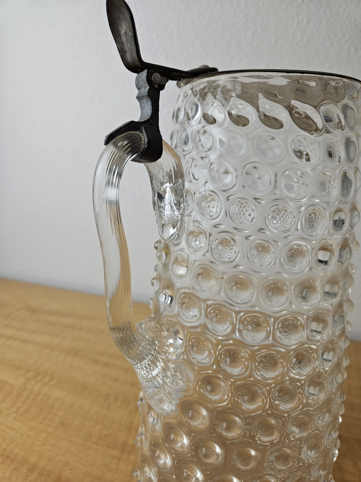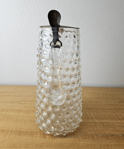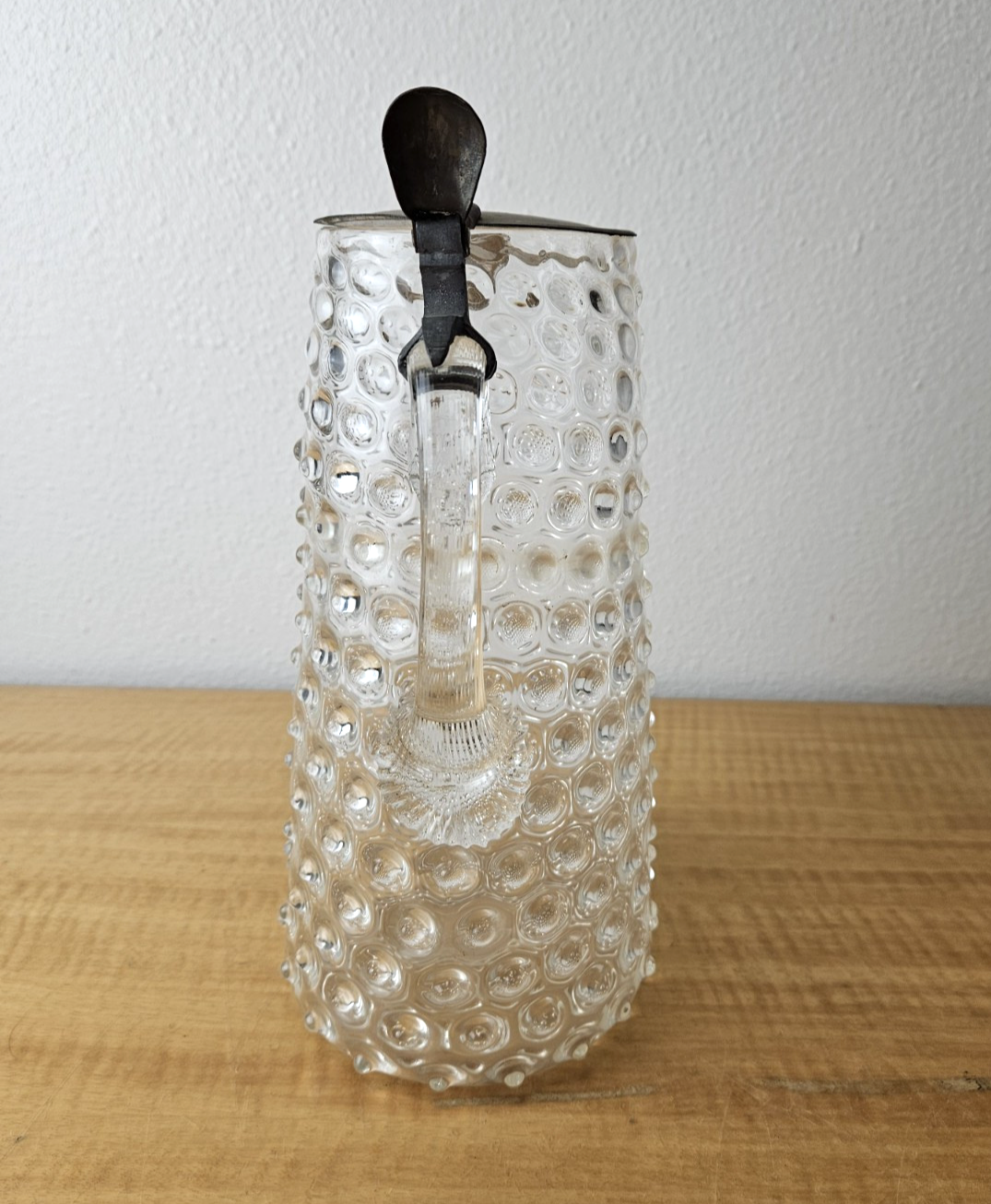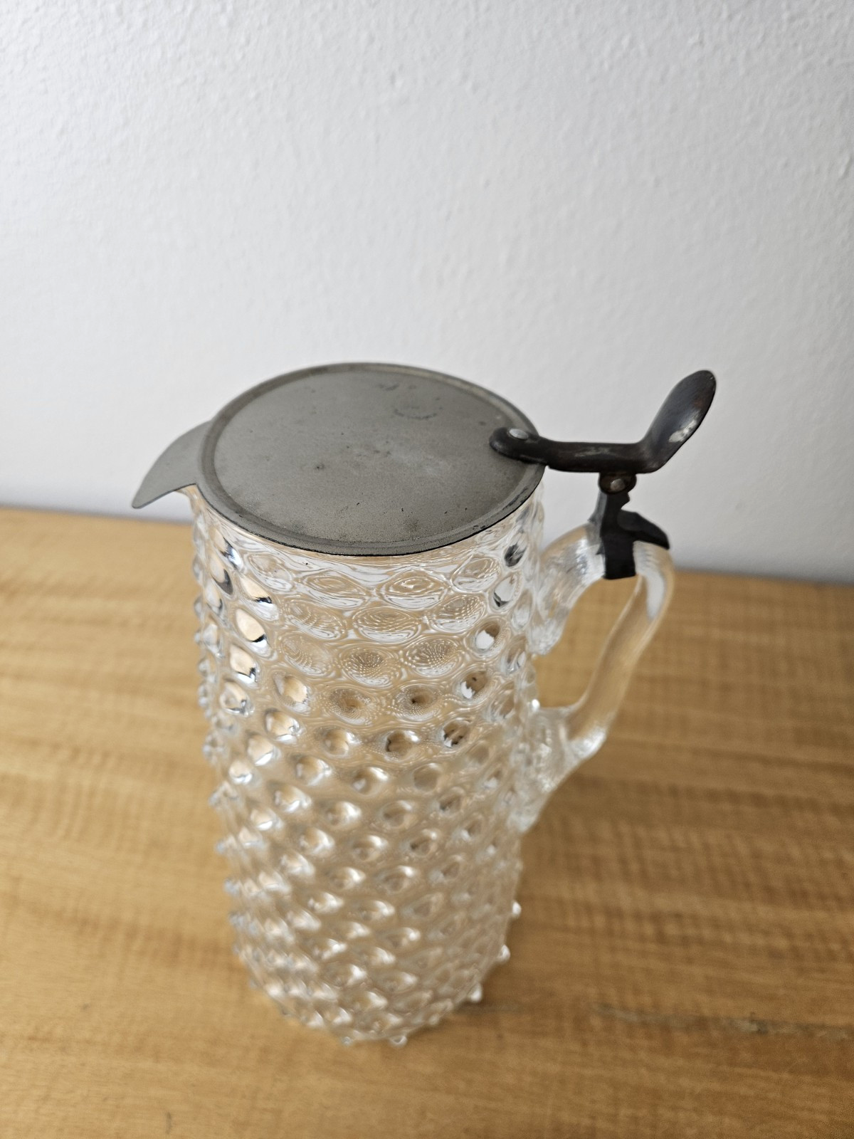 Vintage Pitcher with hinged metal lid Clear Glass Hobnail Pitcher 10″