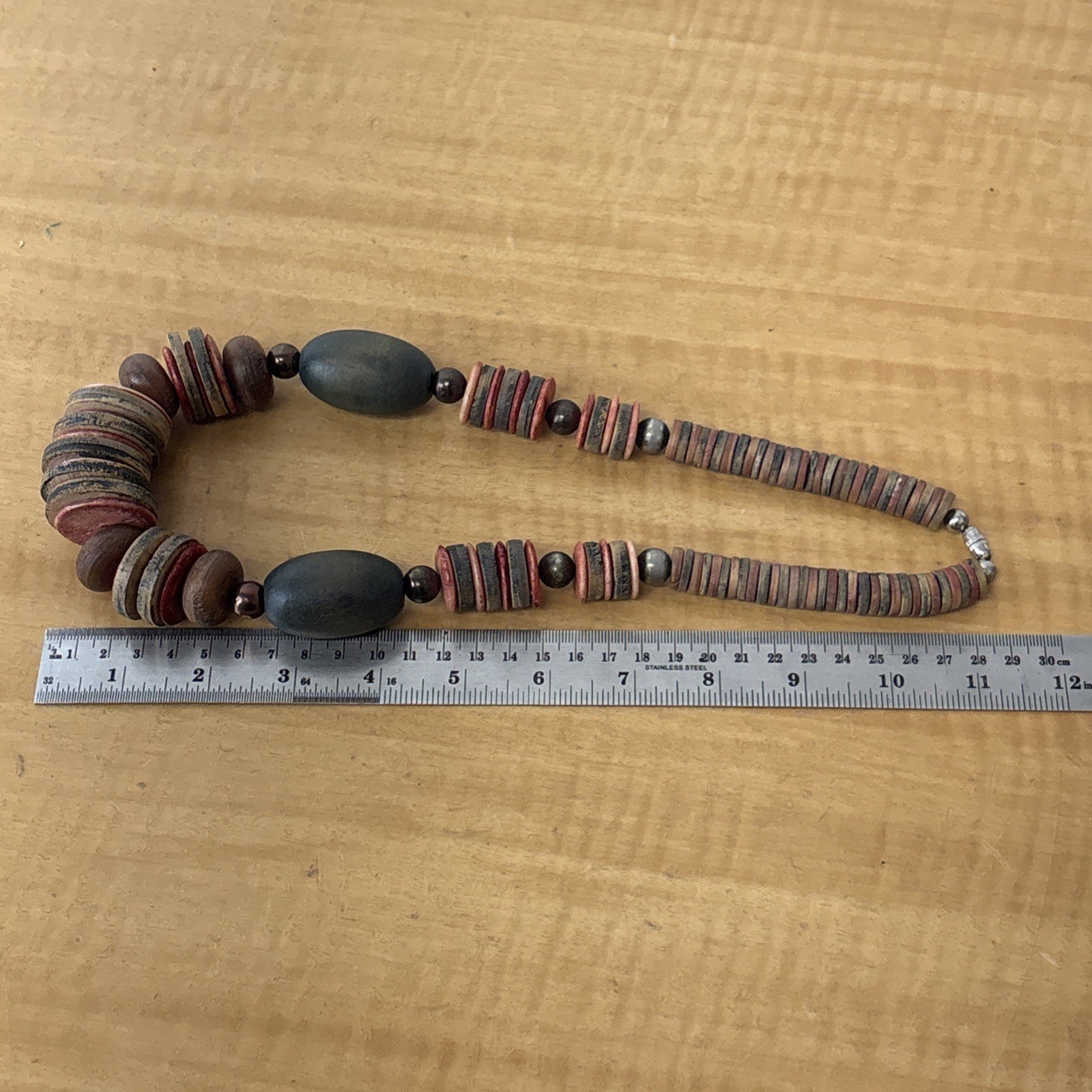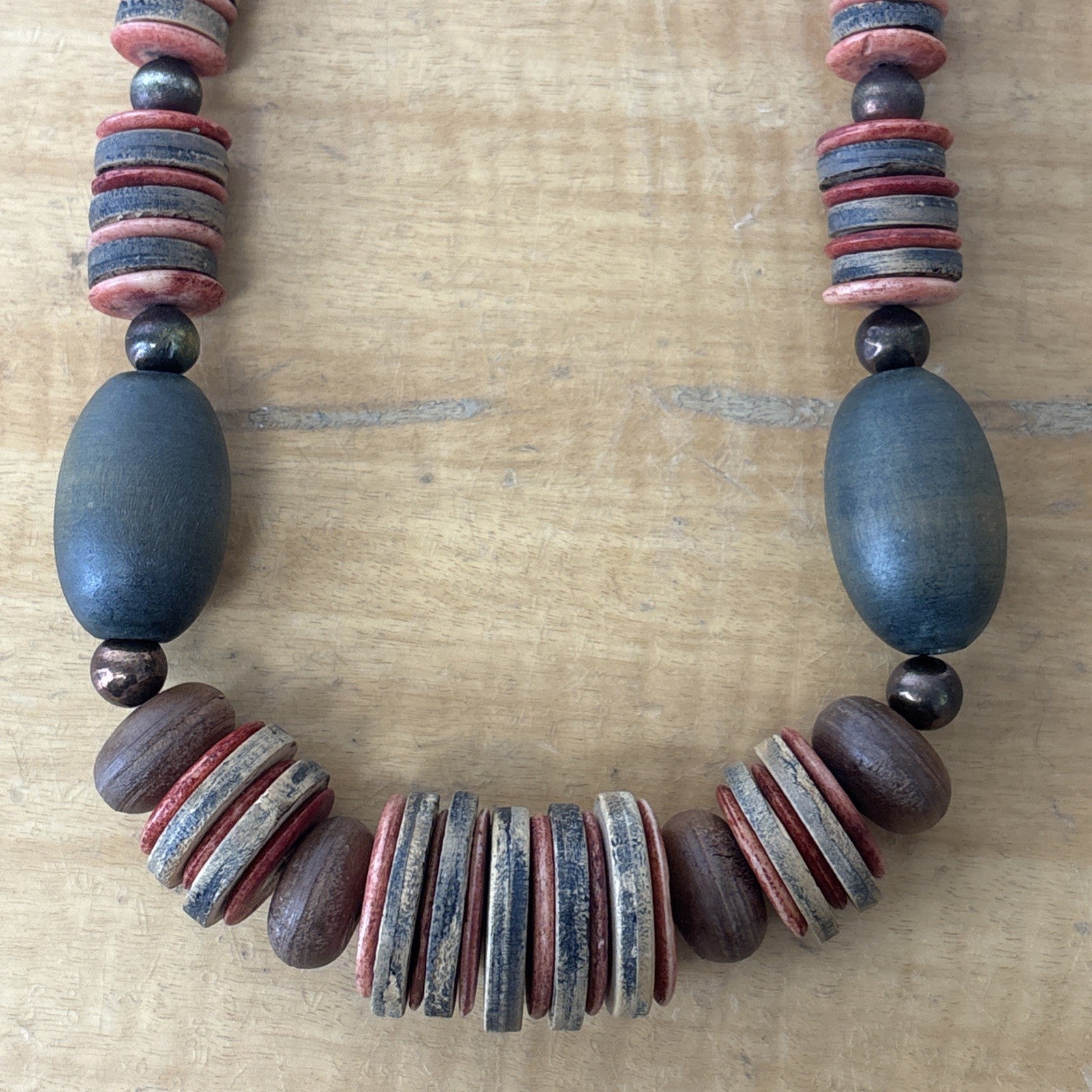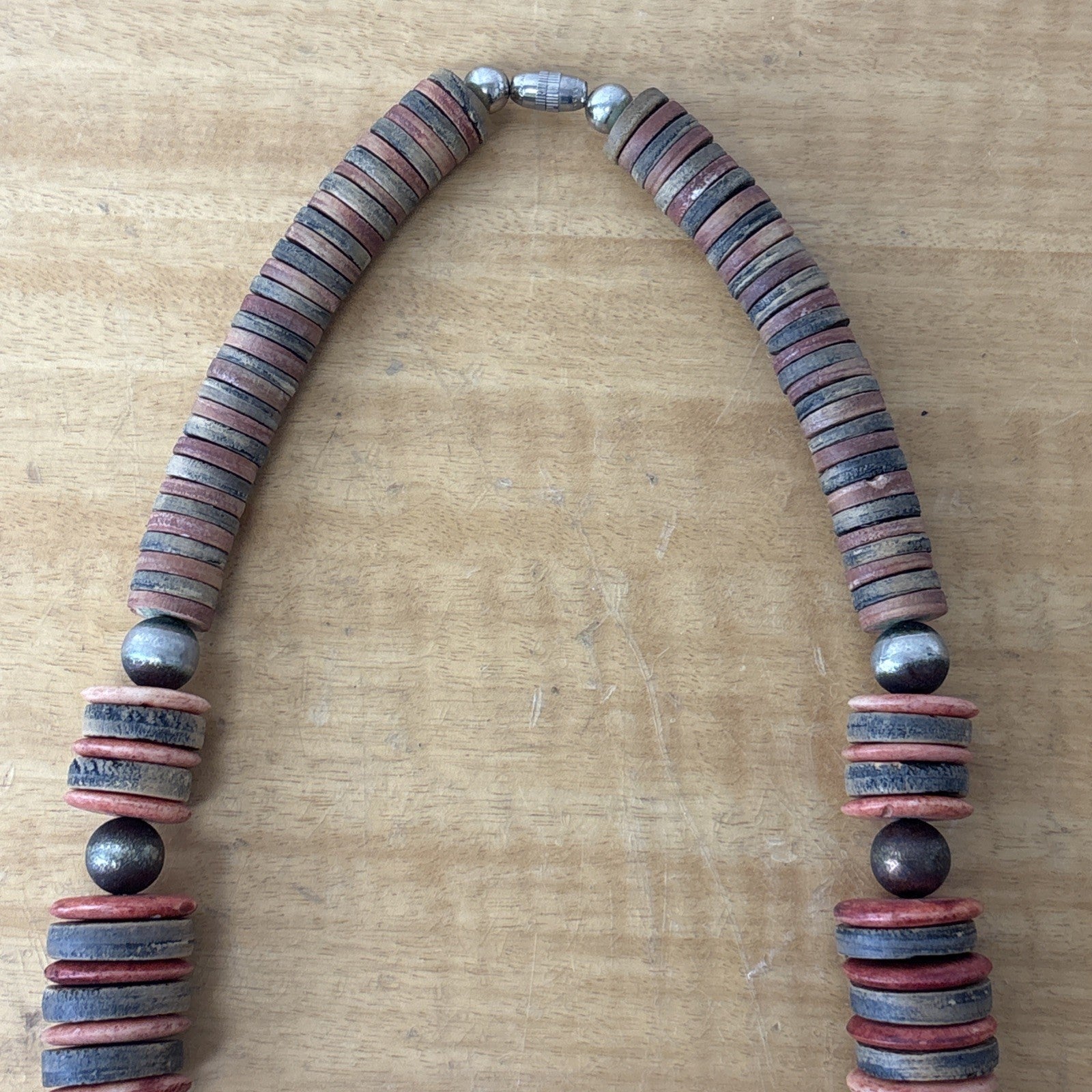 Vintage Wood Bead Necklace with Silver Beads African Inspired Red