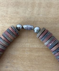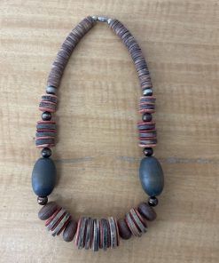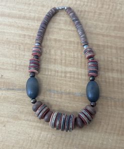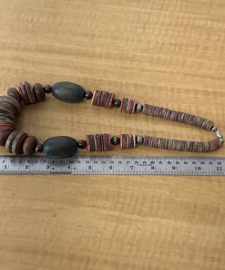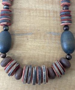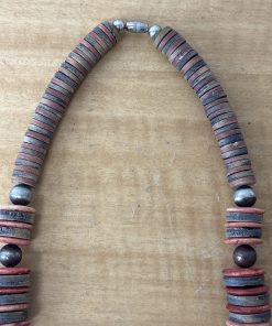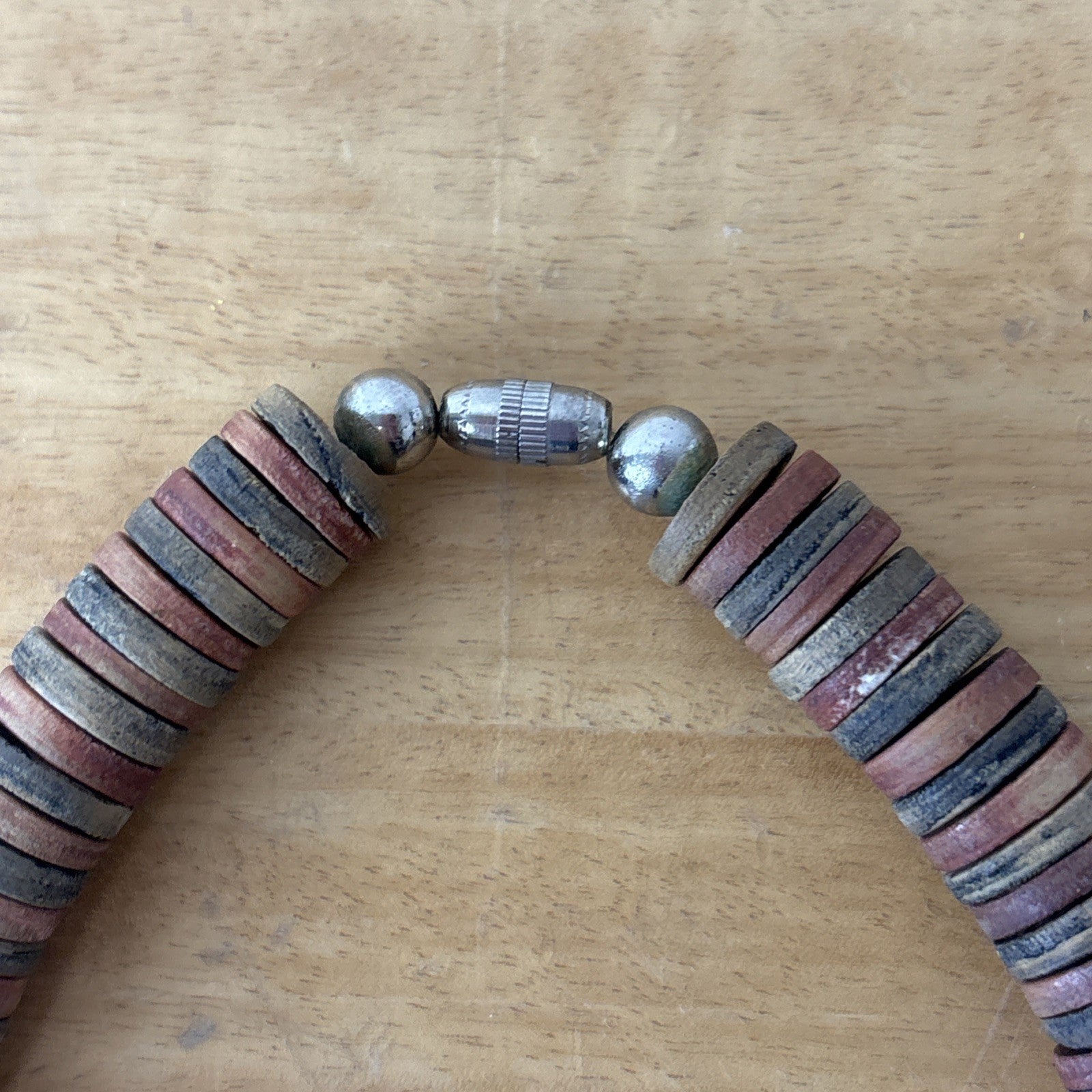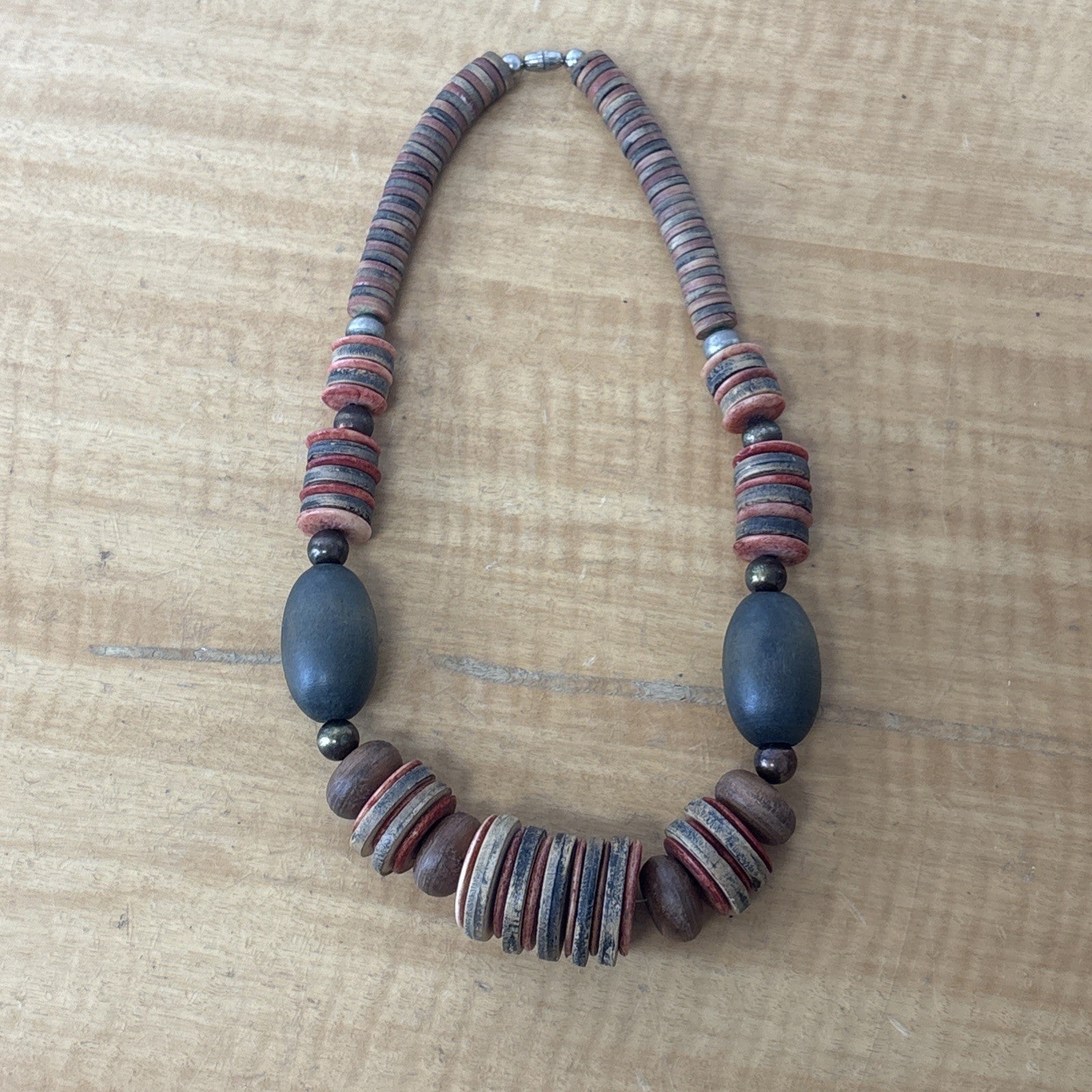 Vintage Wood Bead Necklace with Silver Beads African Inspired Red
