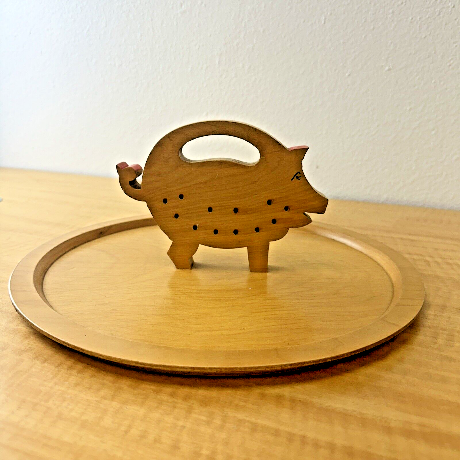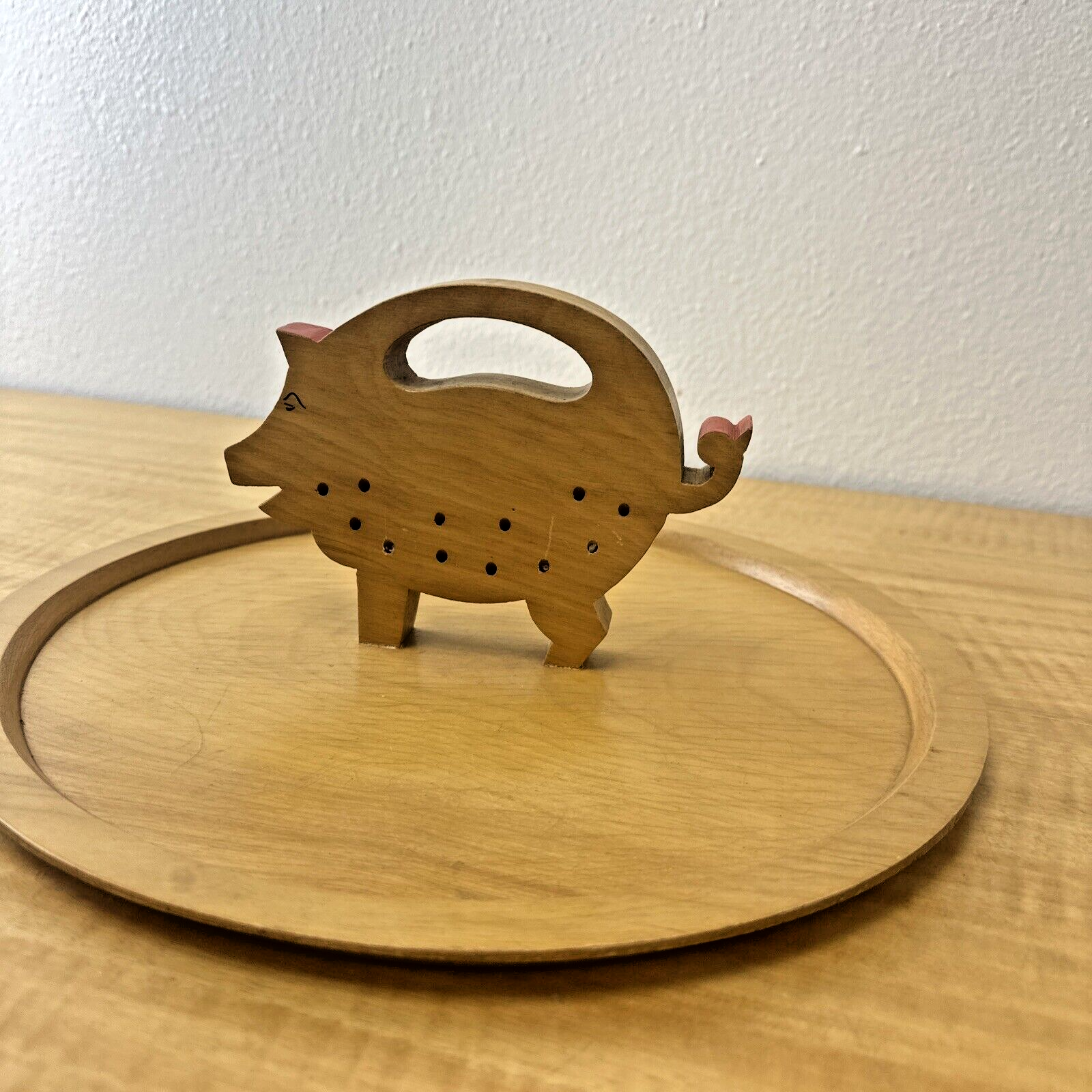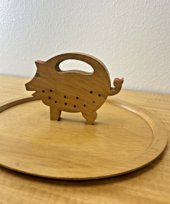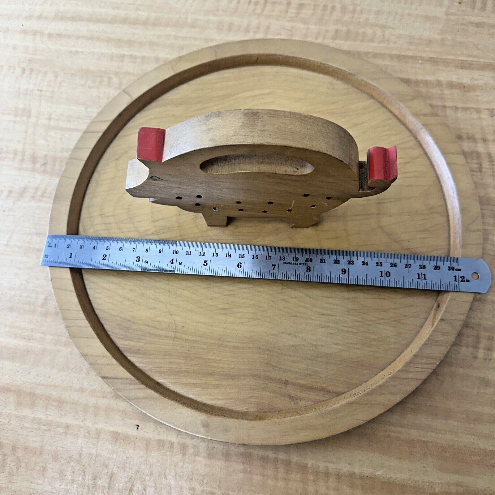 Vintage Wood Farmhouse Round 13″ Tidbit Tray with Center Pig Handle Folk Art