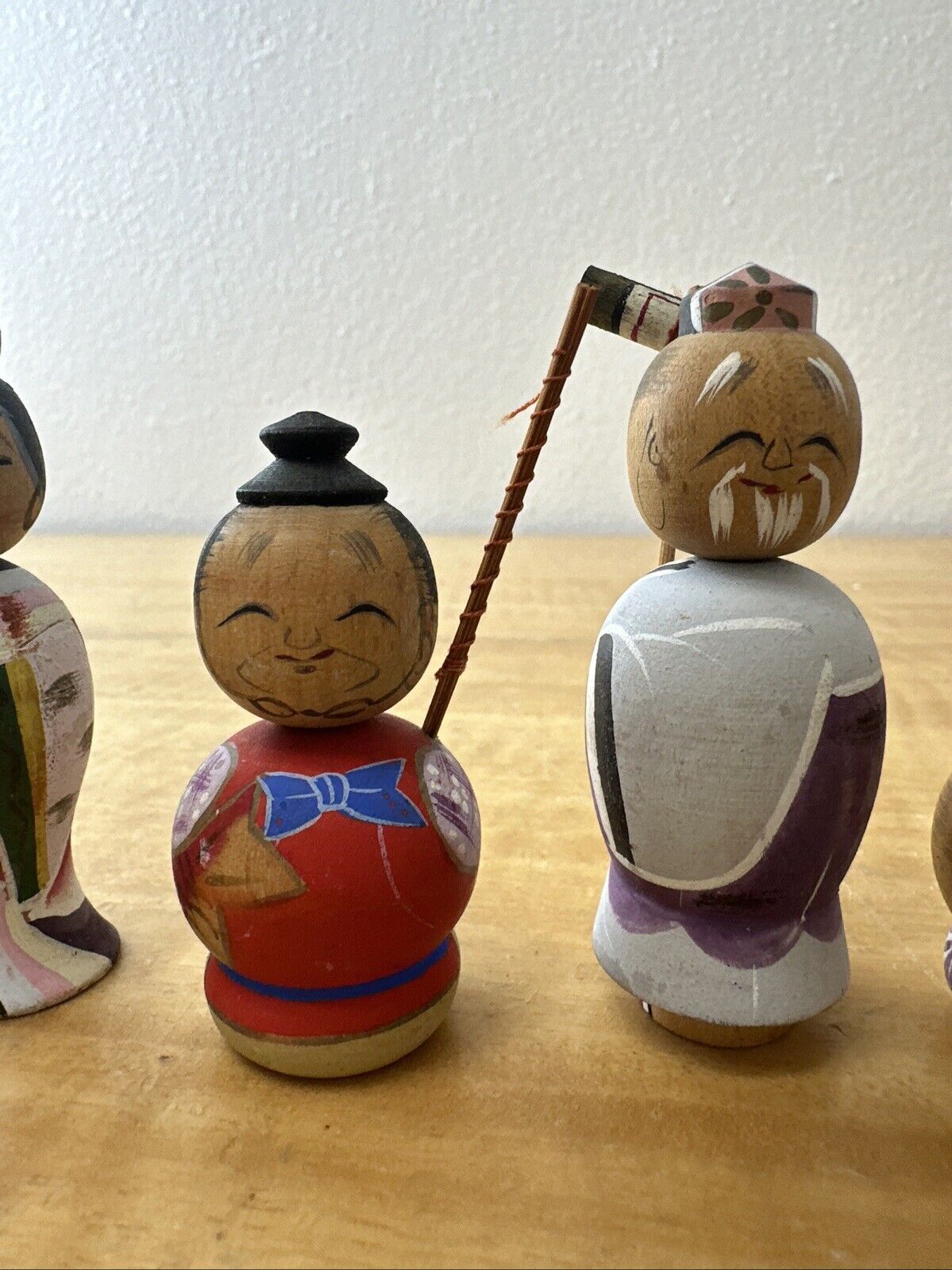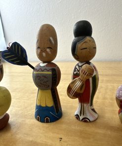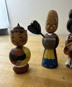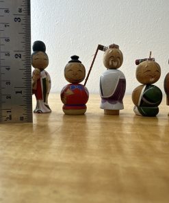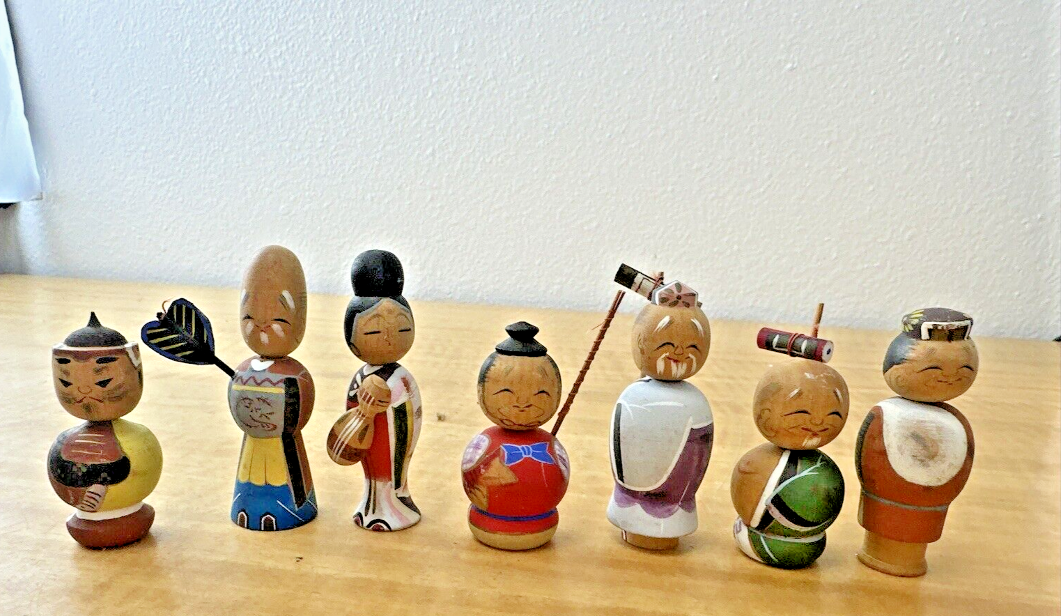 Vtg 7 LUCKY GODS Japanese Hand Painted Kokeshi Wooden Doll Nodders Bobbleheads