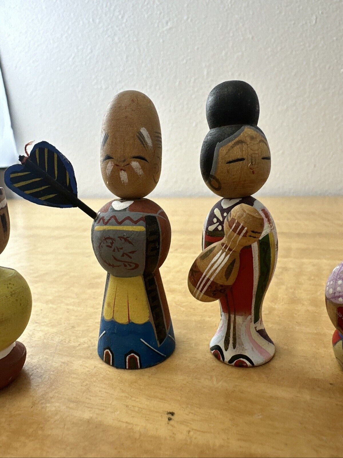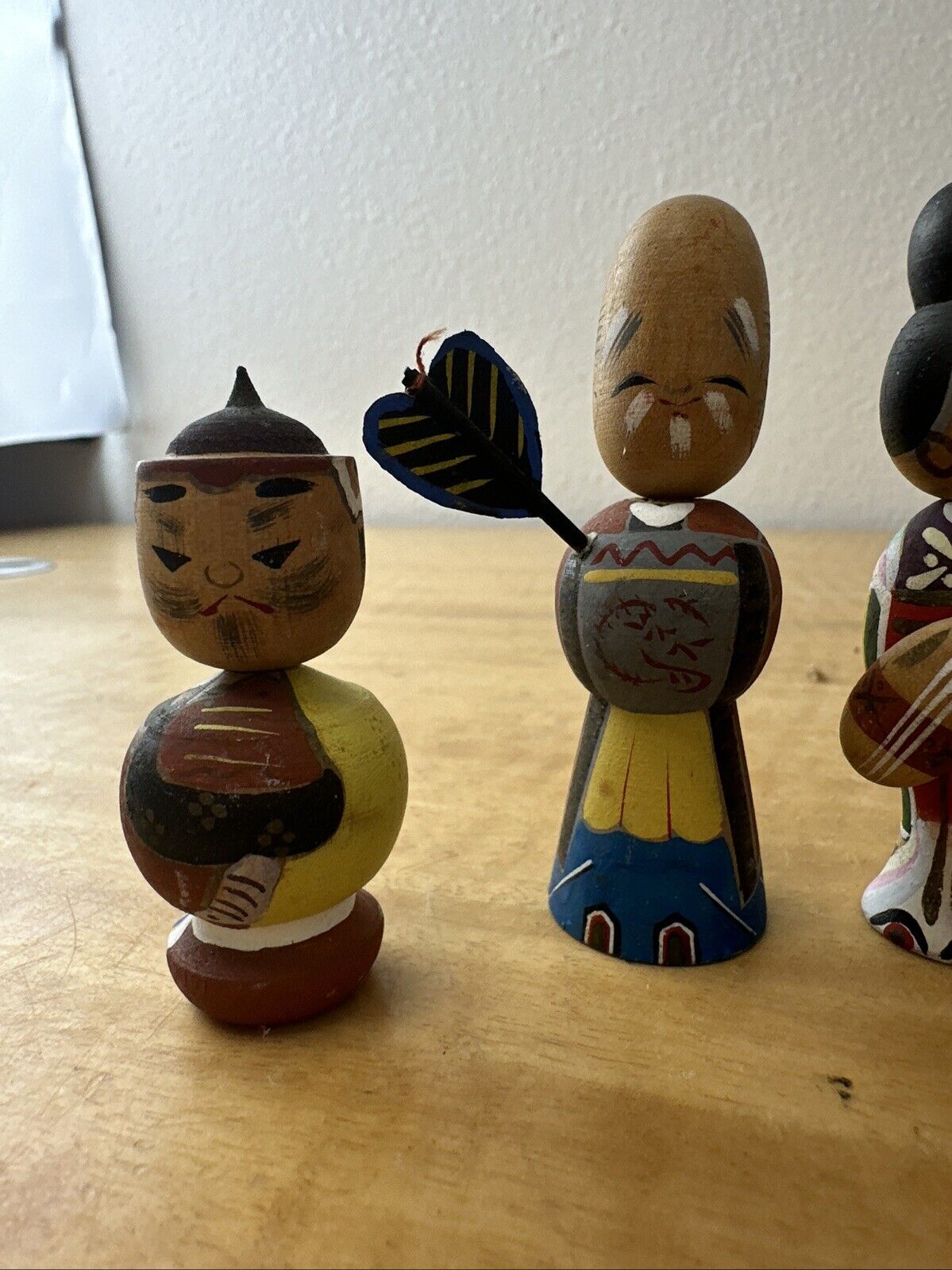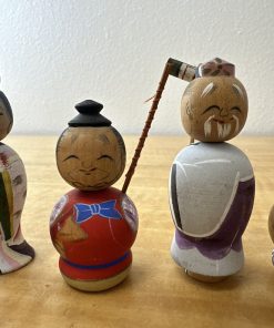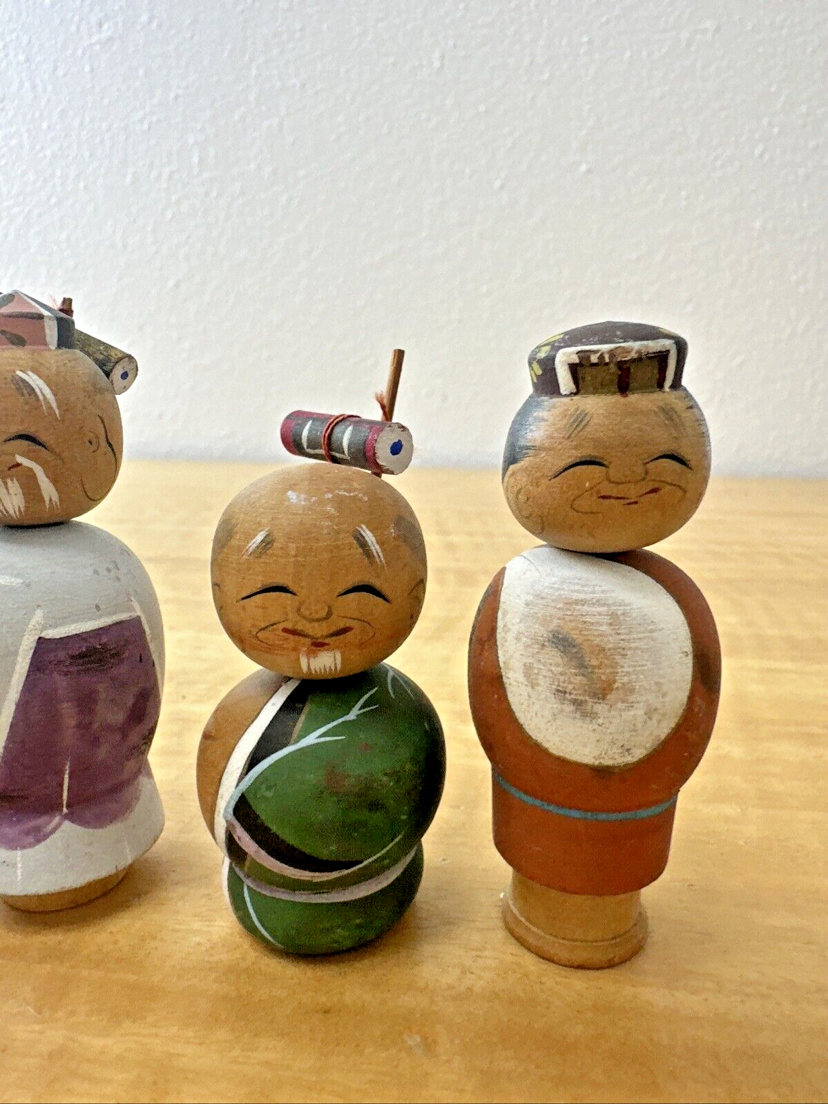 Vtg 7 LUCKY GODS Japanese Hand Painted Kokeshi Wooden Doll Nodders Bobbleheads