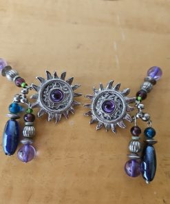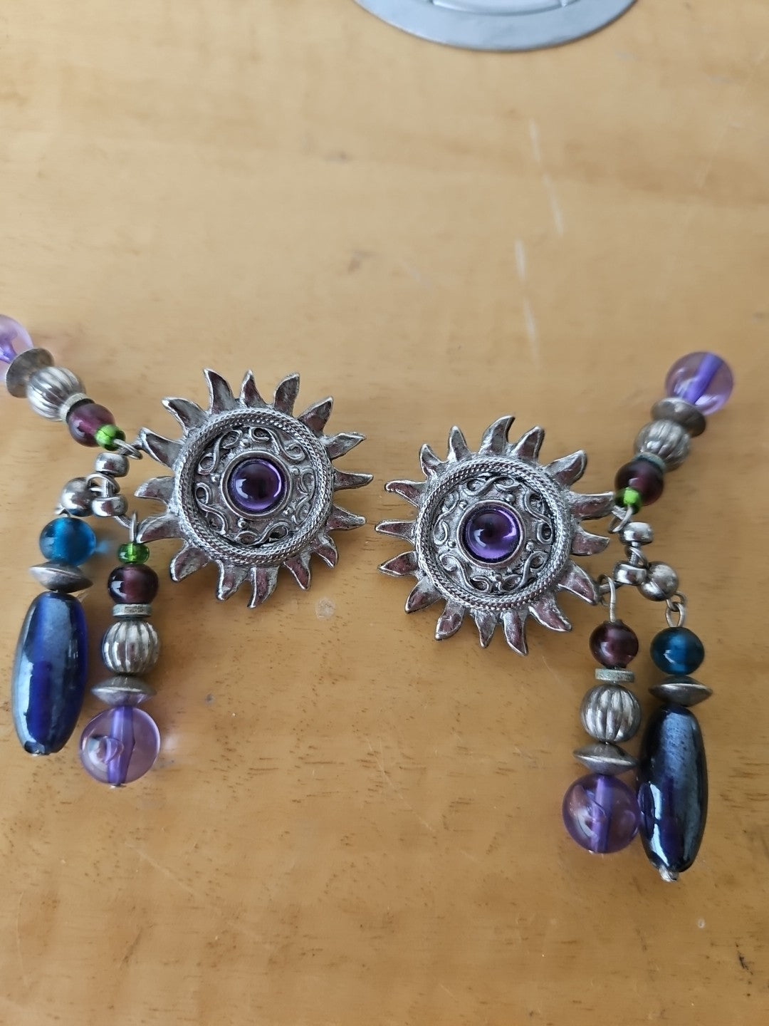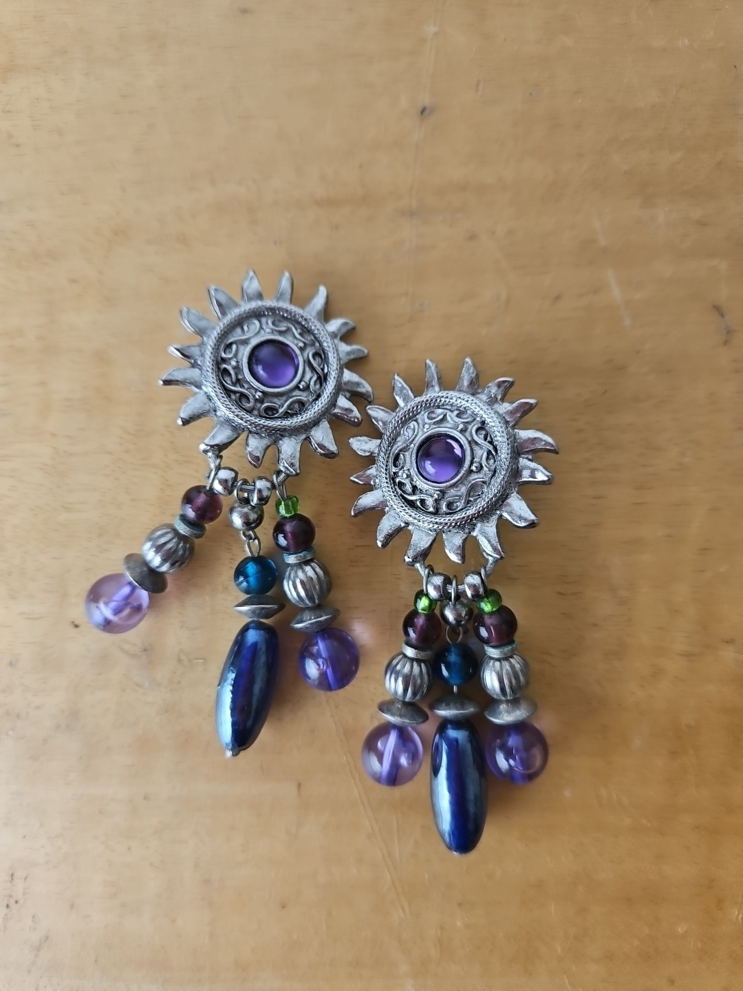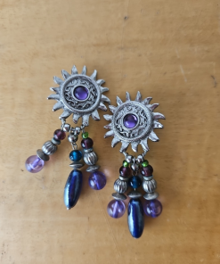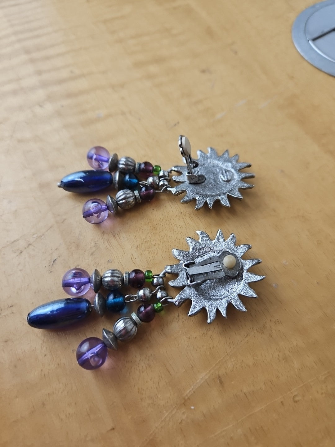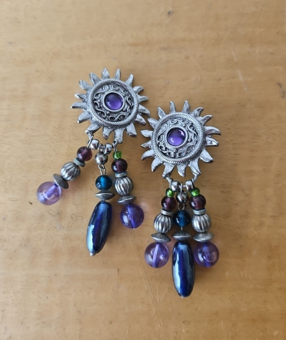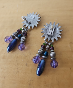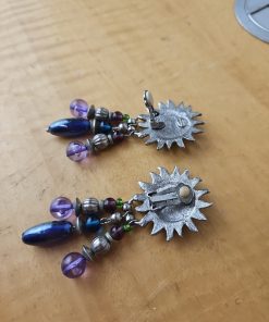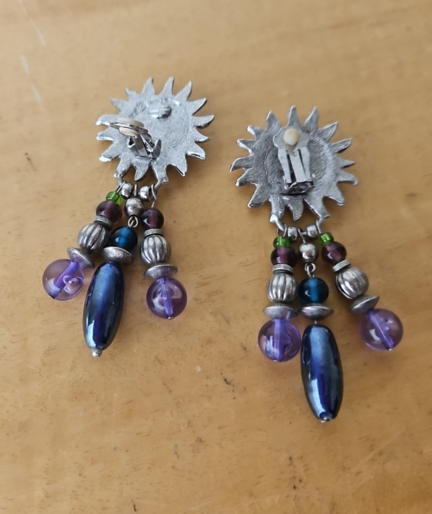 VTG clip on earrings, silver tone, purple tones beads, sun, art glass, dangle