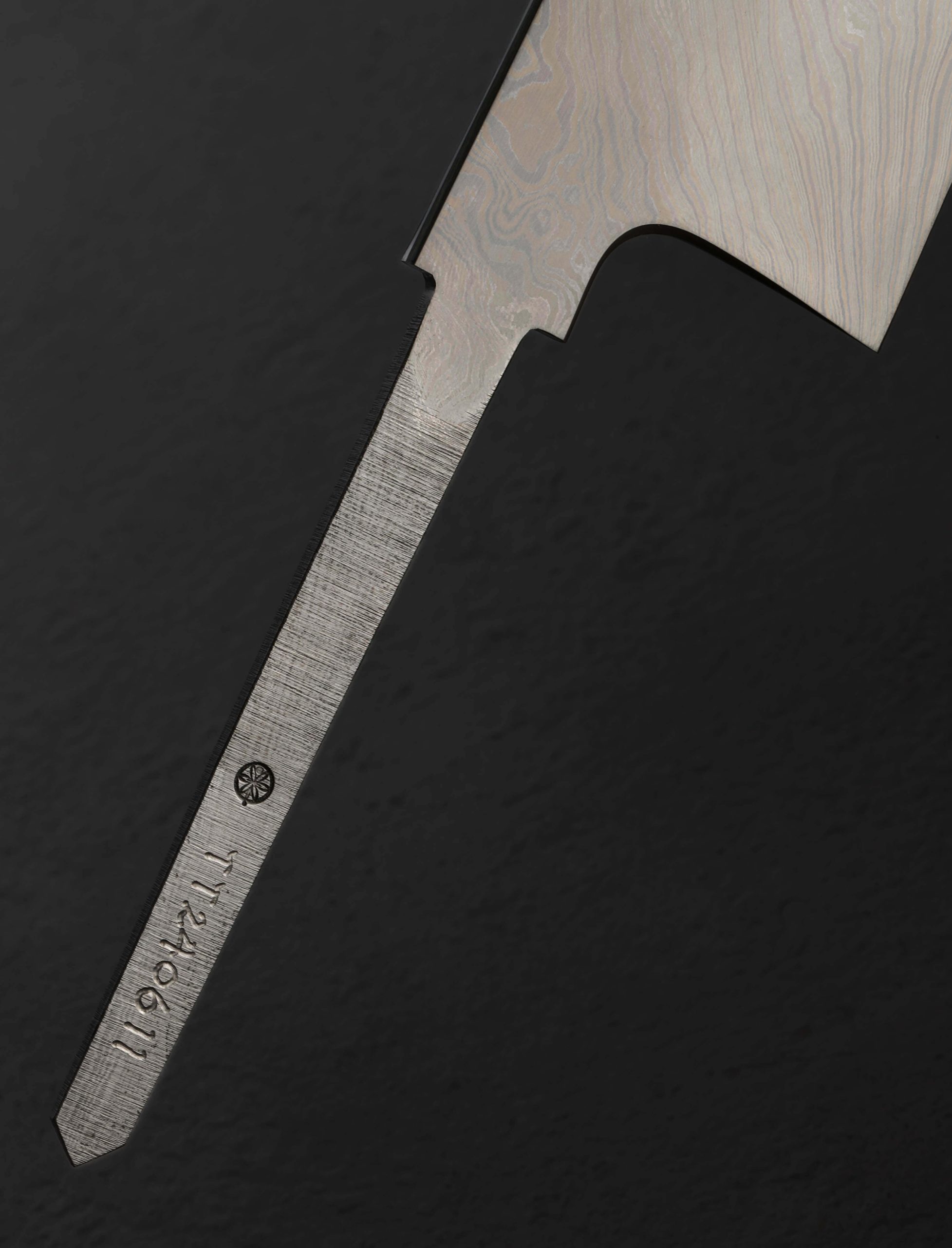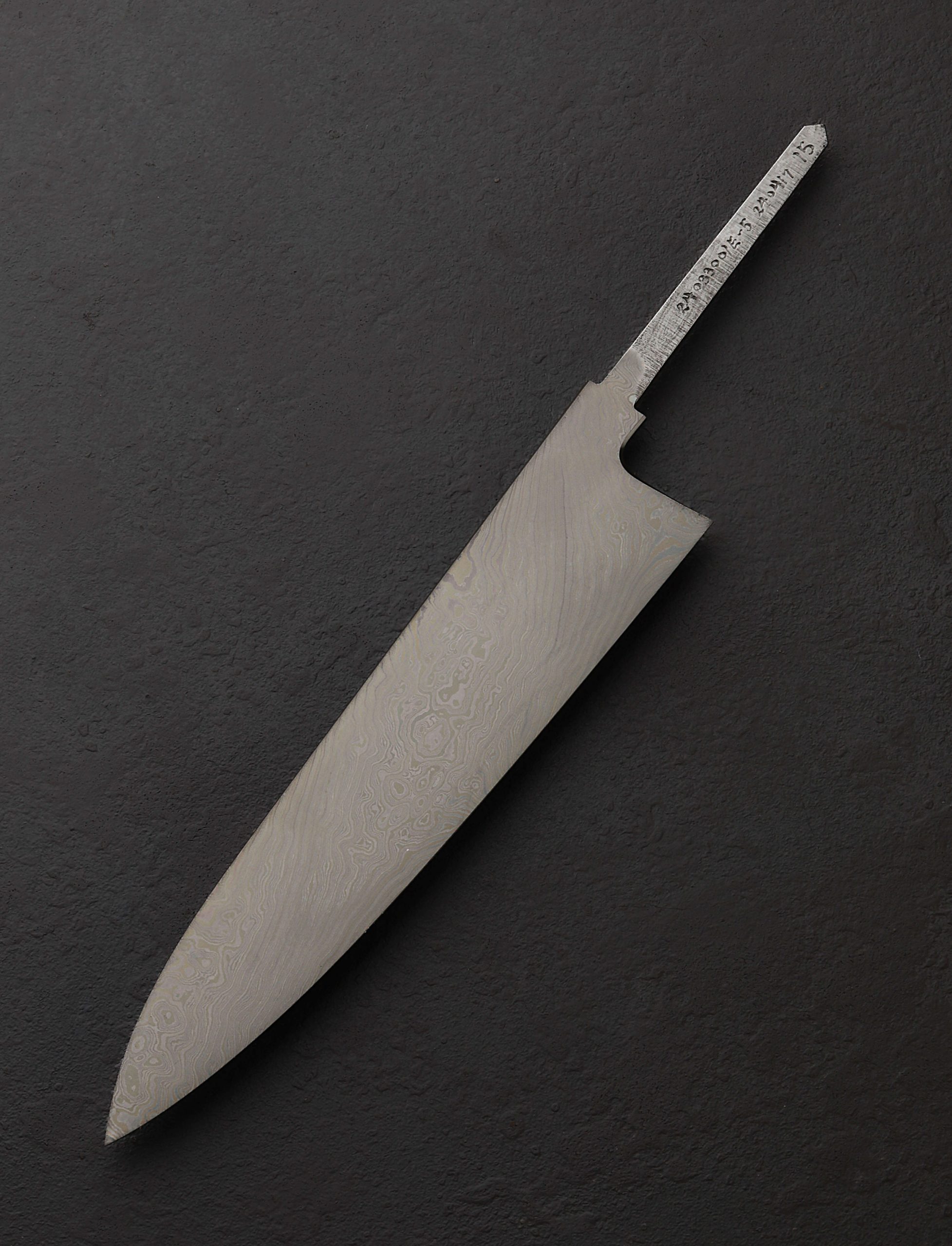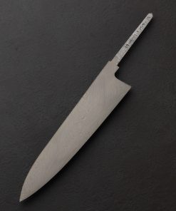 A special offering even by damascus artist Shoichi Hashimoto’s standards, this Tobikumo Collection blade is formed not from his more commonly seen two-alloy formula, but from four distinct alloys of Hitachi high-carbon steels: White No.1, Blue No. 1, White No.2, and Blue No.2. The name of the pattern, Tobikumo (跳雲), means ‘hopping clouds’ in Japanese, named so by Shoichi as the 180-layer pattern reminds him of clouds passing at regular intervals, as though hopping through the sky. At 240mm / 9.4″ long by 52mm high at the heel with meticulously shaped convex bevel geometry and a thin, hard, and razor-sharp ‘zero’ edge (no secondary bevel), cutting performance is this blade’s sole mission. A wide variety of cuts, no less, it will excel at: dynamic and thoughtfully shaped, the blade is stiff and sturdy at the rear where bevel convexity is most pronounced and the spine is thickest, perfect for tougher chopping tasks, complemented by the effects of the spine’s full-distal taper which sees it slim steadily forward until an extremely fine tip is reached, lending the forward section of the blade to precision work and exacting slices. The overall profile is balanced and versatile, with a beautifully polished and etched finish. Facets contour the spine and choil for comfort in the pinch grip. The final polishing and edge sharpening is performed by the Shoichi’s colleague, edge specialist Mr. Takahashi. A blade-only offering (sold without handle), the tang has been marked with the damascus billet number, the date of the blade’s quench, its serial number, and on the opposite side, the first polishing completion date.