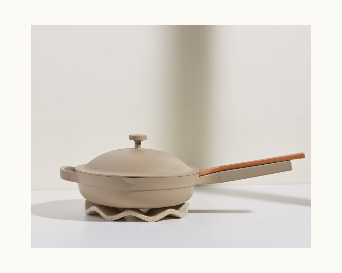 Our beautiful Wave Trivet was designed and handmade by SIN, a Brooklyn-based ceramics home goods brand founded by Virginia Sin, as a show-stopping protective base for your Always Pan and Perfect Pot. Each natural, unglazed, stoneware trivet is pressed, hand-finished, and hand-stamped by artisans in an organic wave pattern. It’s a stunning sculptural statement that transforms any table.