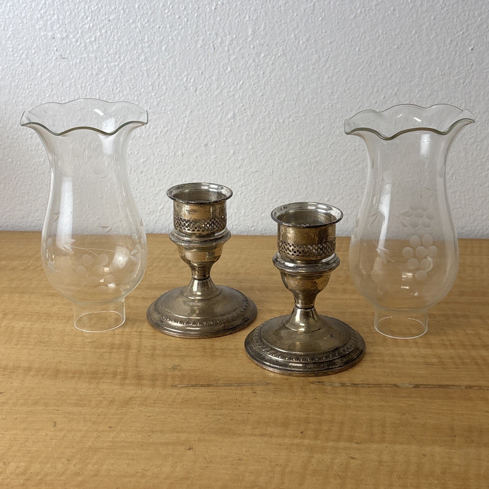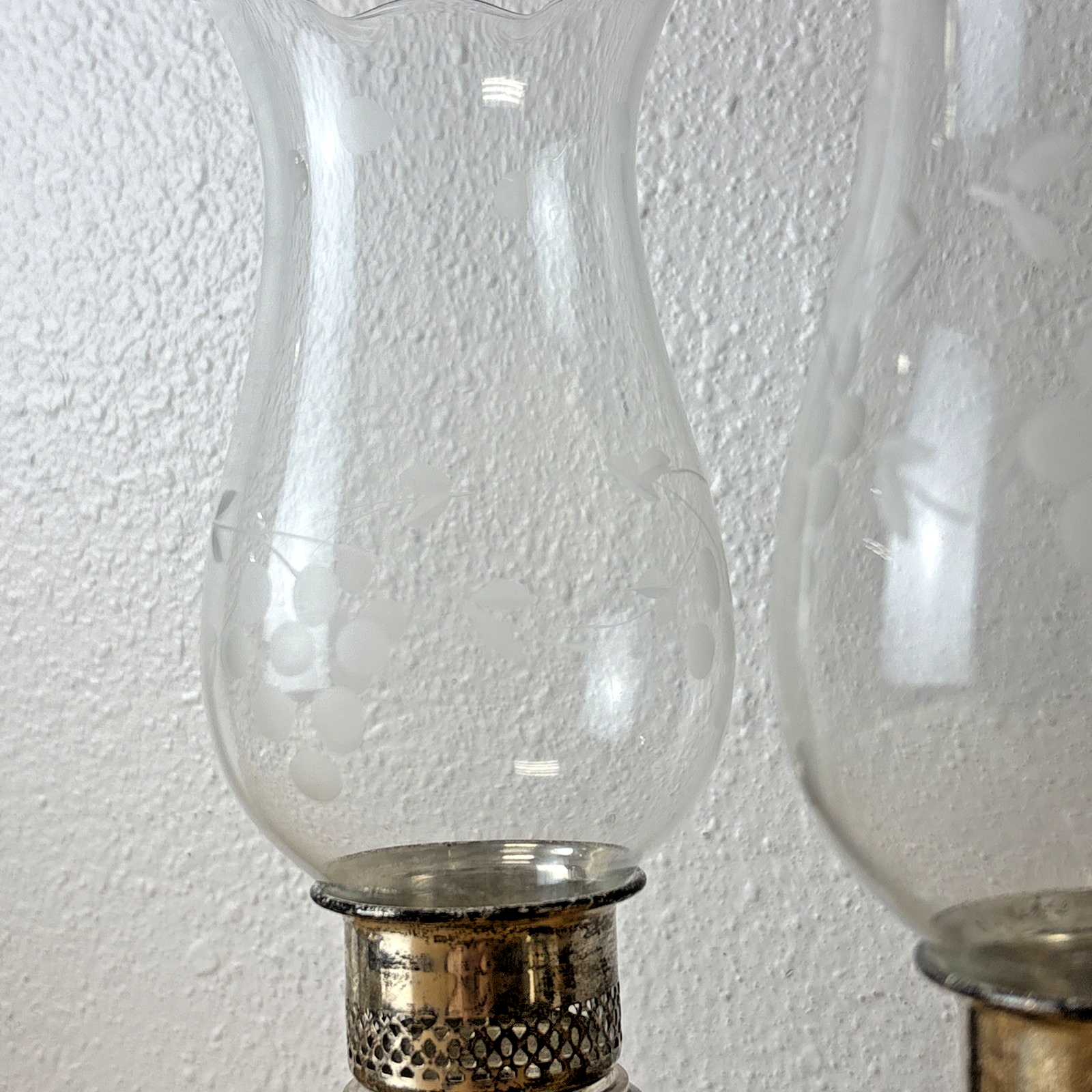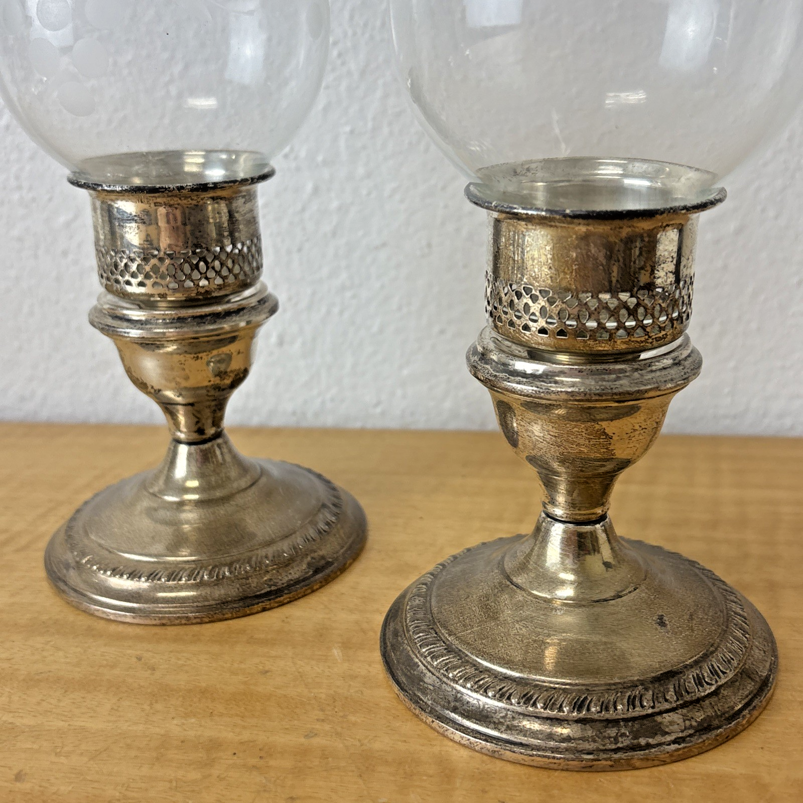 Weighted Sterling Candle Holder Etched Hurricane Glass Set of 2