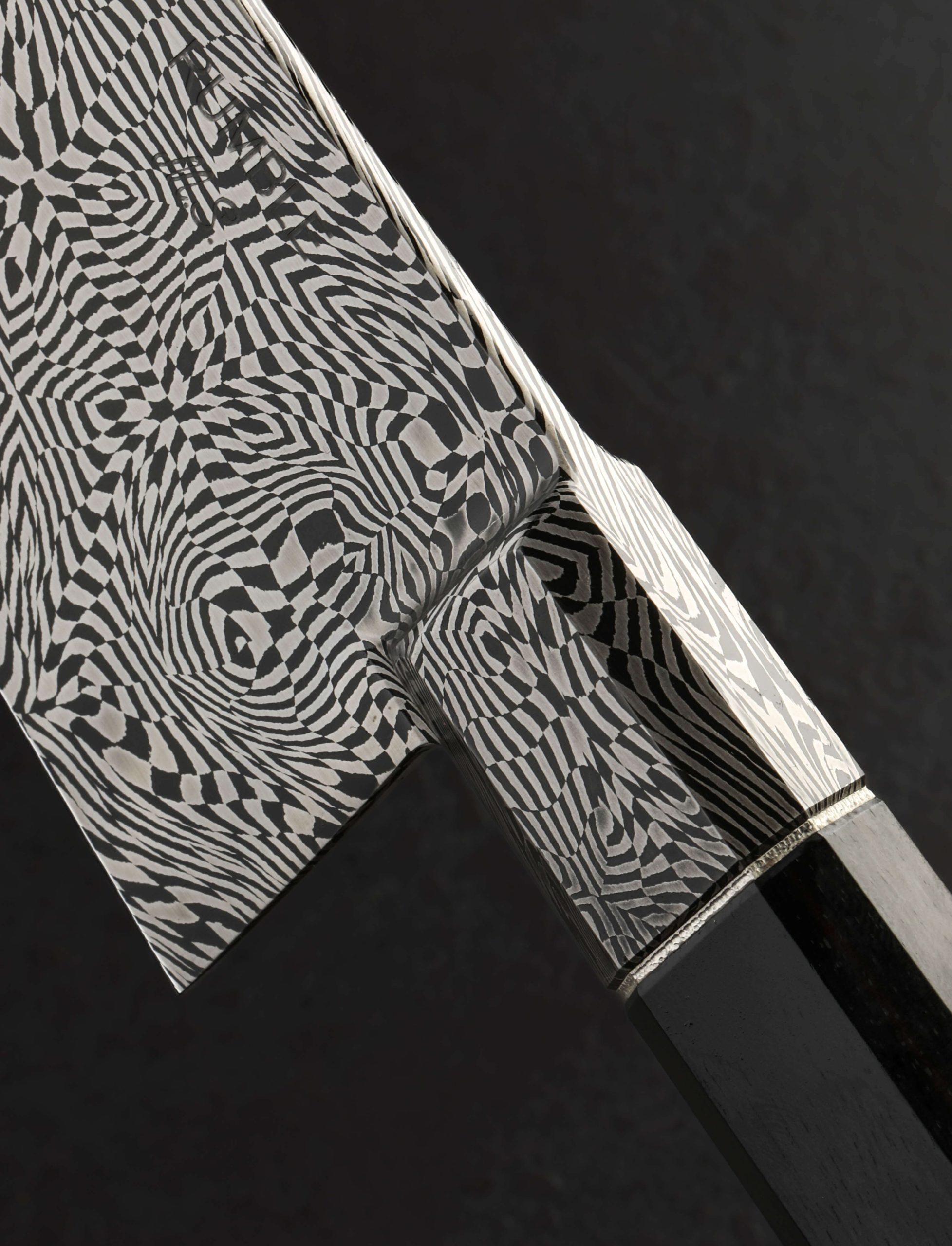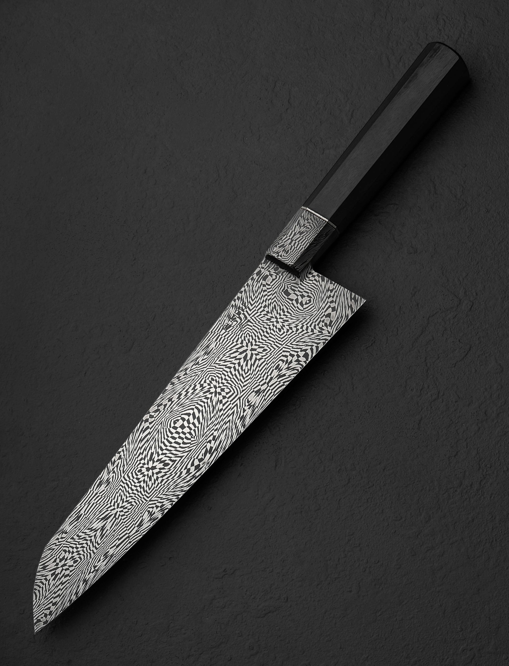 As though meandering through Wonderland beside Alice, a mosaic of steel, its carbon, iron, nickel and other ingredients bulging and retreating, flowing and halting, upside down and back again, forms blade and bolster of this extraordinary culinary tool by Australia’s Jackson Rumble. From the gently rounded blade spine which tapers steadily from nearly 5mm out of the sculpted integral bolster to barely 1mm an inch from the tip, downward through superbly shaped convex bevels to a thin, hard, razor-sharp edge, and from the 54mm-tall heel to the slim, needle-like tip, the ebb and flow of the homemade Wonderland Damascus stimulates both eye and mind with psychedelic grace. Jackson, a talented artist with a Mastersmith rating from the American Bladesmith Society, leaves no stone unturned, from the bevel’s stunning hand-sanded satin finish, to the textured, heirloom-fit nickel silver handle spacer, to the shaping of the octagonal ebony grip. Balancing at the point that bolster becomes blade bevel, this one-of-a-kind chef’s knife is natural, weighted, and powerful in the hand, designed and crafted for ever day meal prep at home and in the professional kitchen. Form and function at its finest.