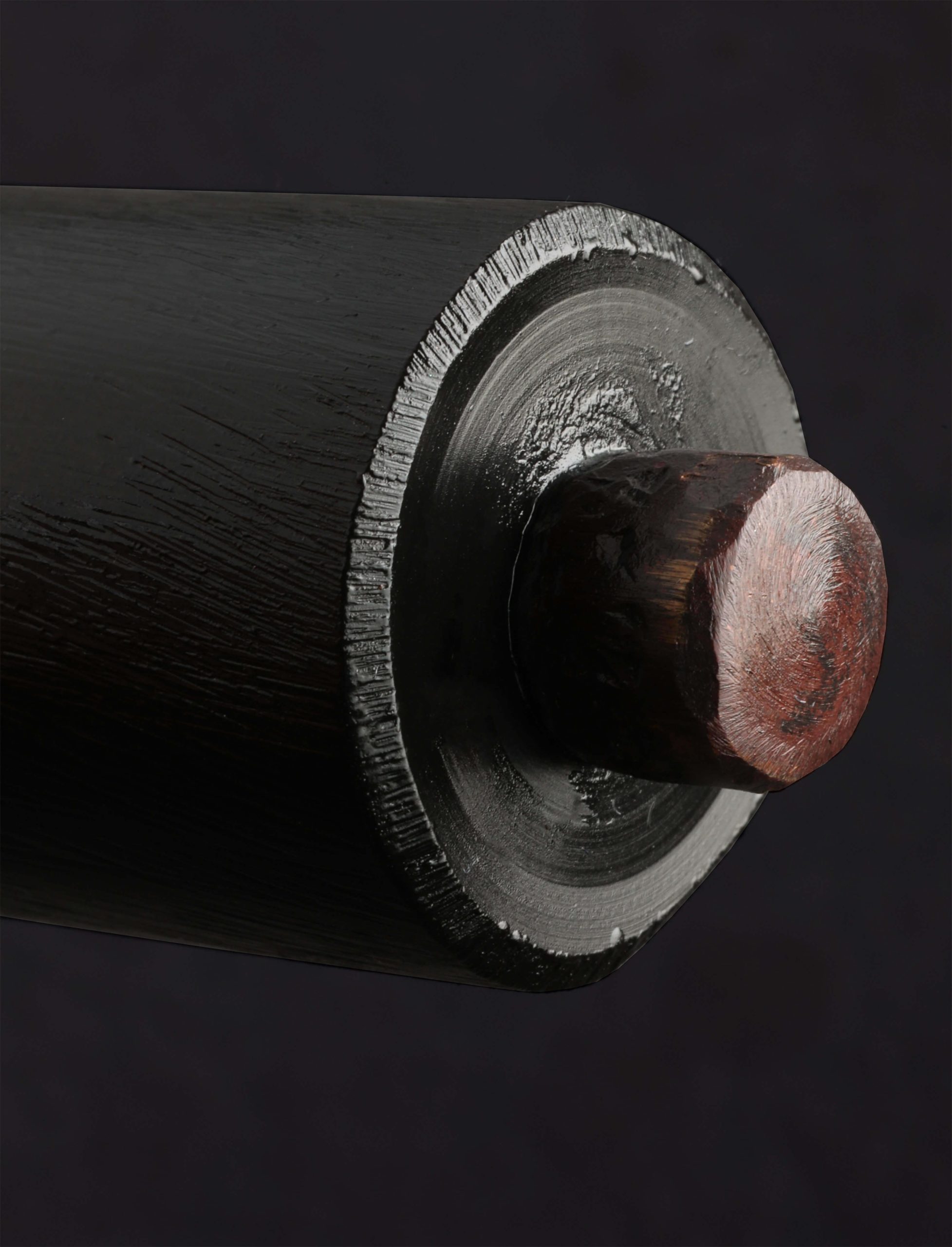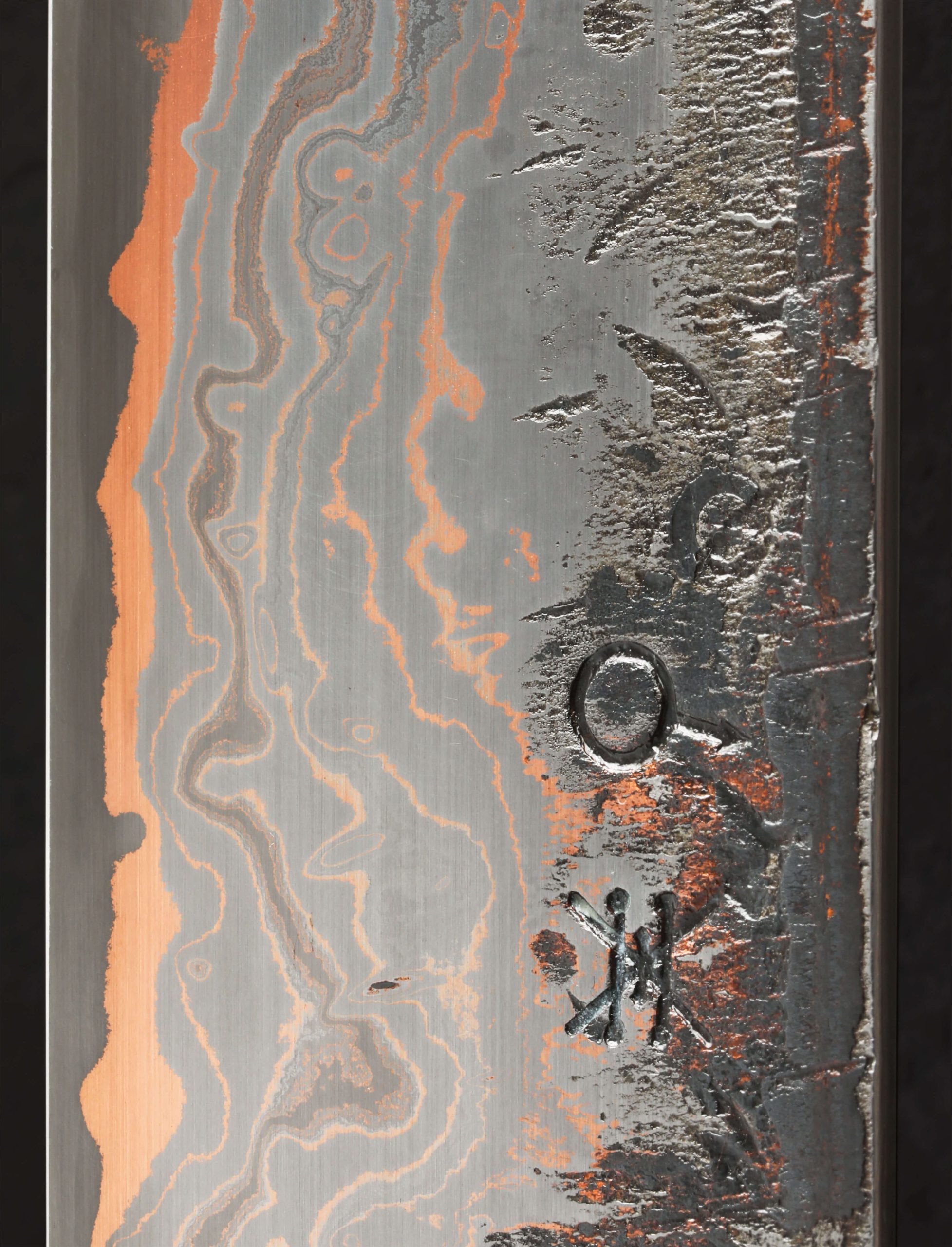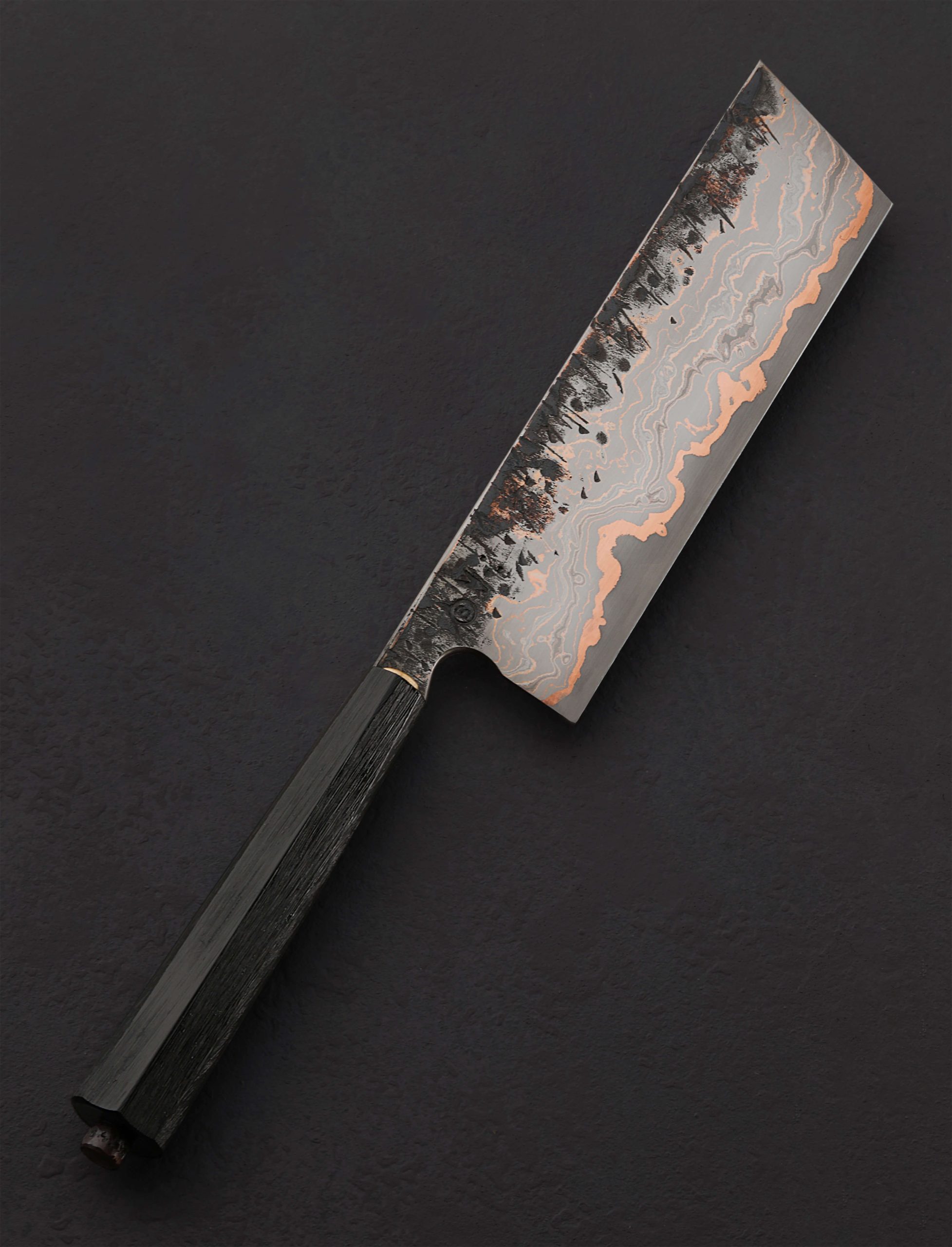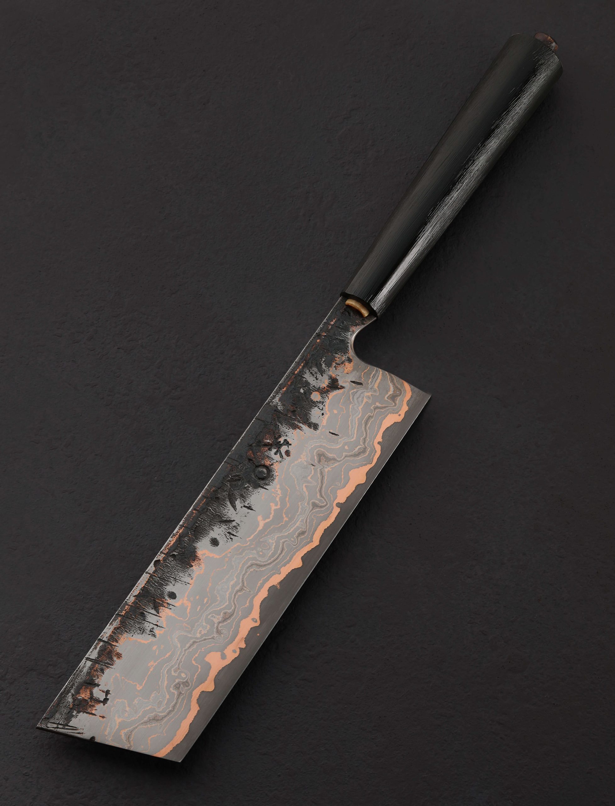 Unabashed cutting power and a head-turning aesthetic that will keep guests talking long after the meal is served position this striking, robust nakiri by Jeramie ‘Jezz’ Heywood squarely at the intersection of art and tool. A long-time maker and steel aficionado, Jezz makes a variety of specialty blade steel formulas at his shop in Australia for both his own knives and those of other artisans, and even the handle of this creation is made in-house from a composite consisting of recycled plastics. But, back to the blade. Alternating layers of iron and steel are interspersed with veins of copper that extend from the rounded, polished spine (a close inspection of which displays a cross-section view of the many layers) down to just above the edge, forming the dynamic and beautiful outside cladding of the 202mm / 8″ long by 59mm tall blade. Polished and etched, every nuance in the materials’ grain is on show throughout. Forming the final cutting edge is 52100 high-carbon steel, thin, hard, and sharp, the culmination of convex bevels that prize strength and toughness, shaped superbly for all manner of meal prep including the most demanding cuts while easily handling the more delicate slices at the same time. For grip, secured at the front where blade tang enters and disappears into the homemade composite handle is a collar of pine, the composite then tapering out subtly toward the rear, where a forged copper final completes the build.
